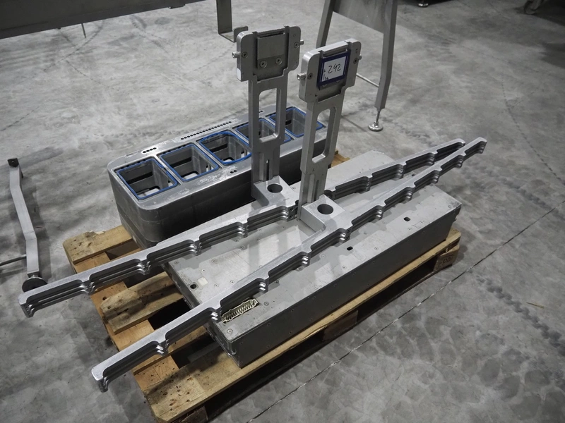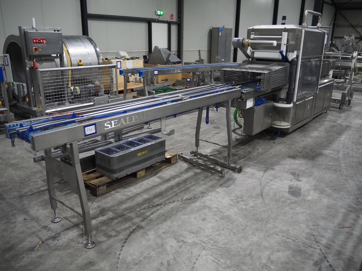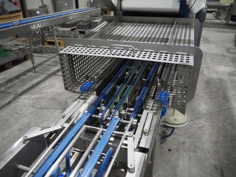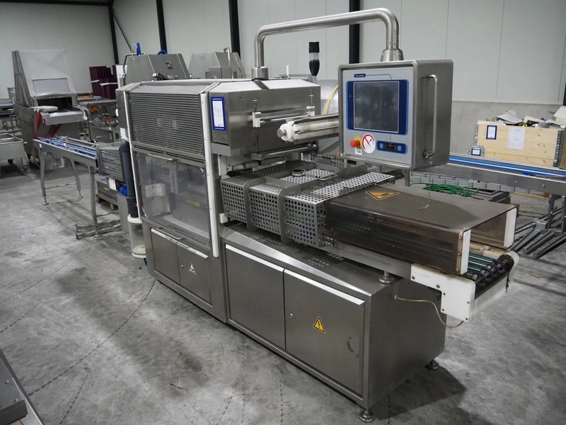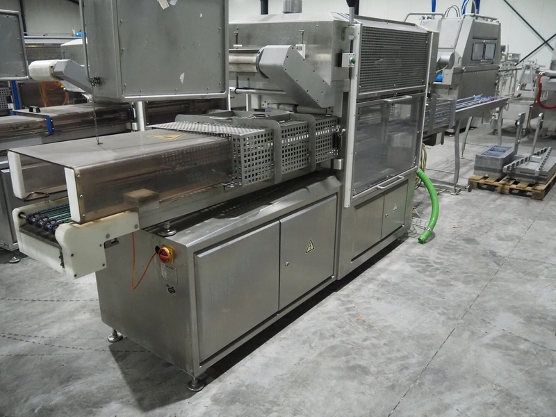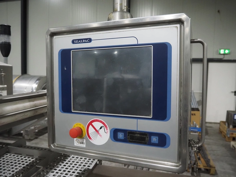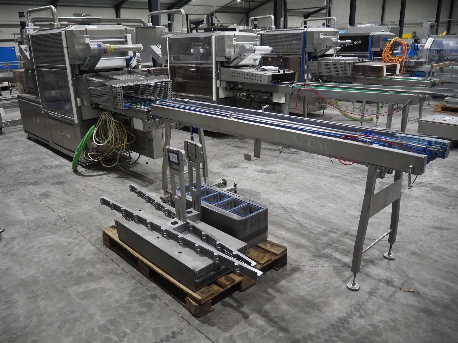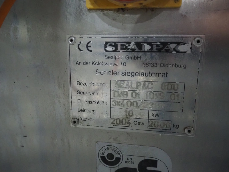Sealpac traysealer, model: Sealpac 800, serial number: TVG 01109501, year of construction: 2004, 400/230 V, 3 Ph, 10 kW, weight: 2000 kg, dye: (6x) 258 mm x 70 mm, plastic belt, belt width: 360 mm, total dimensions: 6800 mm x 900 mm x 2100 mm. Including s/s trolley for dye's, dimensions: 1400 mm x 1000 mm x 1350 mm, pallet with dye, dye: (5x) 175 mm x 128 mm, total dimensions: 1200 mm x 800 mm x 400 mm.