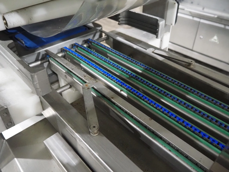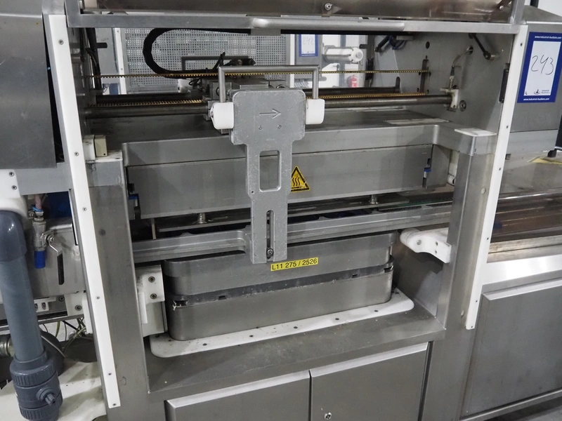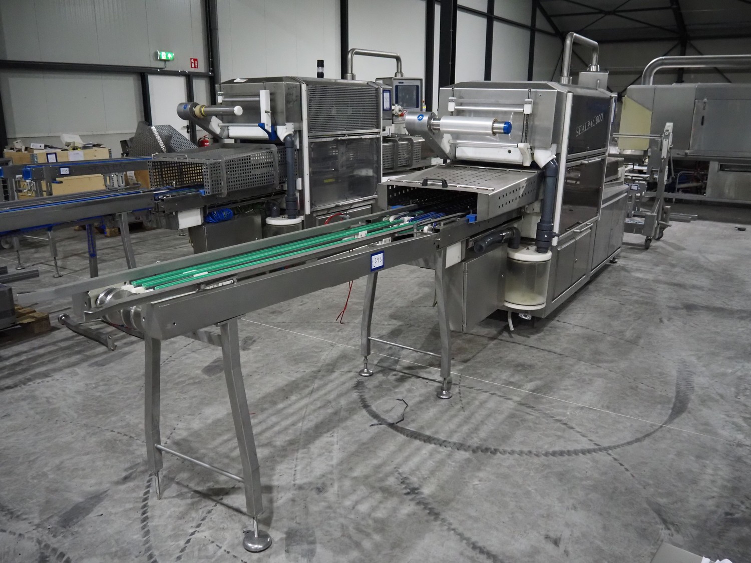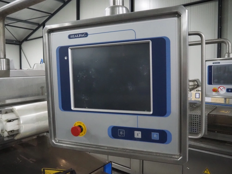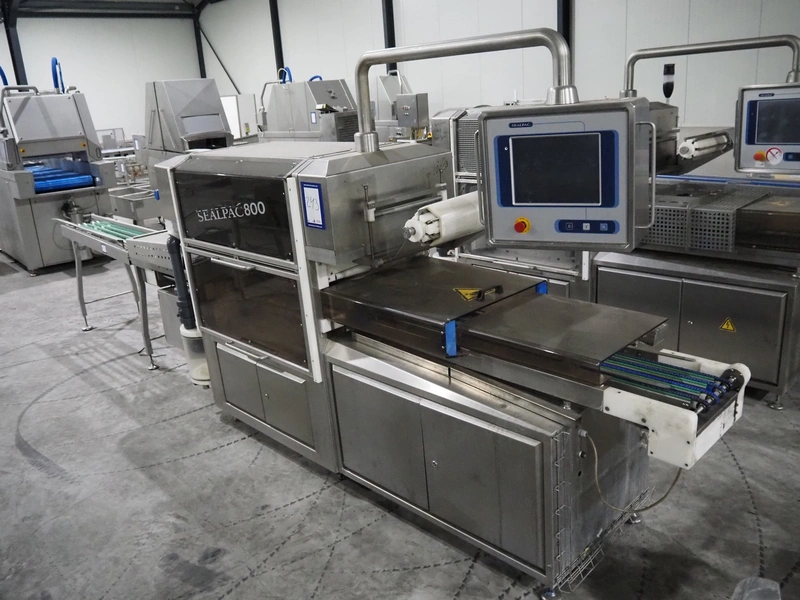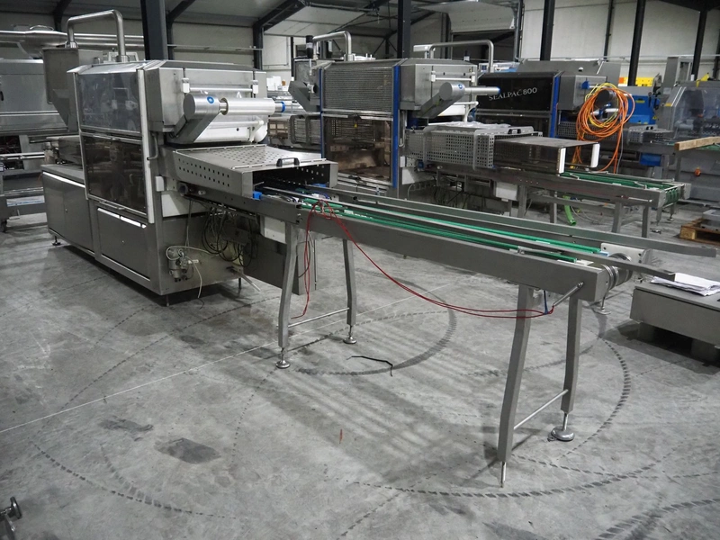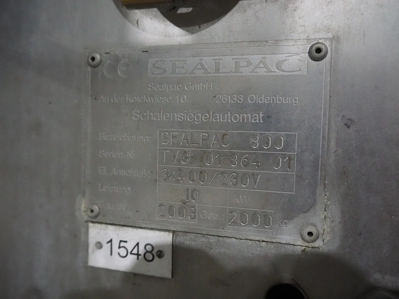 Sealpac traysealer, model: Sealpac 800, serial number: TVG 018640, year of construction: 2003, 400/230 V, 3 Ph, 10 kW, weight: 2000 kg, film width: 325 mm, dye: (4x) 260 mm x 158 mm, total dimensions: 6000 mm x 900 mm x 2100 mm. Including s/s trolley for dye's, dye: (4x) 225 mm x 178 mm, (5x) 230 mm x 168 mm, total dimensions: 1200 mm x 800 mm x 500 mm.