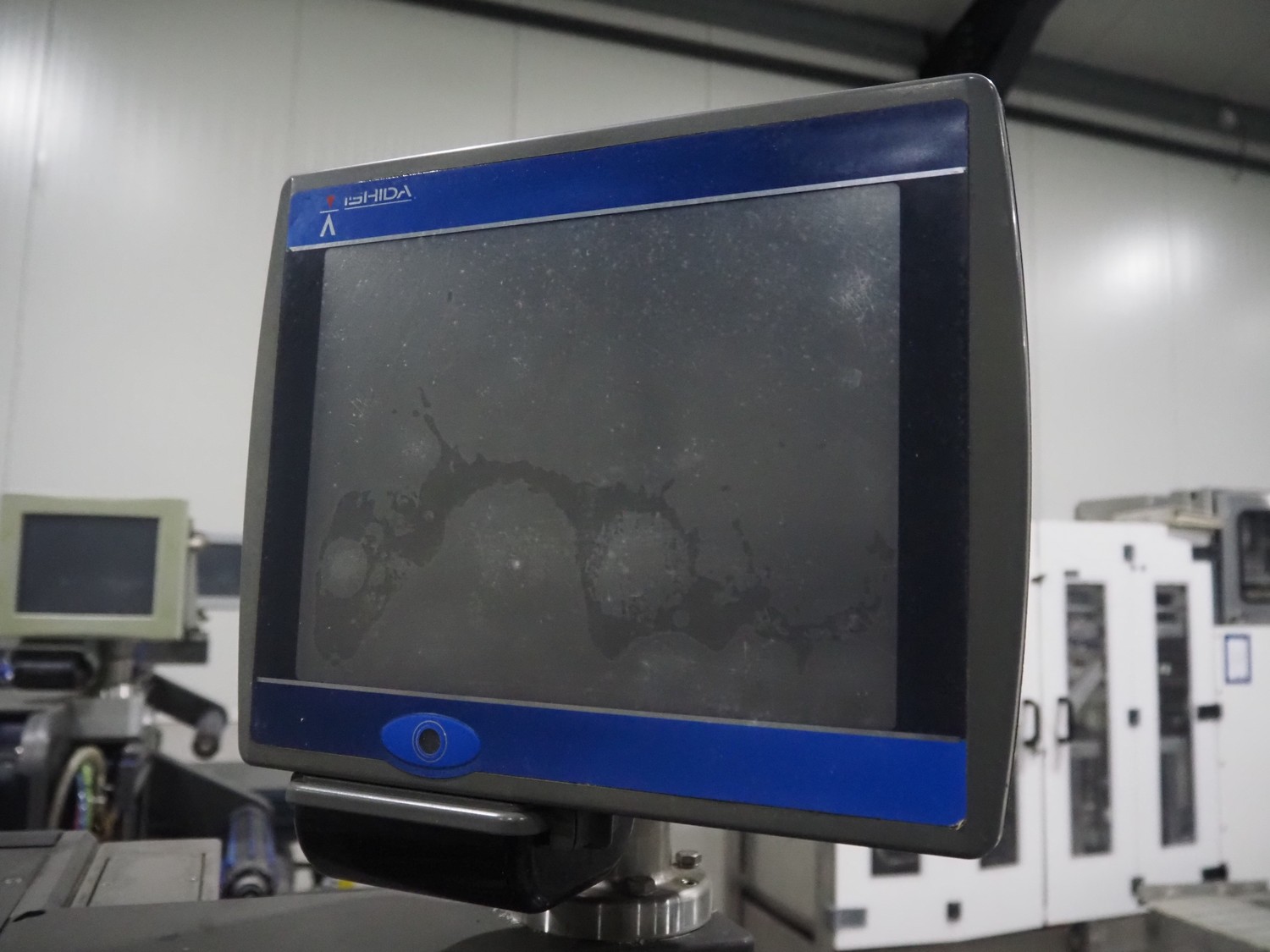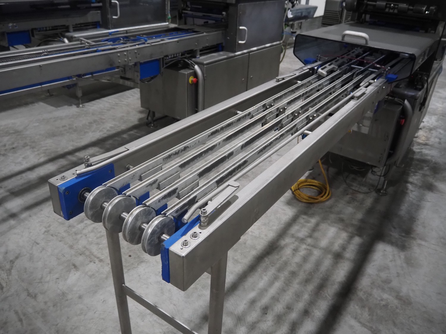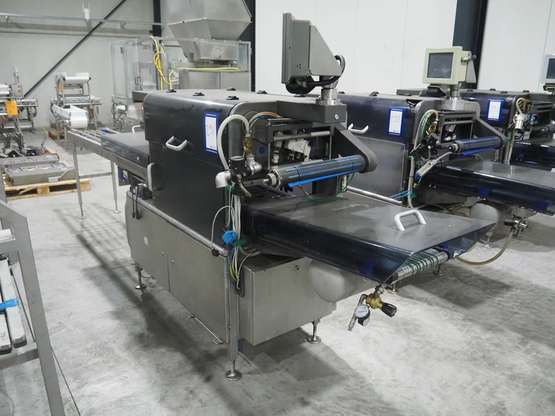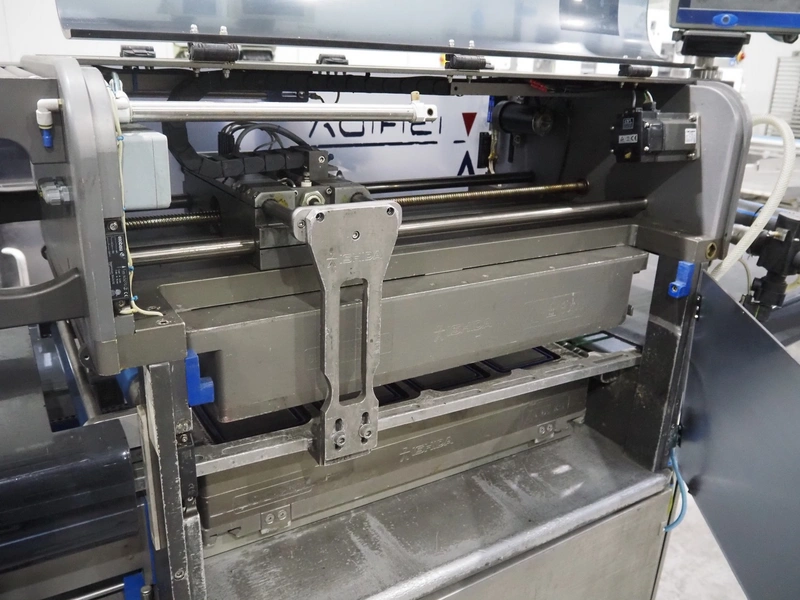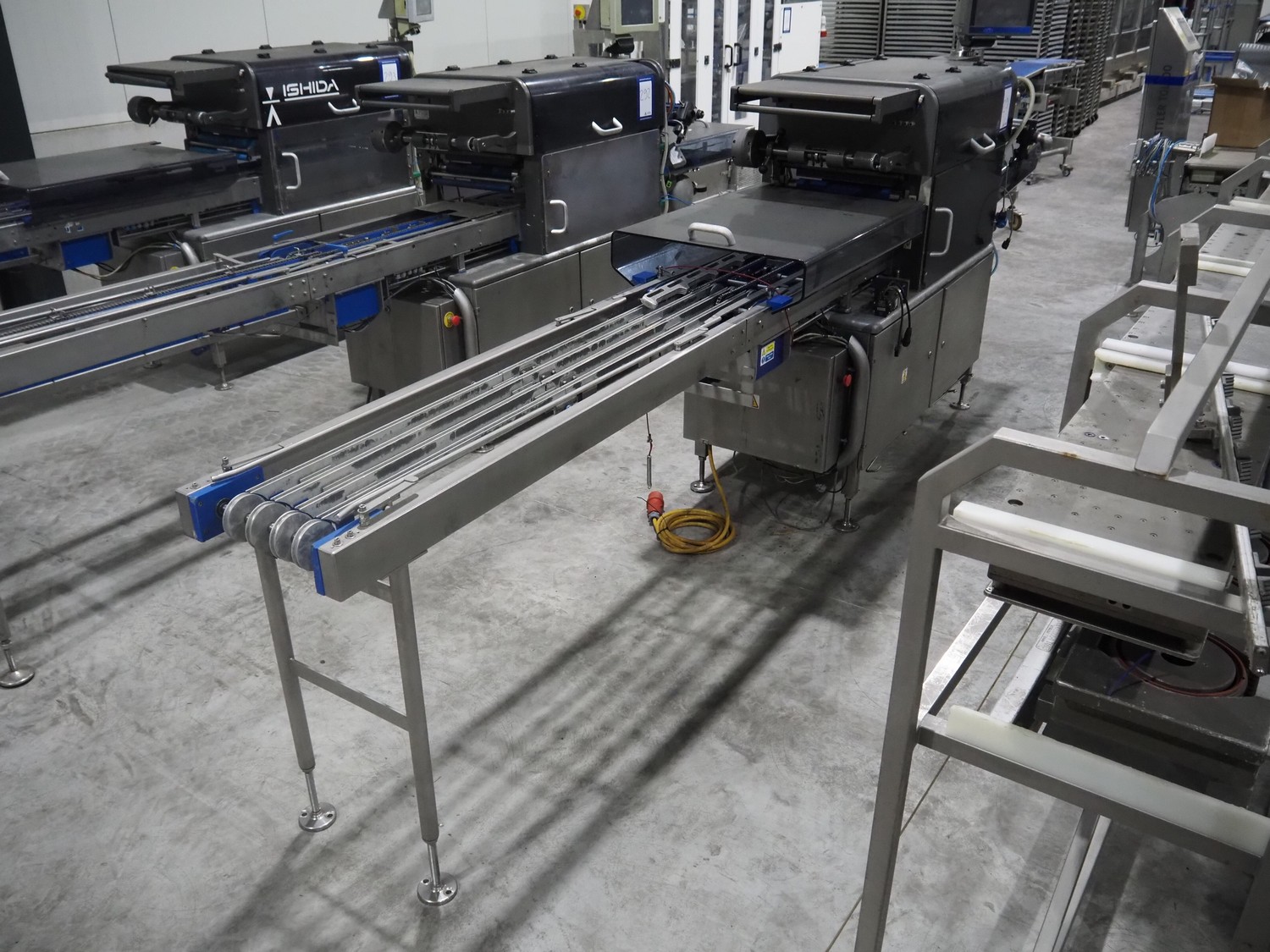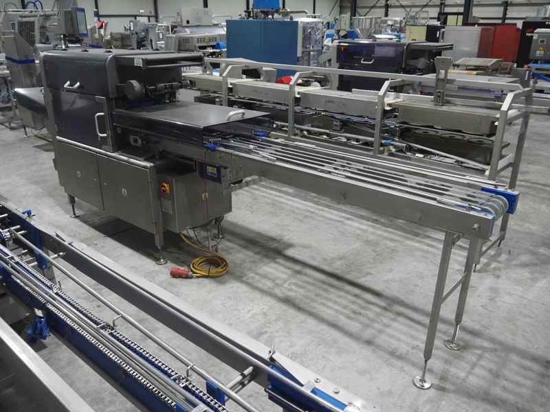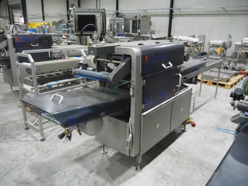 Ishida traysealer, model: QX775, serial number: 557811, year of construction: 10/2007, 415 V, 3 Ph, 50 Hz, 16 A, 830 kg, dimensions dye: (4x) 265 mm x 165 mm, total dimensions: 4750 mm x 800 mm x 1820 mm. Missing infeed belt.