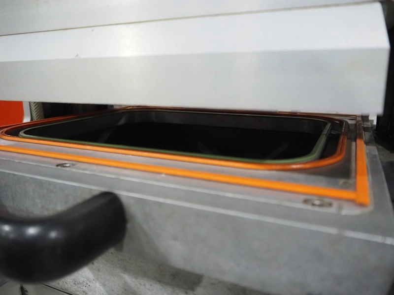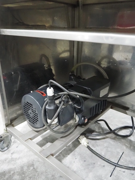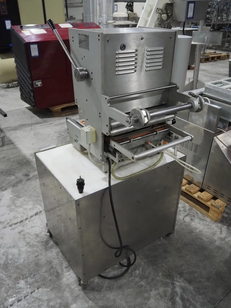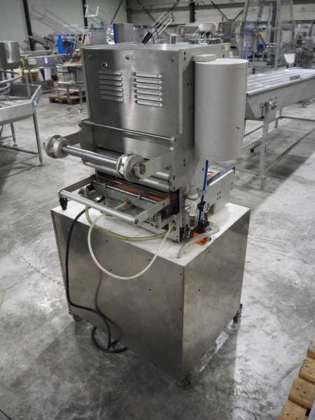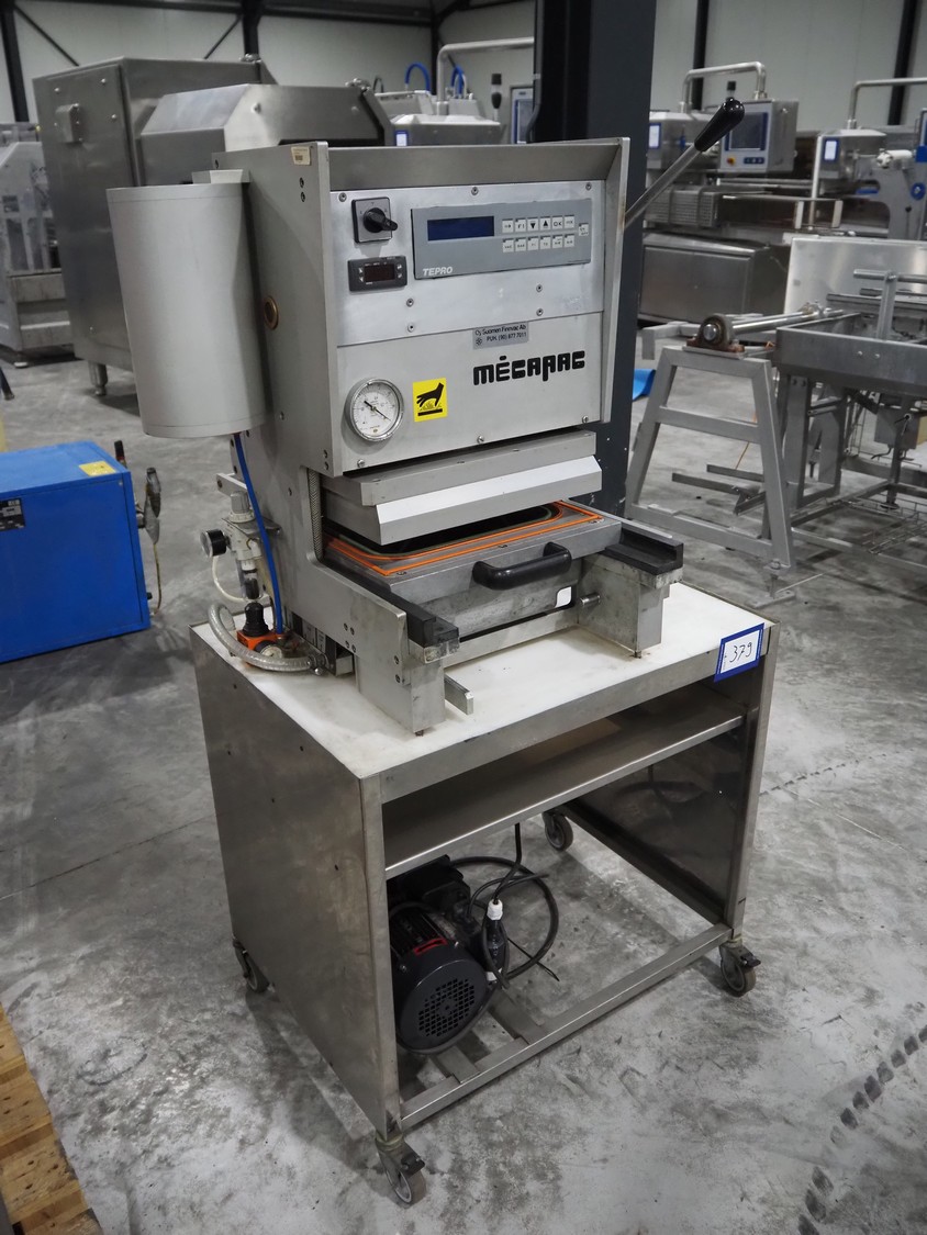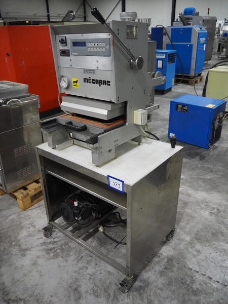 Mecapac mobile traysealer, dye: 290 mm x 220 mm, with Busch vacuum pump, total dimensions: 750 mm x 750 mm x 1430 mm.