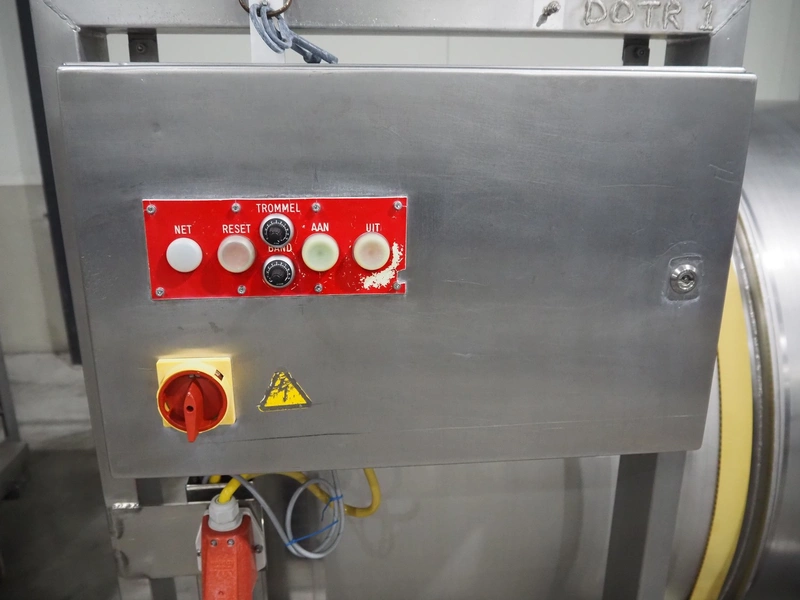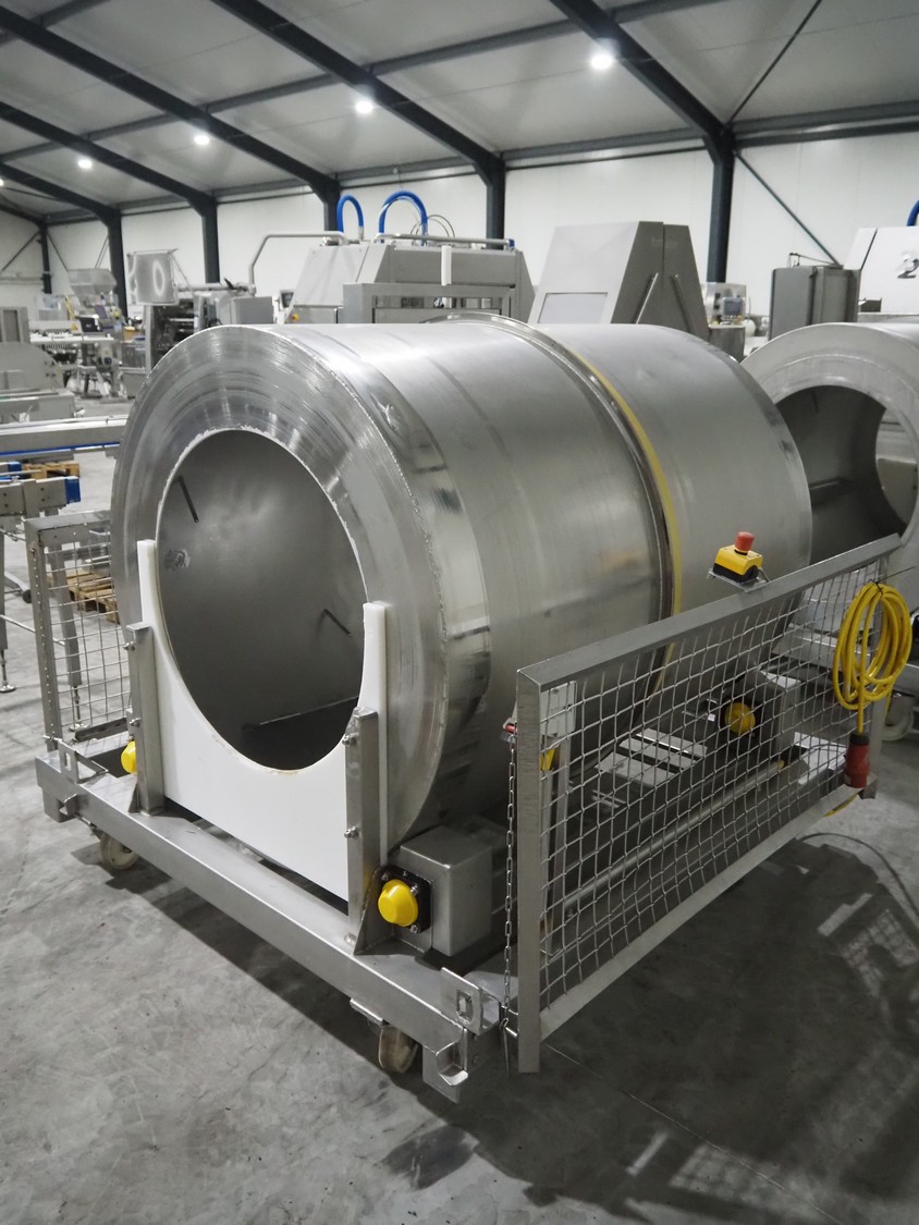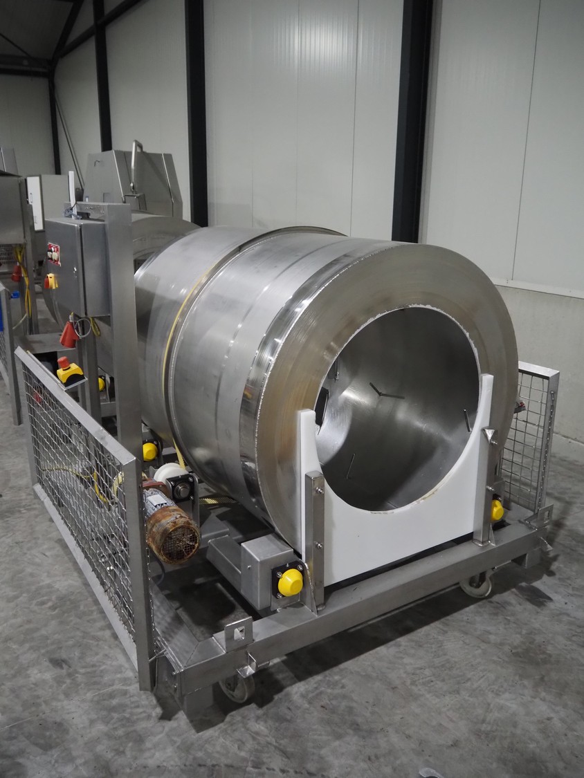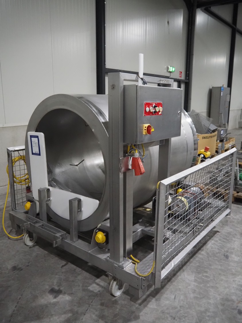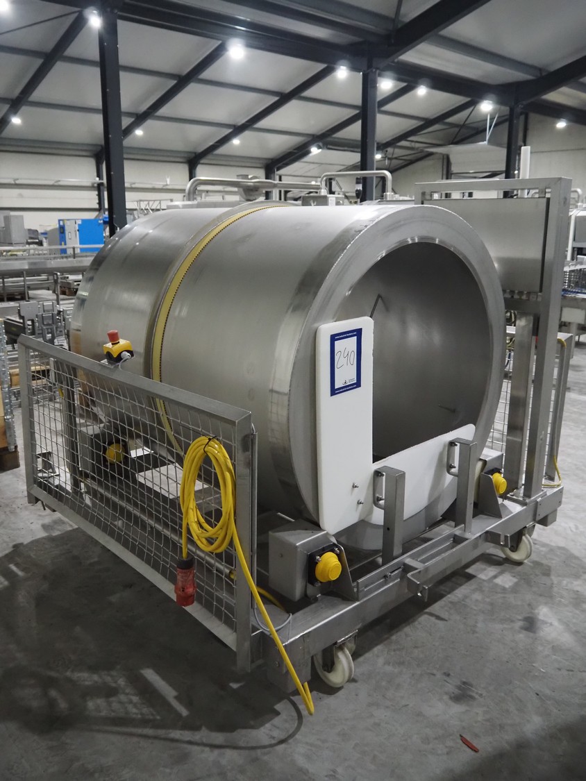 S/s mobile marinate tumbler, drum dimensions: Ø 1230 mm x 1510 mm, total dimensions: 2000 mm x 1950 mm x 1850 mm.
