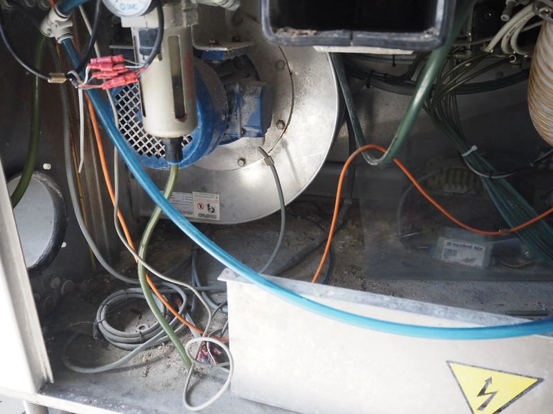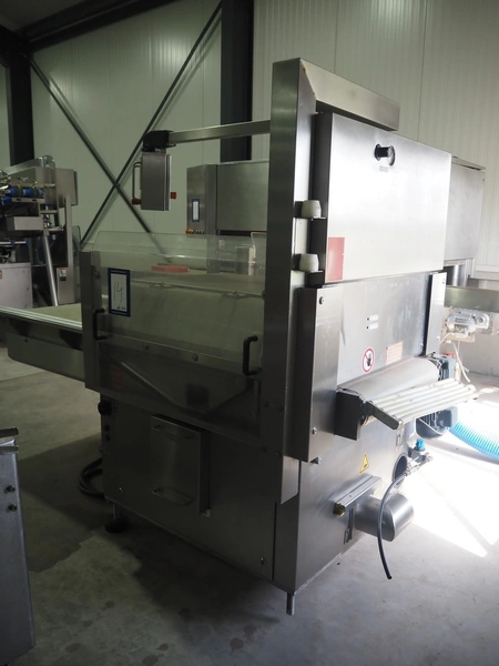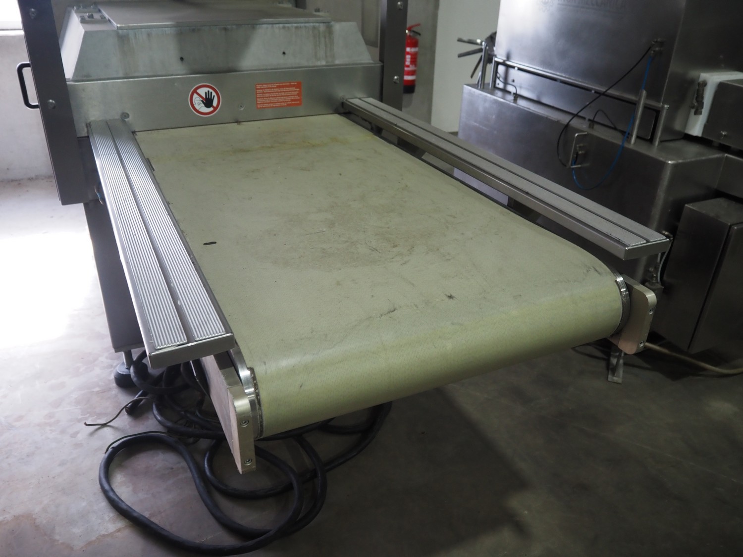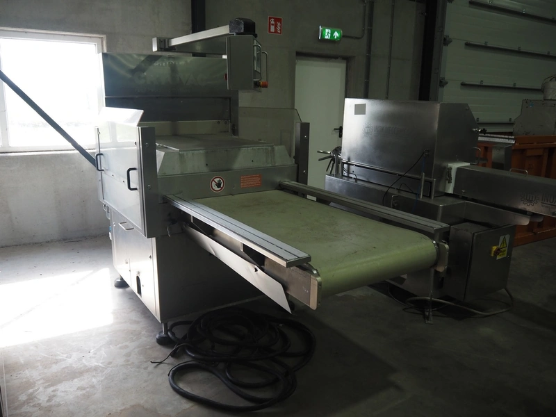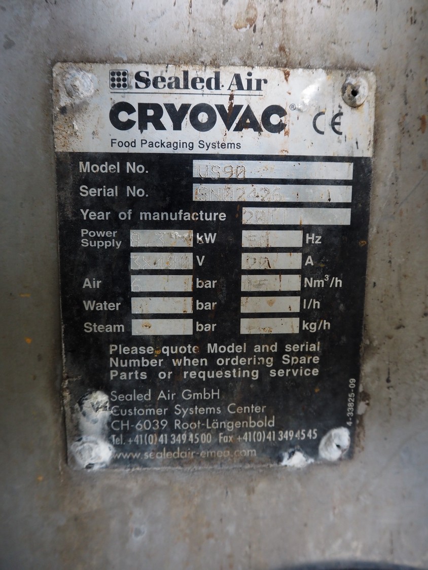 Cryovac belt vacuum machine, model number: VS90, serial number: SN02426, year of construction: 2011, 400 V, 50 Hz, 20 A, 8.3 kW, 15 Nm³ per hour, 6 bar, plastic belt, belt width: 680 mm, total dimensions: 2800 mm x 1240 mm x 1970 mm. Without vacuum pump.