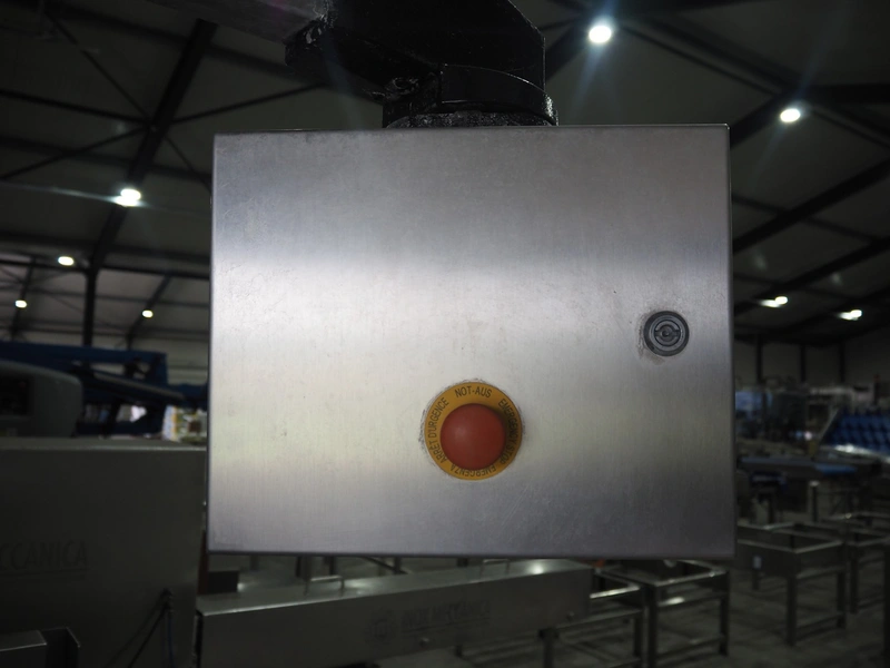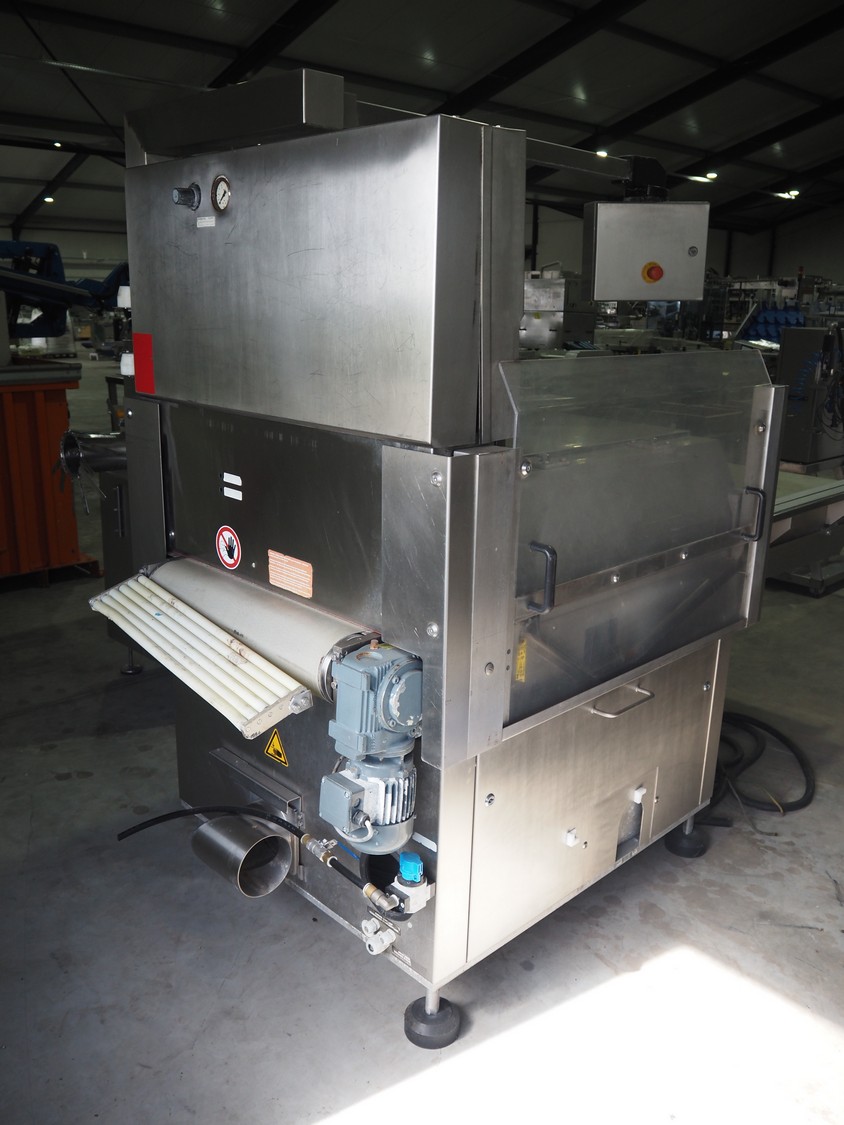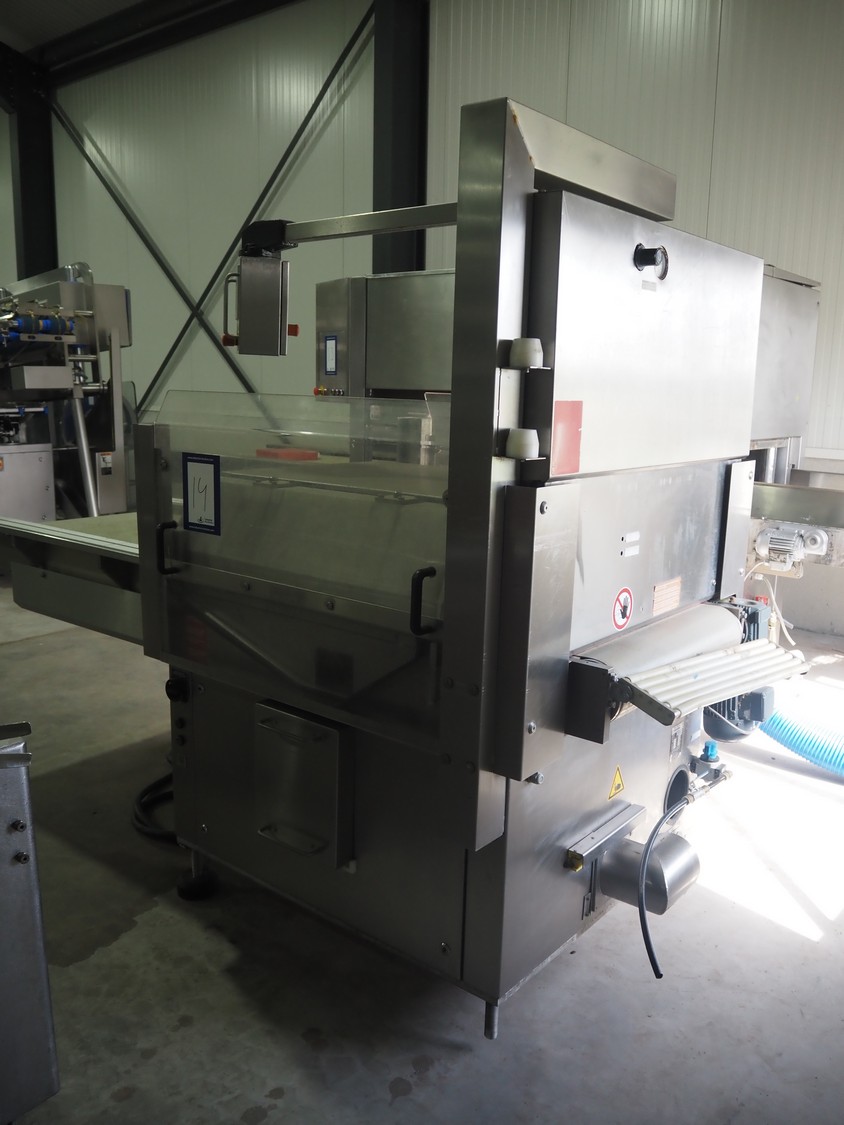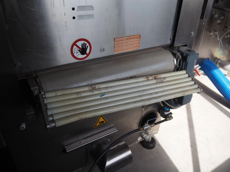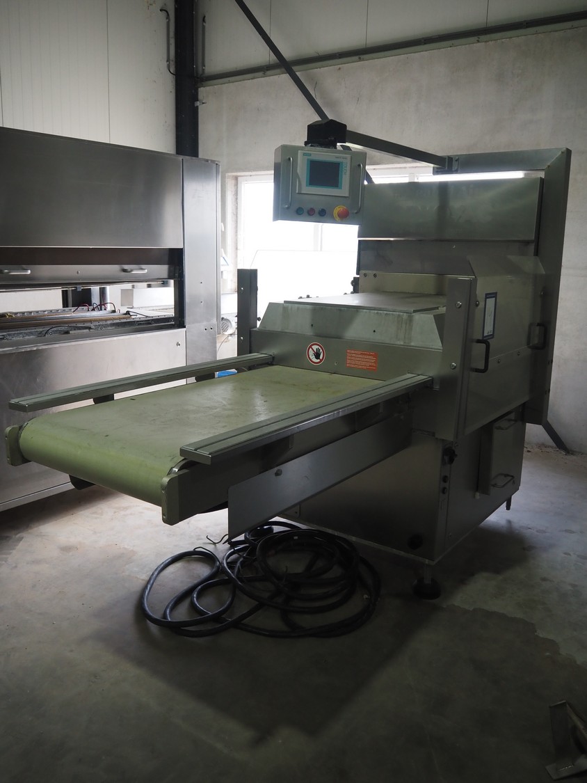 Cryovac belt vacuum machine, model number: VS90, serial number: SN02426, year of construction: 2011, 400 V, 50 Hz, 20 A, 8.3 kW, 15 Nm³ per hour, 6 bar, plastic belt, belt width: 680 mm, total dimensions: 2800 mm x 1240 mm x 1970 mm. Without vacuum pump.