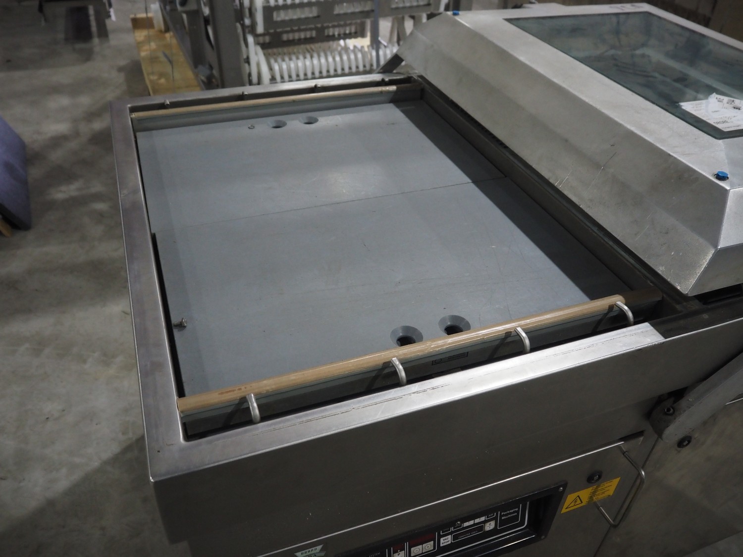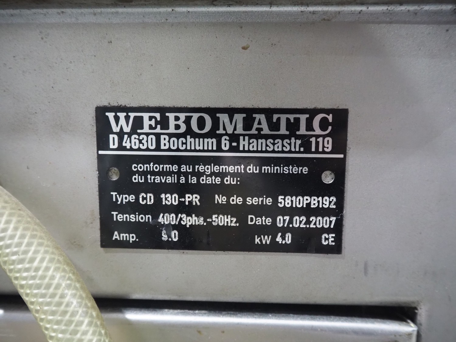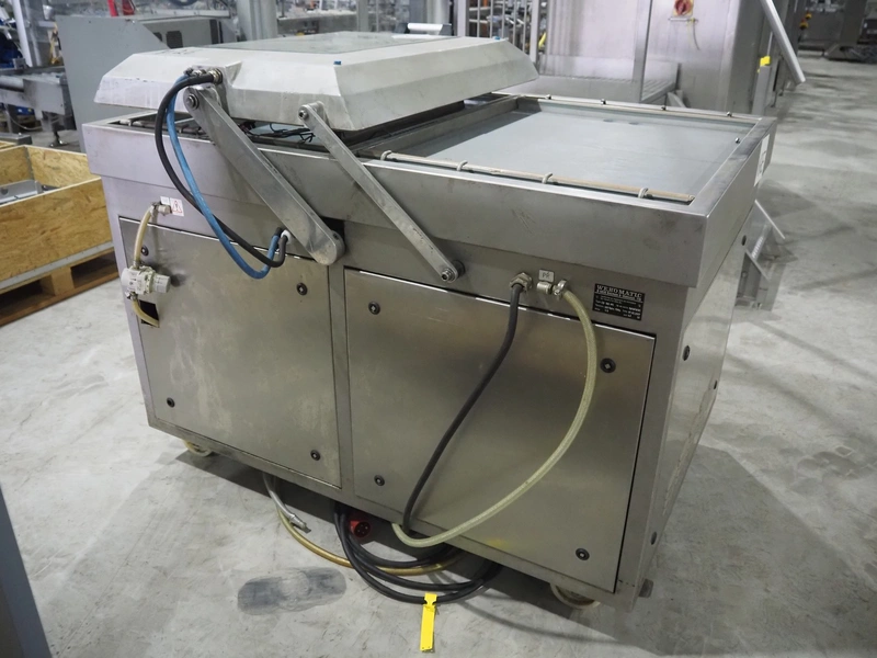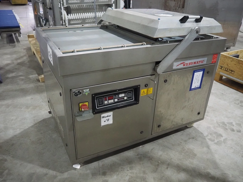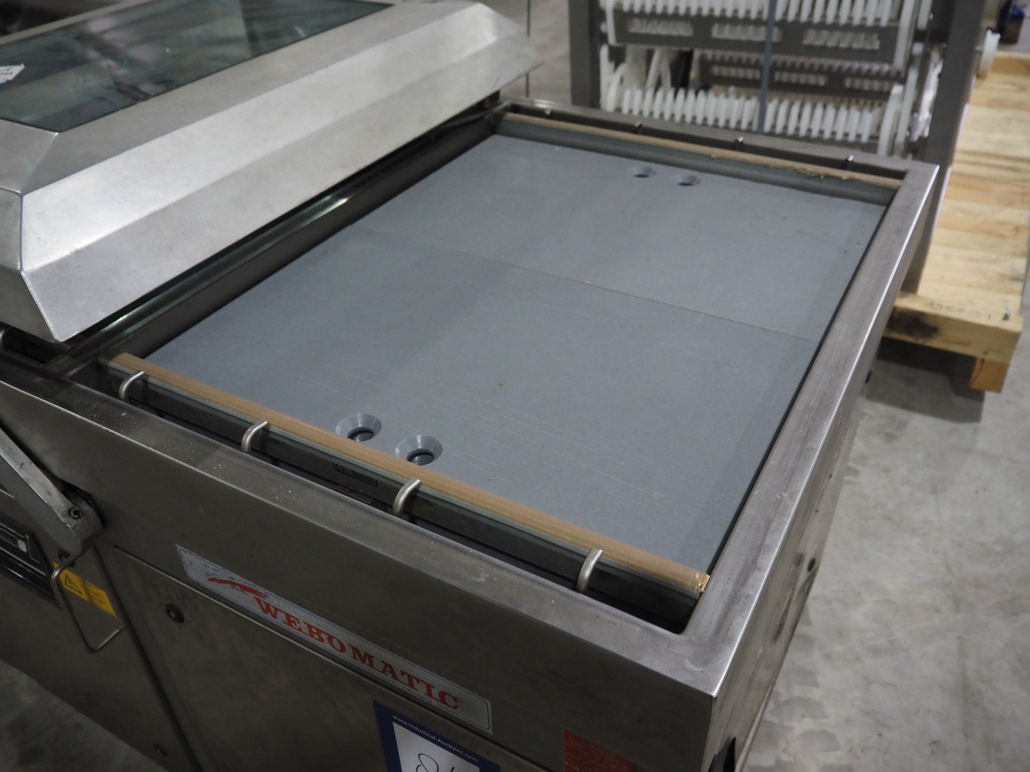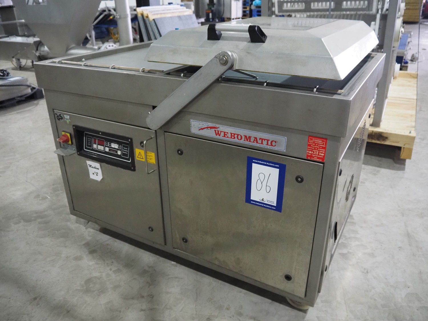 Webomatic mobile double chamber vacuum machine, type: CD 130-PR, serial number: 5810PB192, year of construction: 02/2007, 400 V, 3 Ph, 50 Hz, 9 A, 4 kW, dimensions chamber: (2x) 780 mm x 660 mm, seal length: (4x) 650 mm, total dimensions: 1450 mm x 1100 mm x 1150 mm. Without vacuum pump.