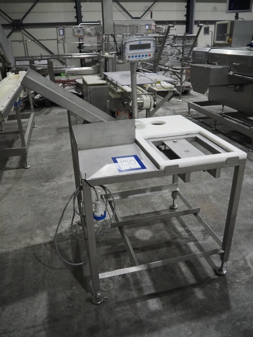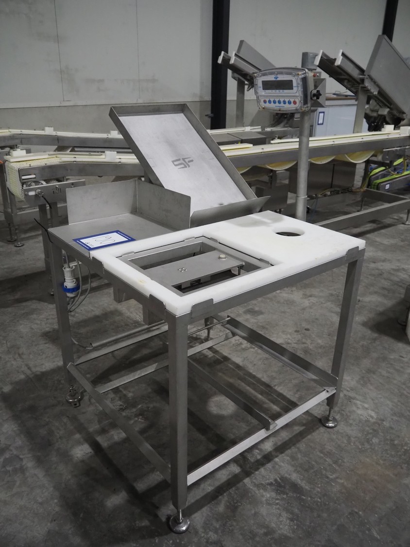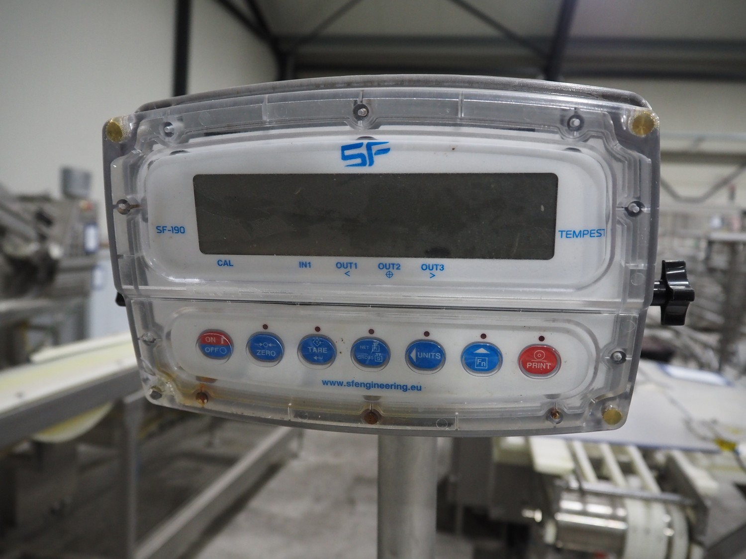 SF Engineering Food Processing Solutions weighing table with indicator, type: SF-190, dimensions scale: 415 mm x 415 mm, total dimensions: 1150 mm x 1000 mm x 1450 mm.