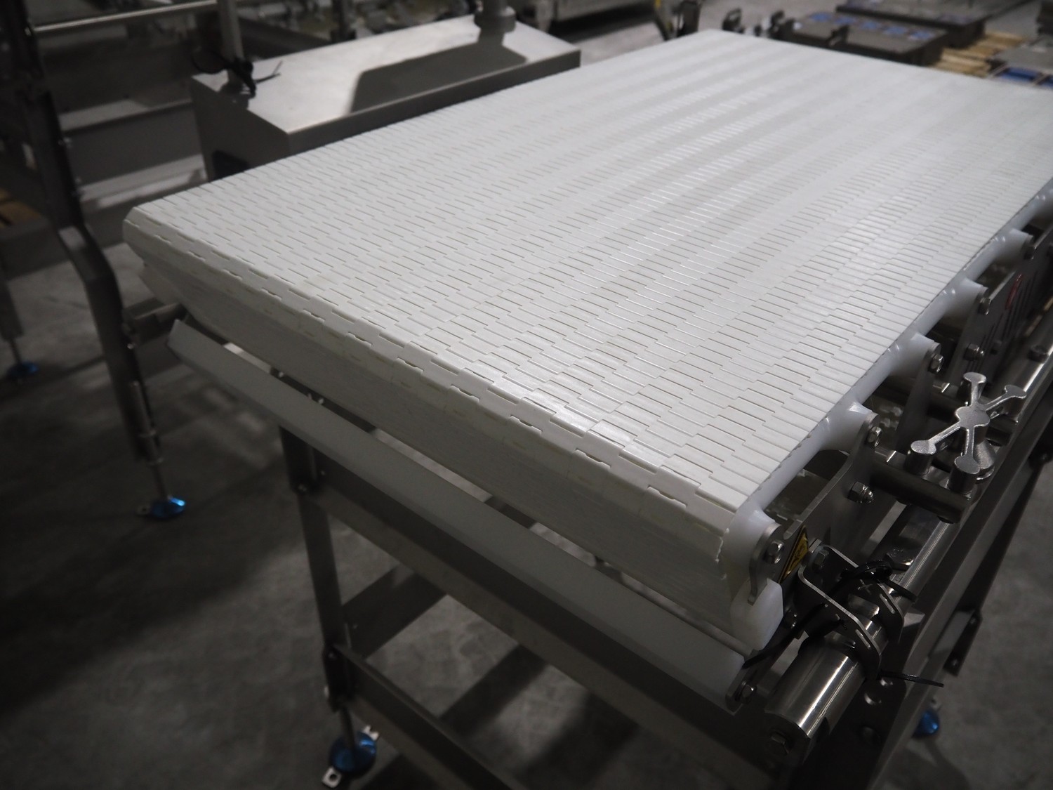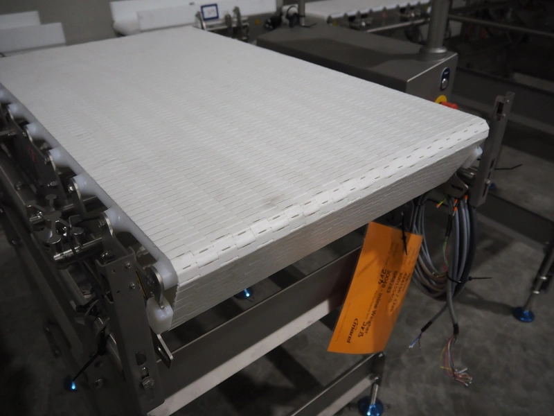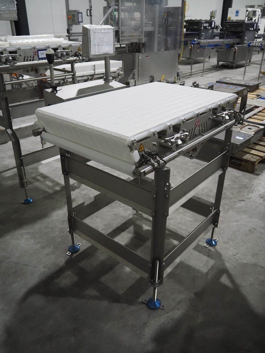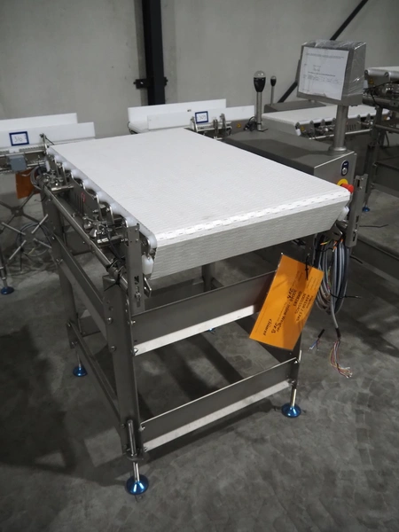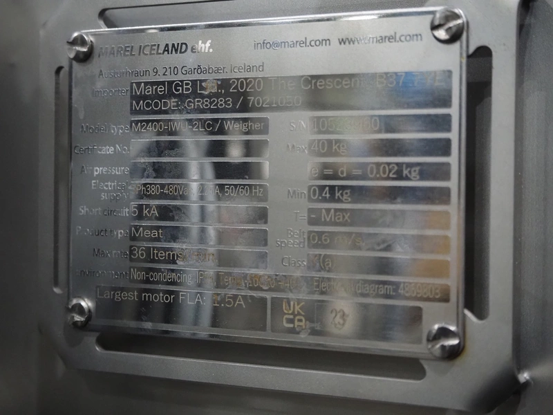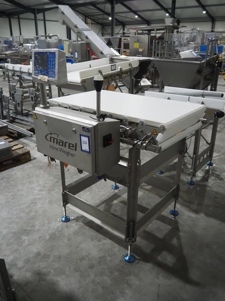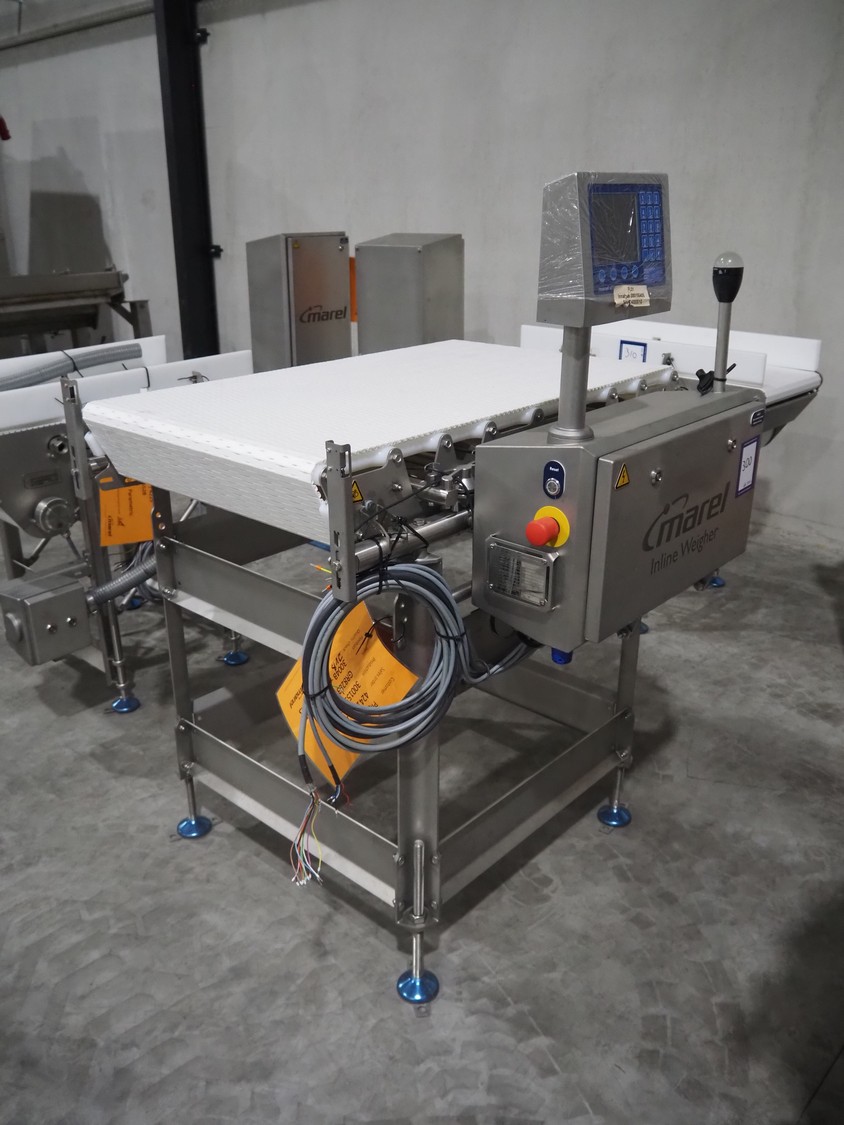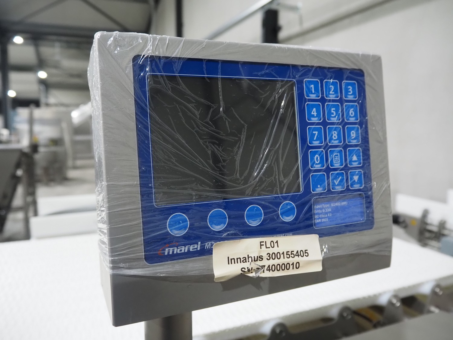 Marel inline weigher, model: M2400-IWU-2LC, serial number: 10523960, year of construction: 2023, max: 40 kg, min: 0.4 kg, e=d=0.02 kg, plastic belt, belt width: 607 mm, total dimensions: 1050 mm x 1000 mm x 1420 mm.
