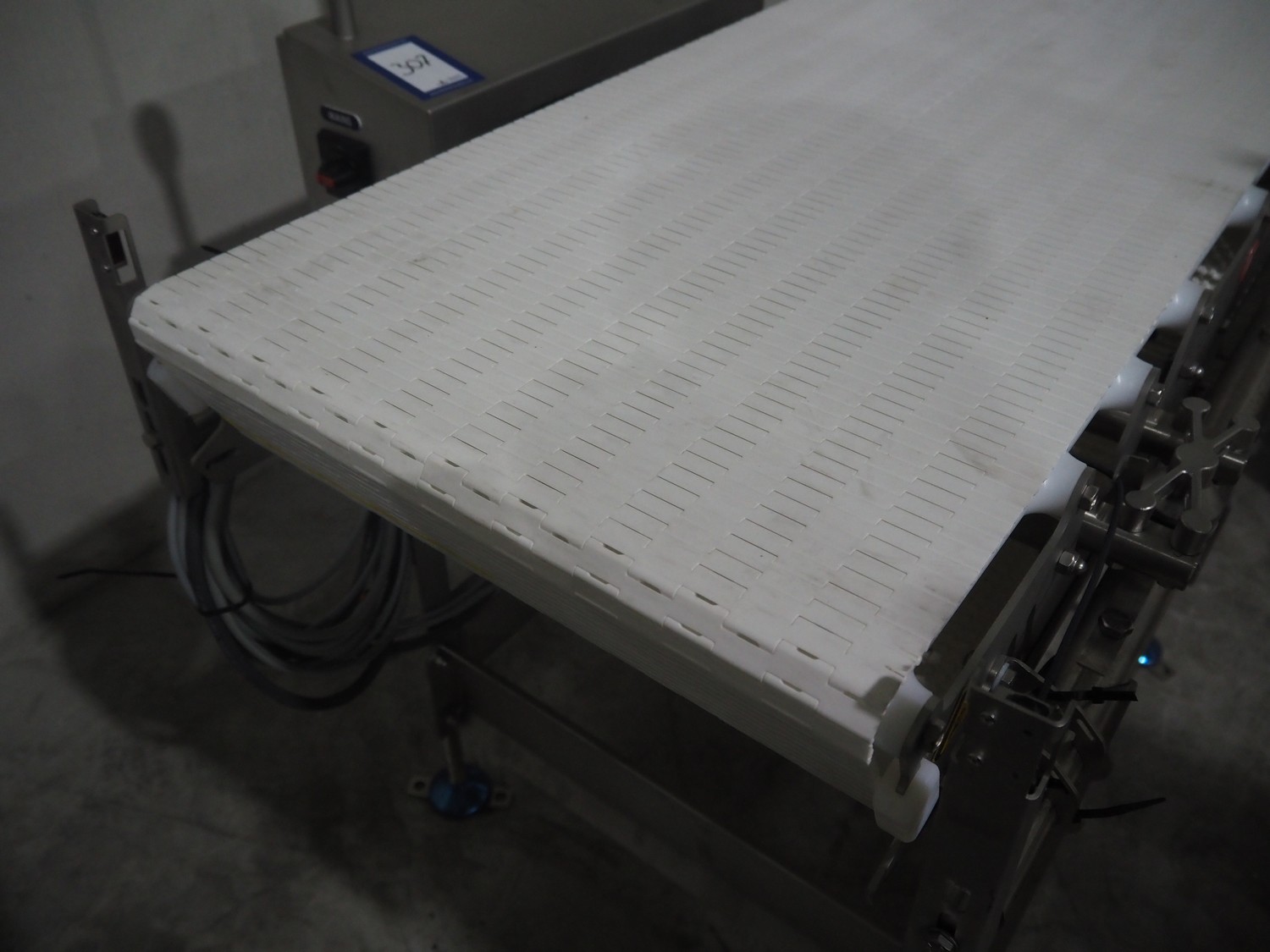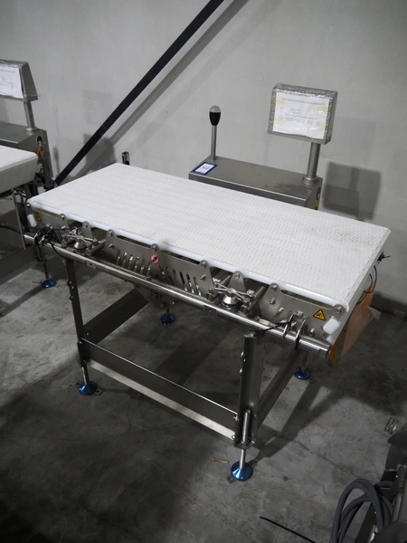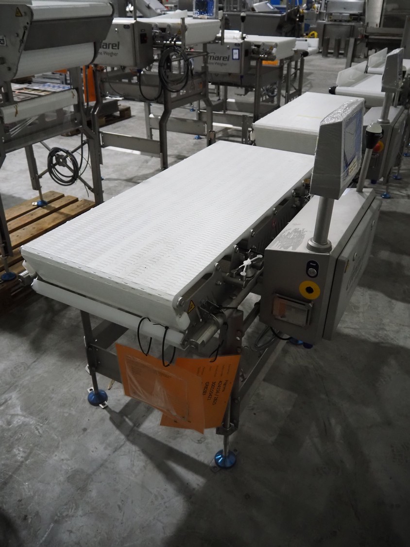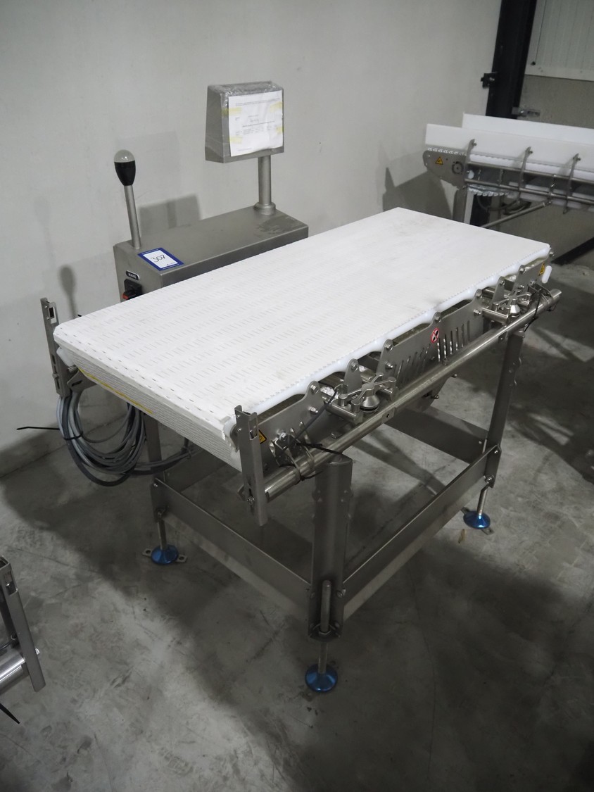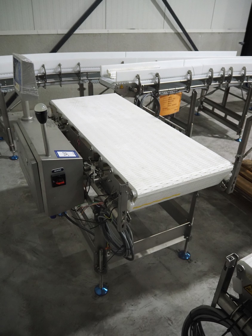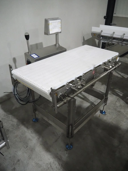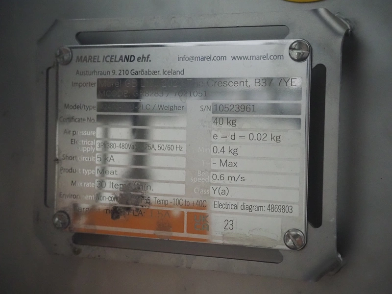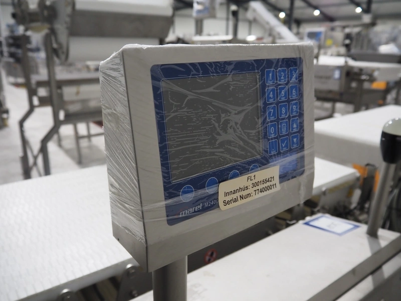 Marel inline weigher, model: M2400-IWU-2LC, serial number: 10523961, year of construction: 2023, max: 40 Kg, min: 0.4 Kg, e=d=0.02 Kg, plastic belt, belt width: 505 mm, total dimensions: 1250 mm x 900 mm x 1250 mm.