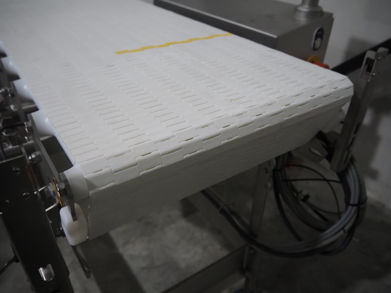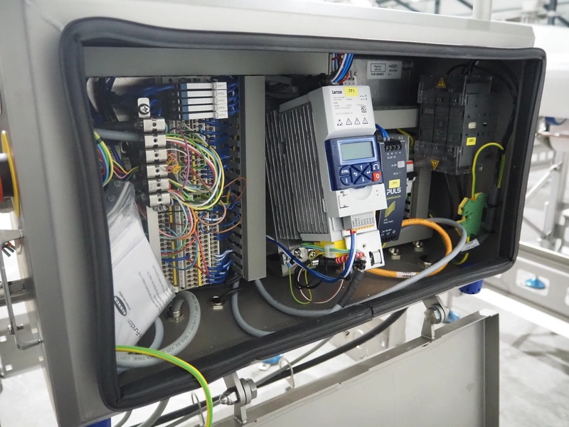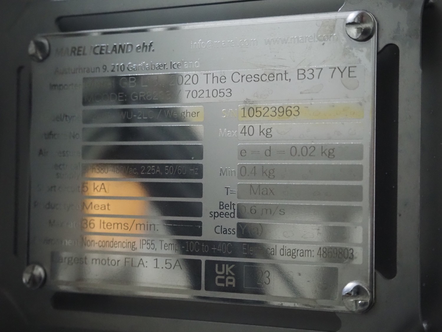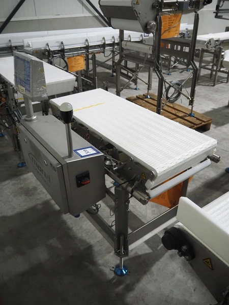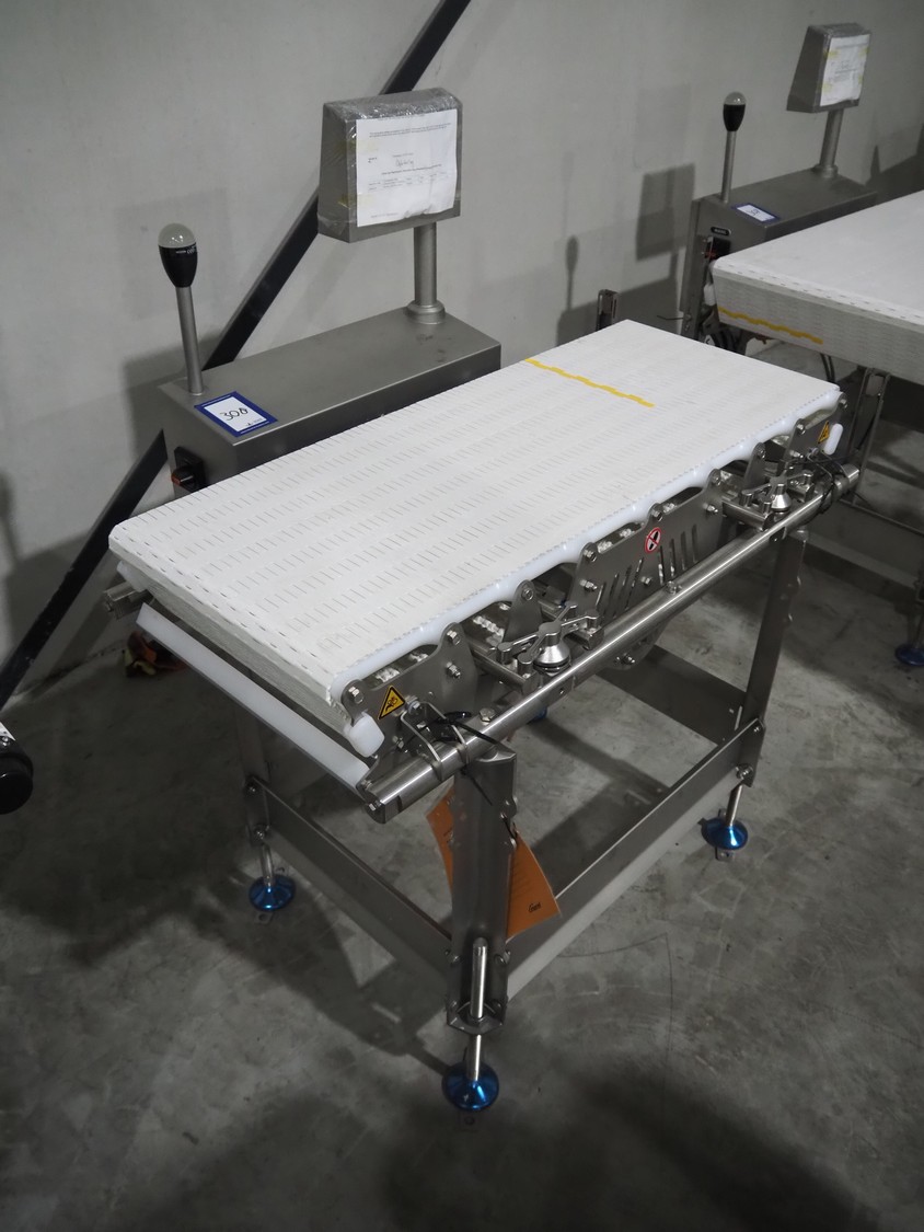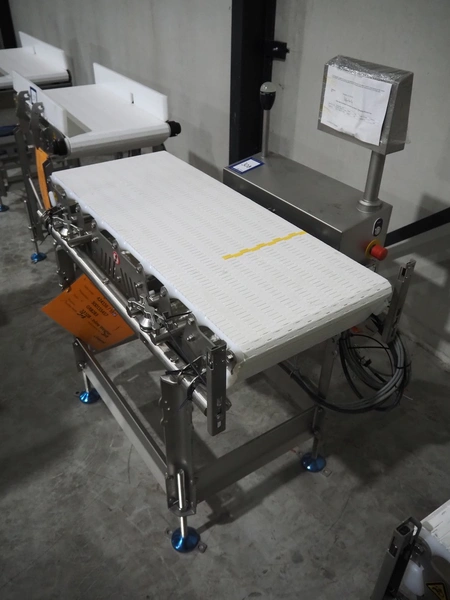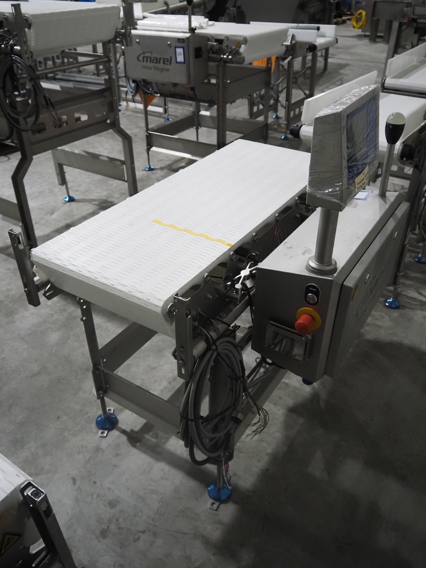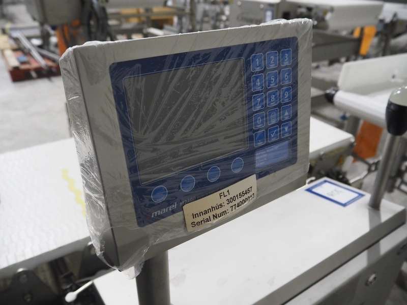 Marel inline weigher, model: M2400-IWU-2LC, serial number: 10523963, year of construction: 2023, max: 40 Kg, min: 0.4 Kg, e=d=0.02 Kg, plastic belt, belt width: 405 mm, total dimensions: 1050 mm x 800 mm x 1230 mm.