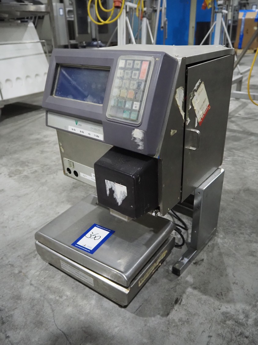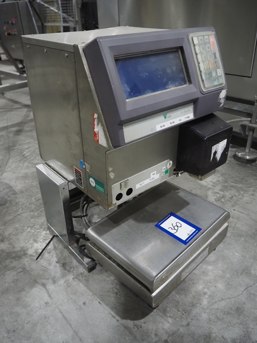 Digi Systems weighing scale with label printer, type: DI-3600, serial number: 08121568, 220-240 V, 50/60 Hz, 0.3 A, min 100 gram, max 15 kg, e= 5 gram, scale dimensions: 345mm x 450 mm, total dimensions: 480 mm x 400 mm x 600 mm.