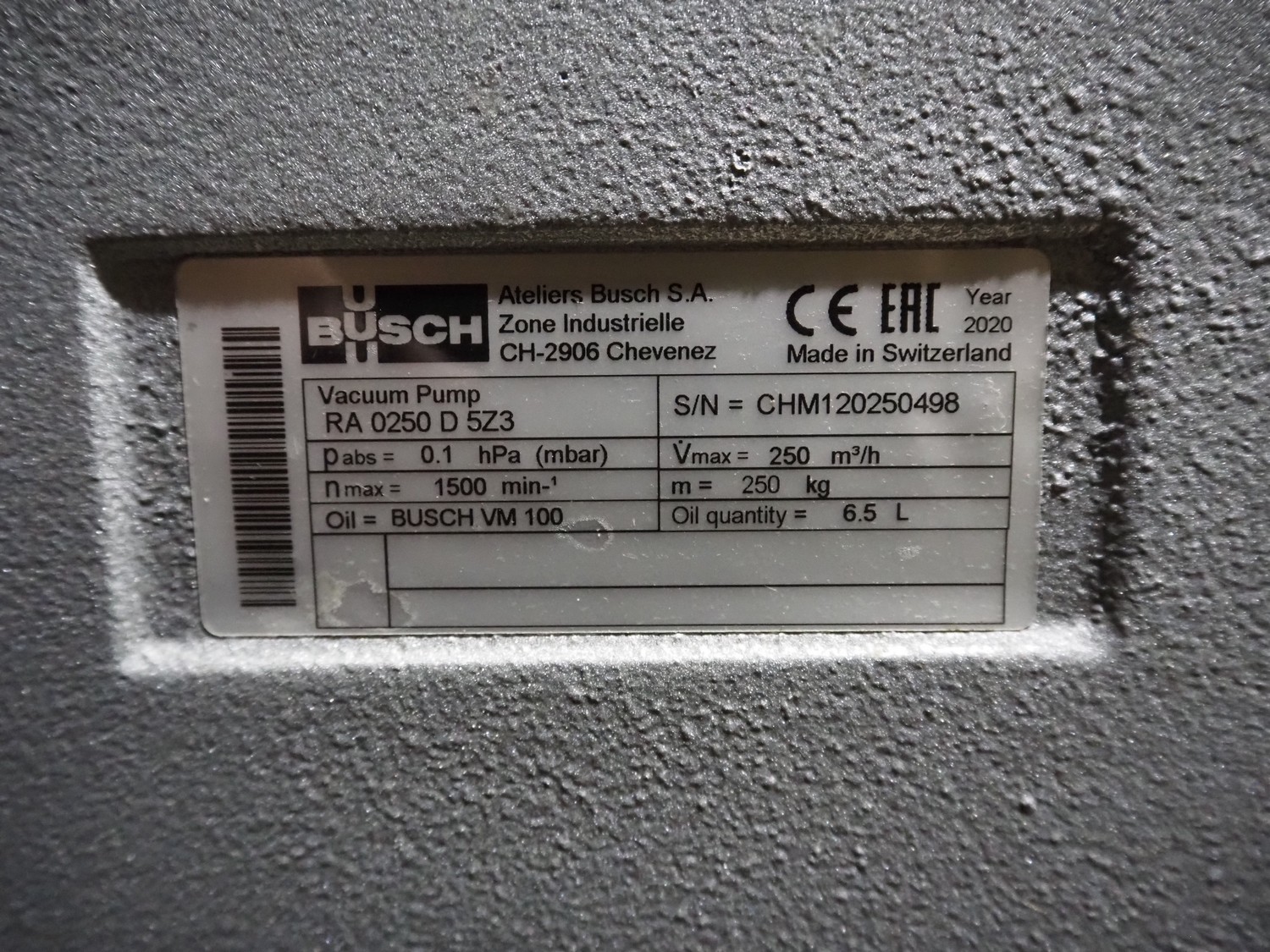 Busch vacuum pump, type: RA 0250 D 523, serial number: CHM120250498, year of construction: 2020, capacity: 250 m³/h, dimensions: 950 mm x 600 mm x 450 mm.