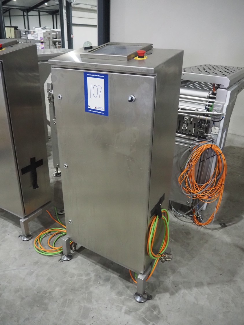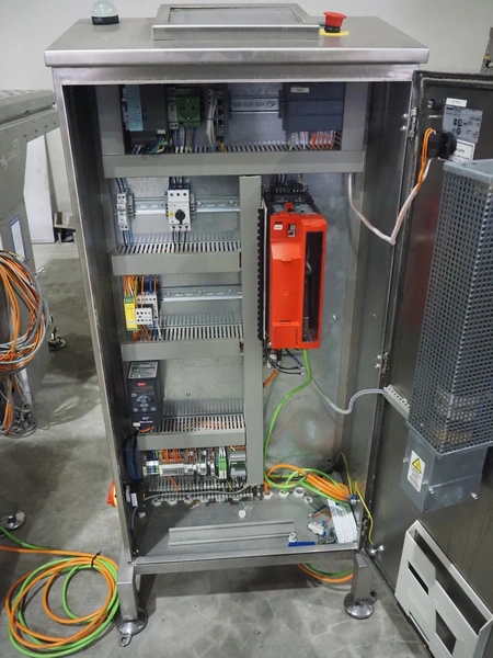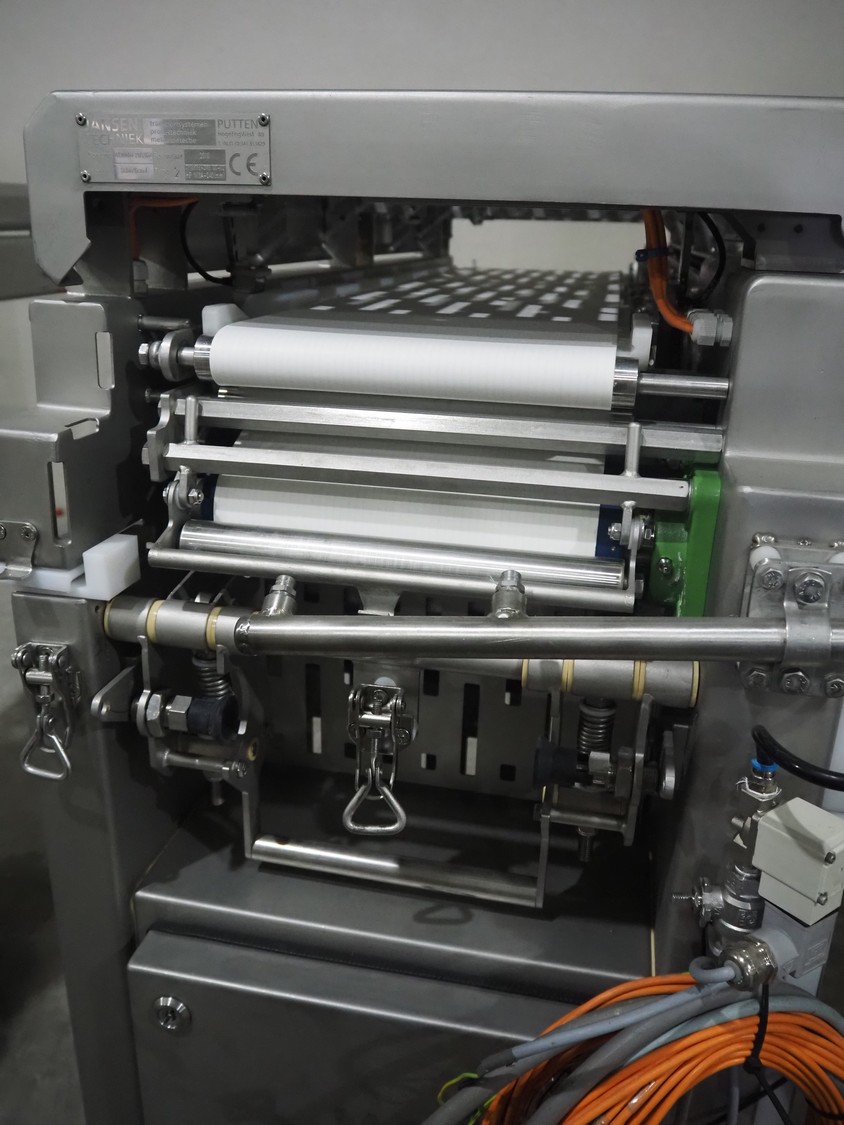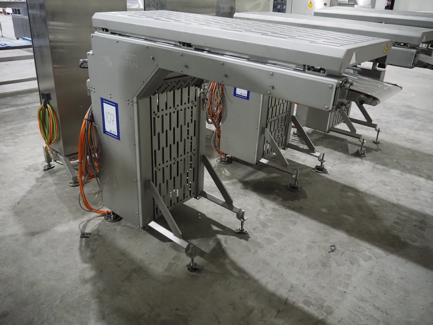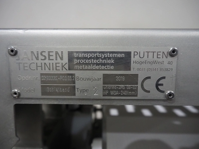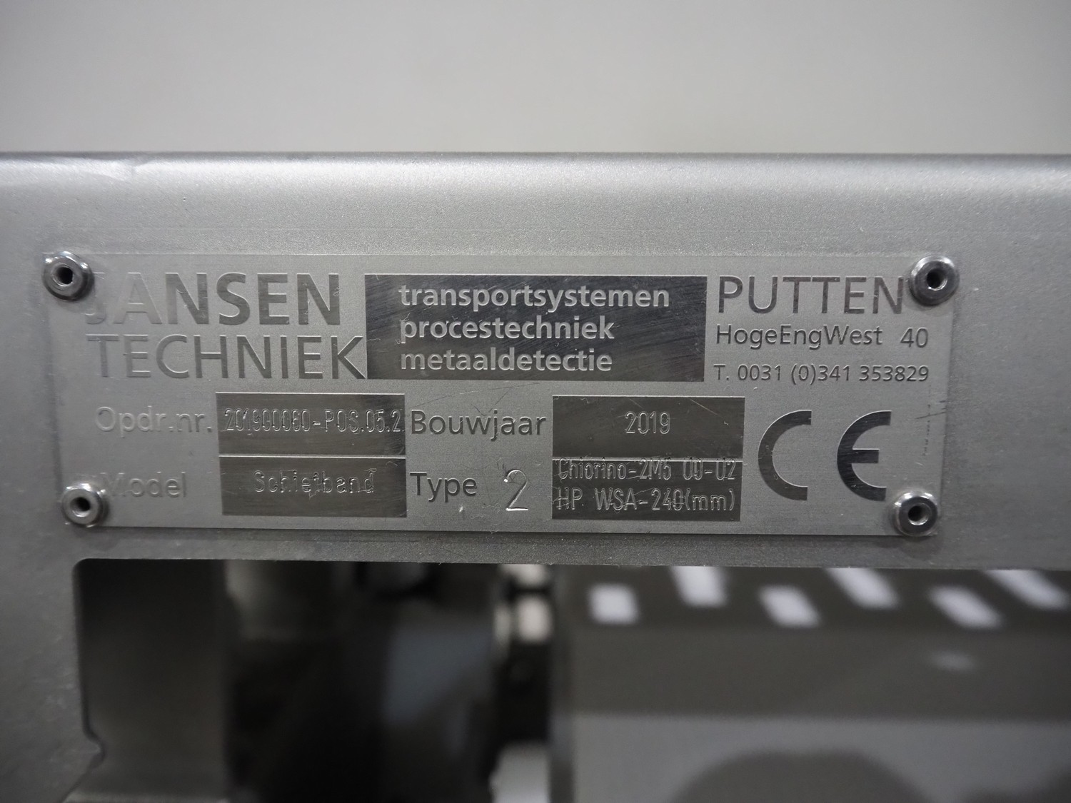 Jansen Techniek shuttle conveyor, type: SBK150, model: Schietband, year of construction: 2019, plastic belt, belt width: 240 mm, total dimensions: 1400 mm x 600 mm x 1250 mm. Including switch cabinet, dimensions: 700 mm x 500 mm x 1250.