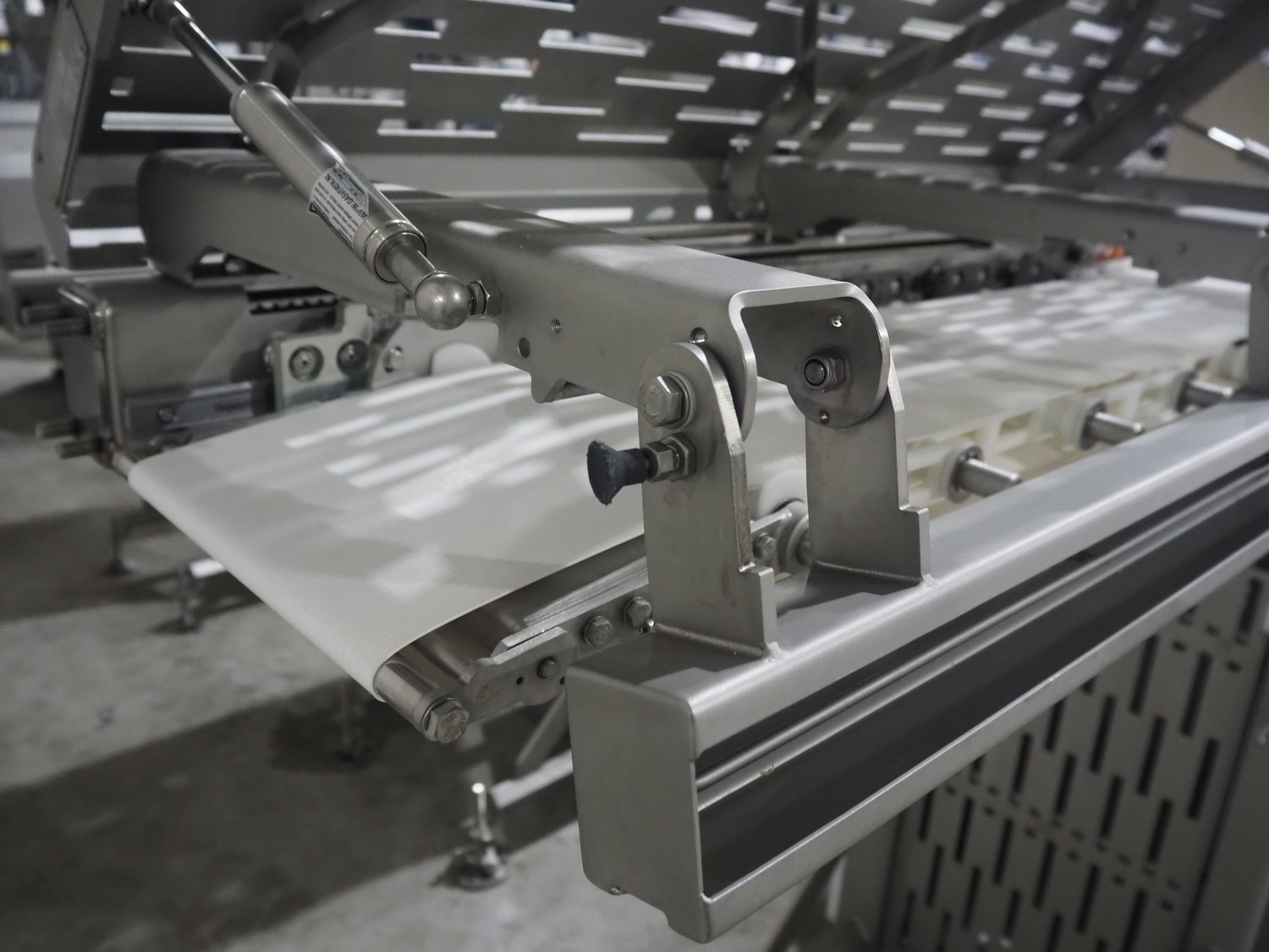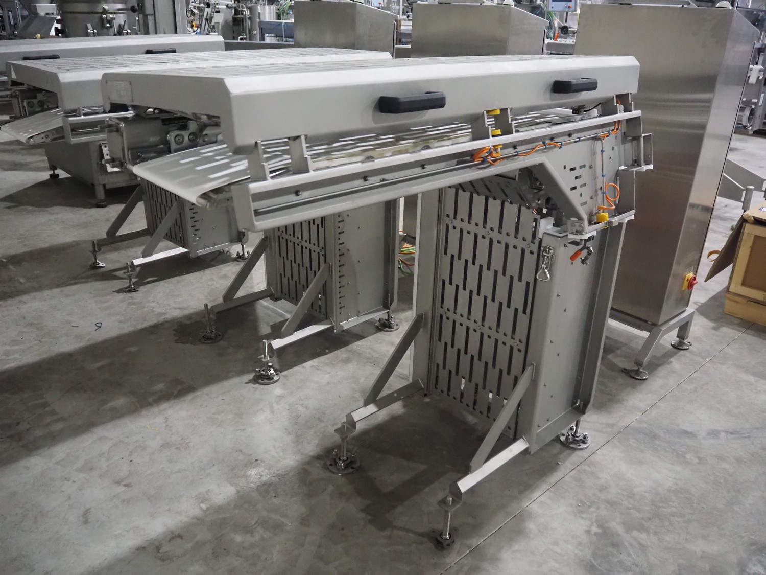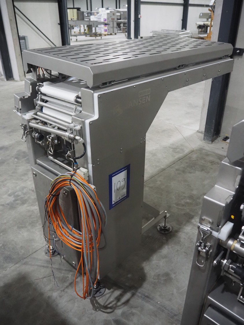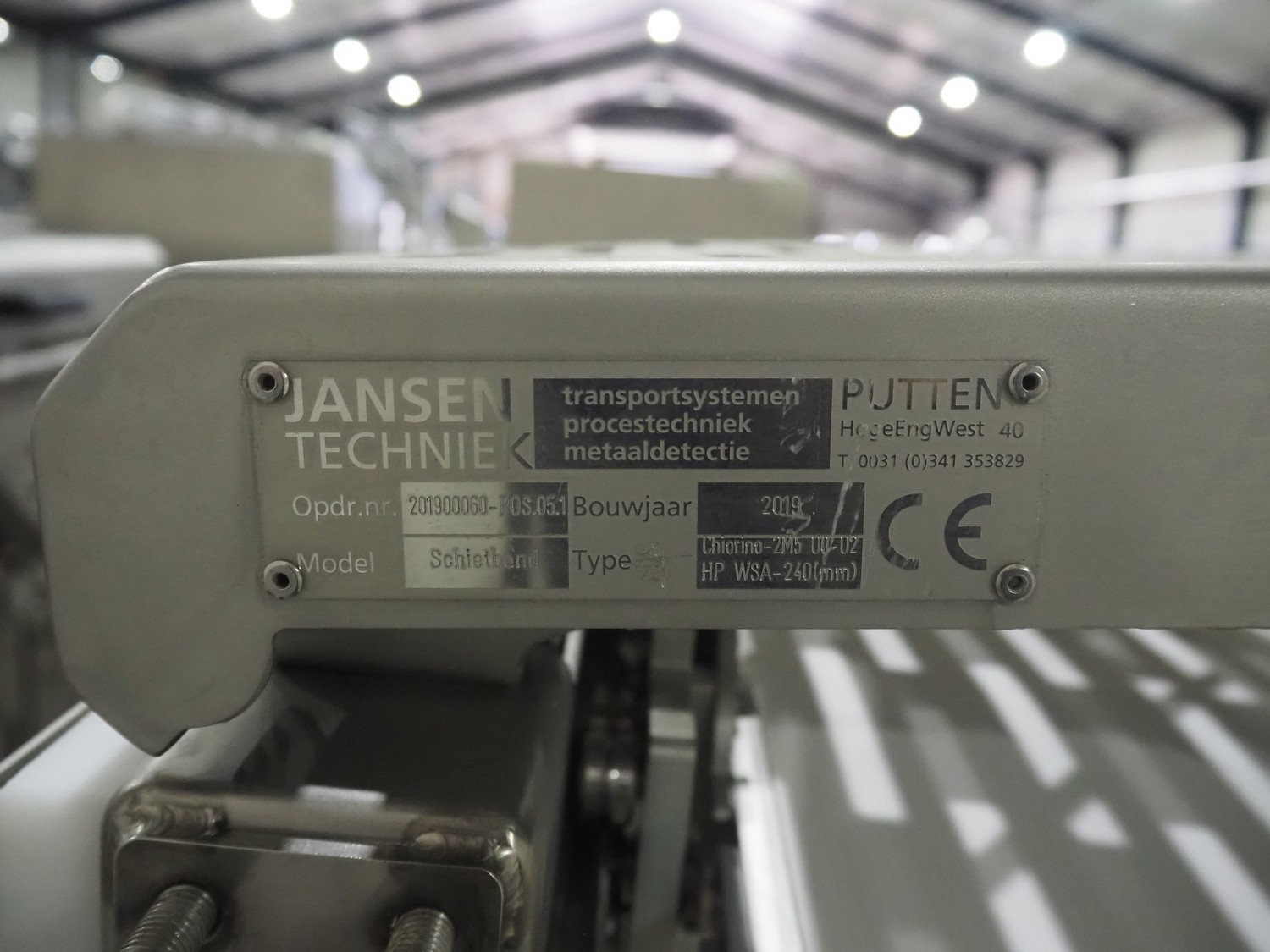 Jansen Techniek shuttle conveyor, type: SBK150, model: schietband, year of construction: 2019, plastic belt, belt width: 240 mm, total dimensions: 1400 mm x 600 mm x 1250 mm. Including switch cabinet, dimensions: 700 mm x 500 mm x 1250.