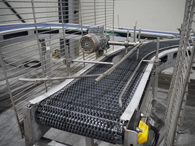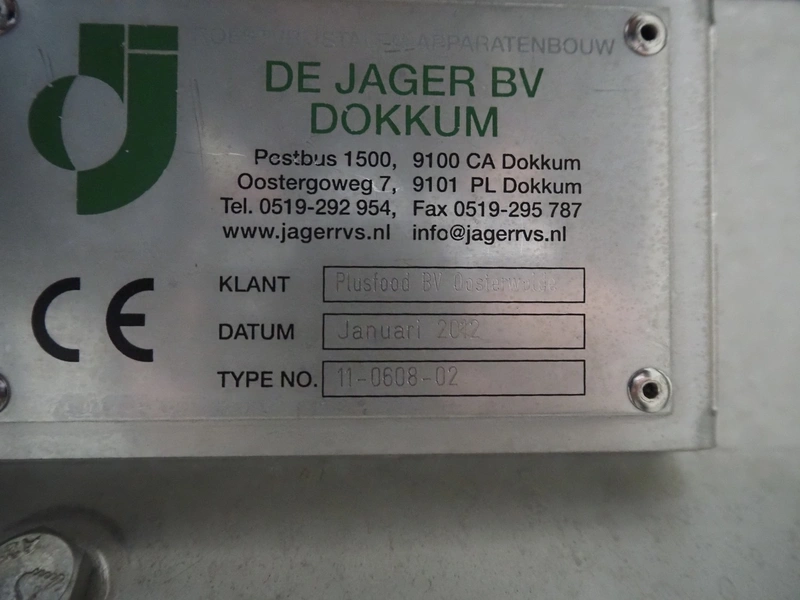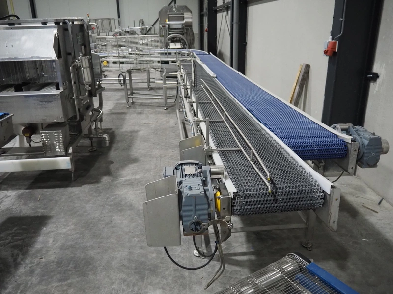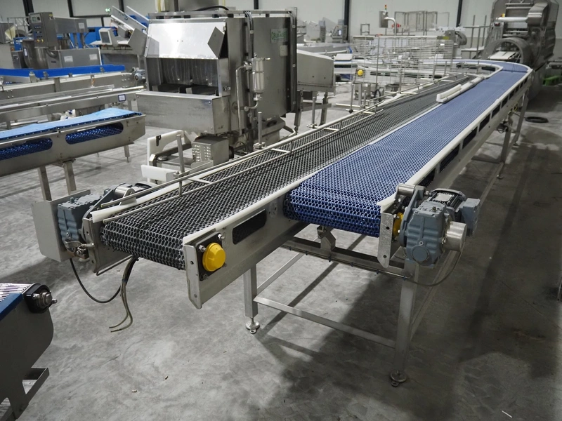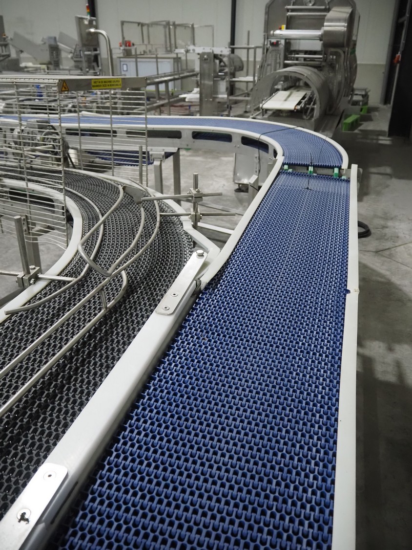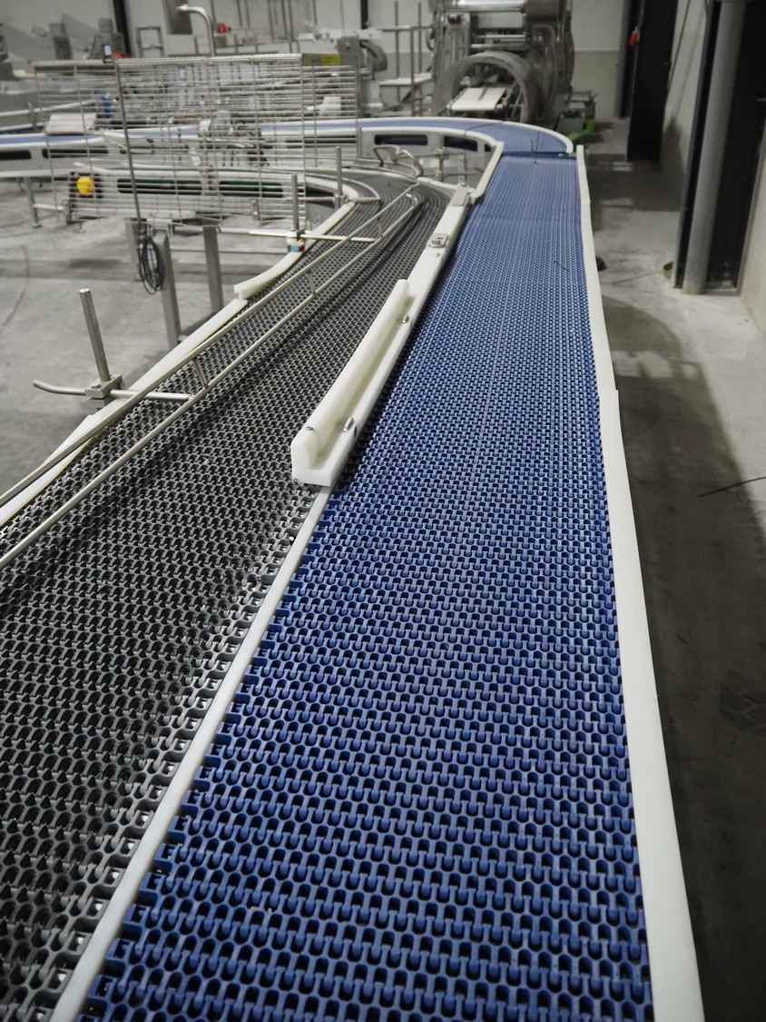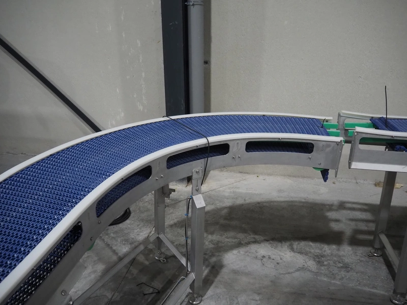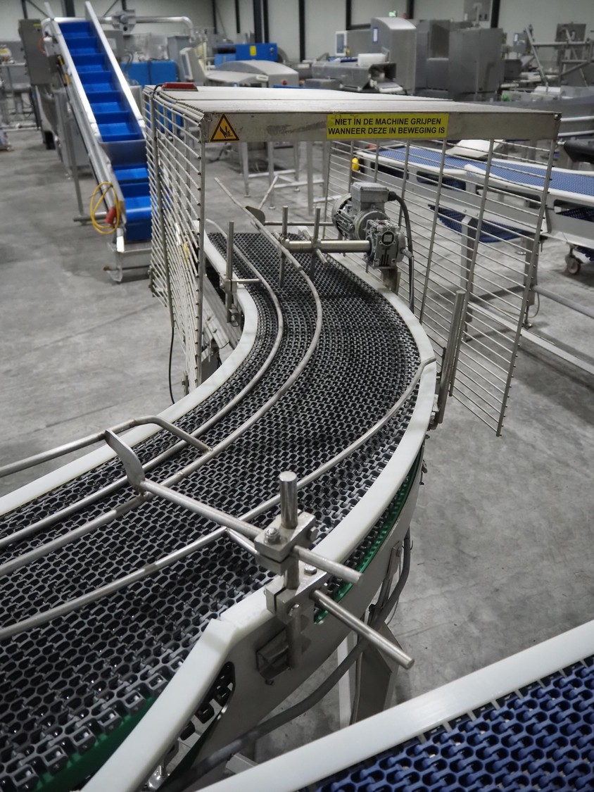 De Jager BV double 90° curve conveyor, type: 11-0608-02, year of construction: 01/2012, plastic mesh belts, belt width: 355 mm, total dimensions: 7800 mm x 4300 mm x 1400 mm.