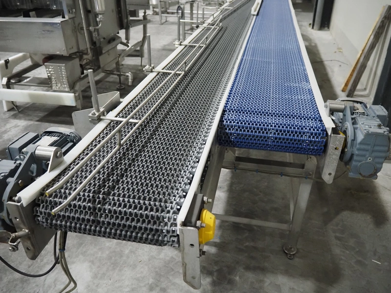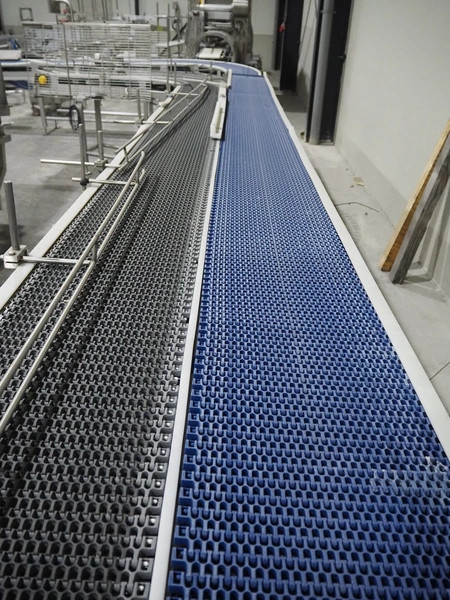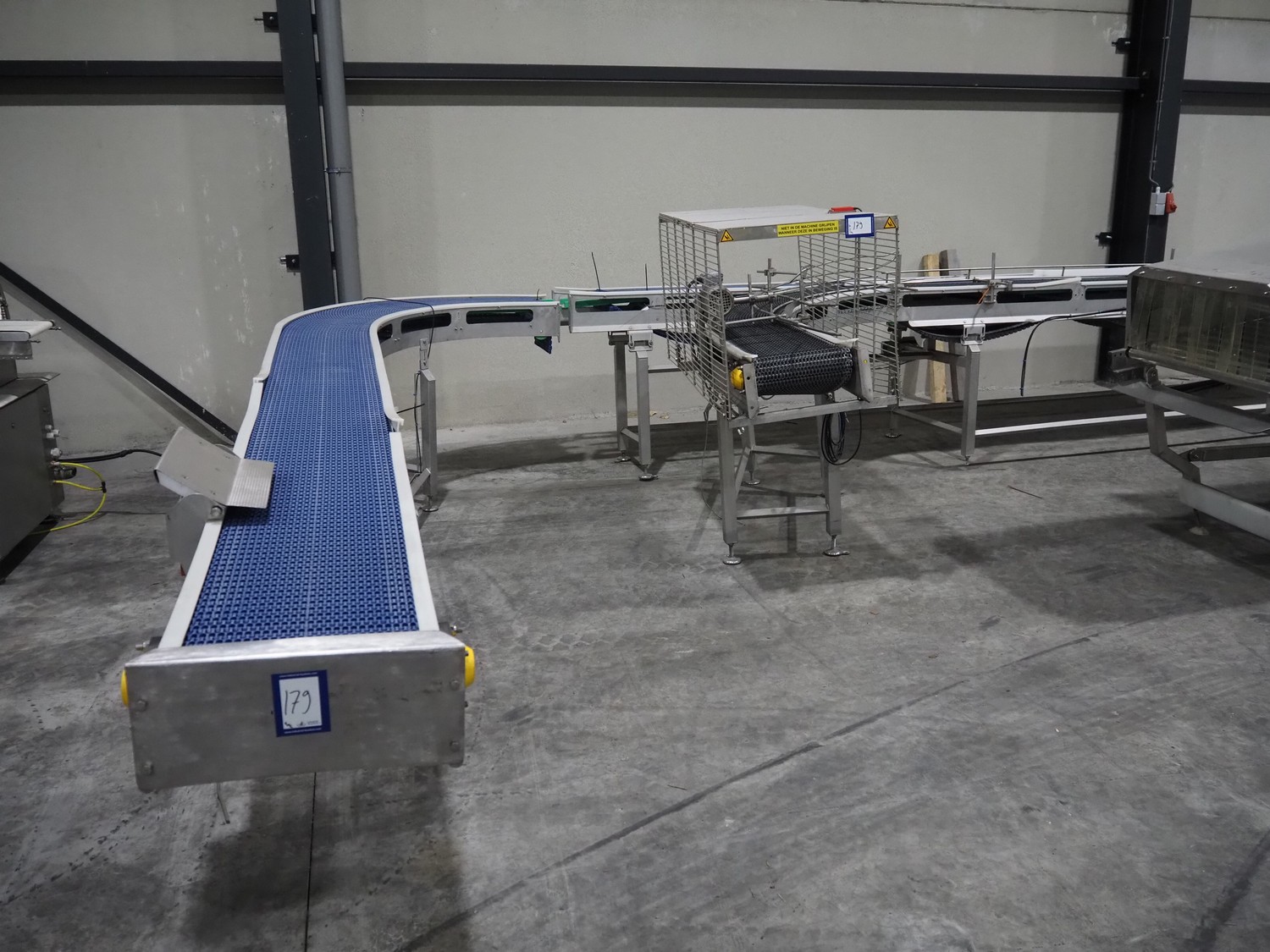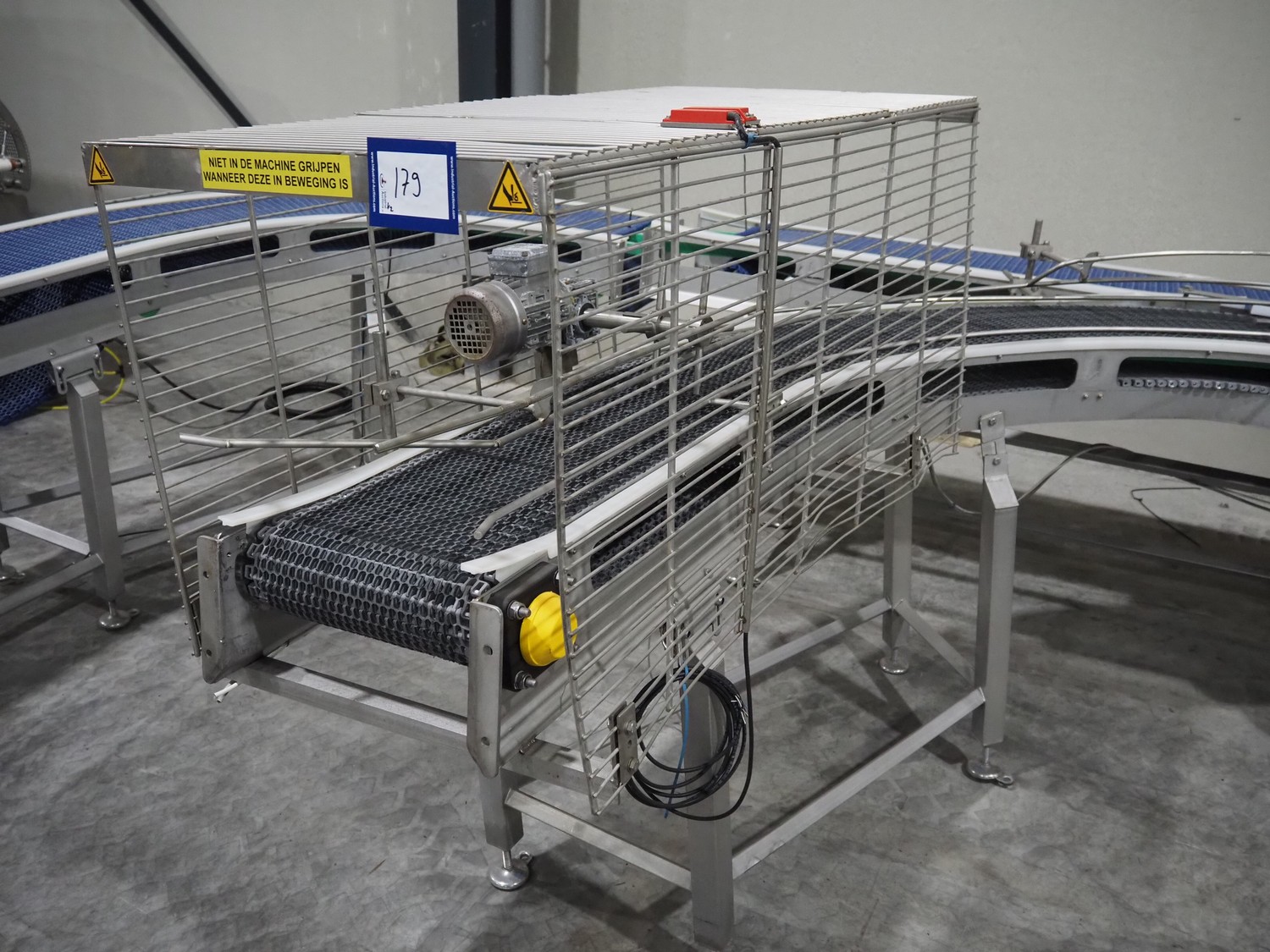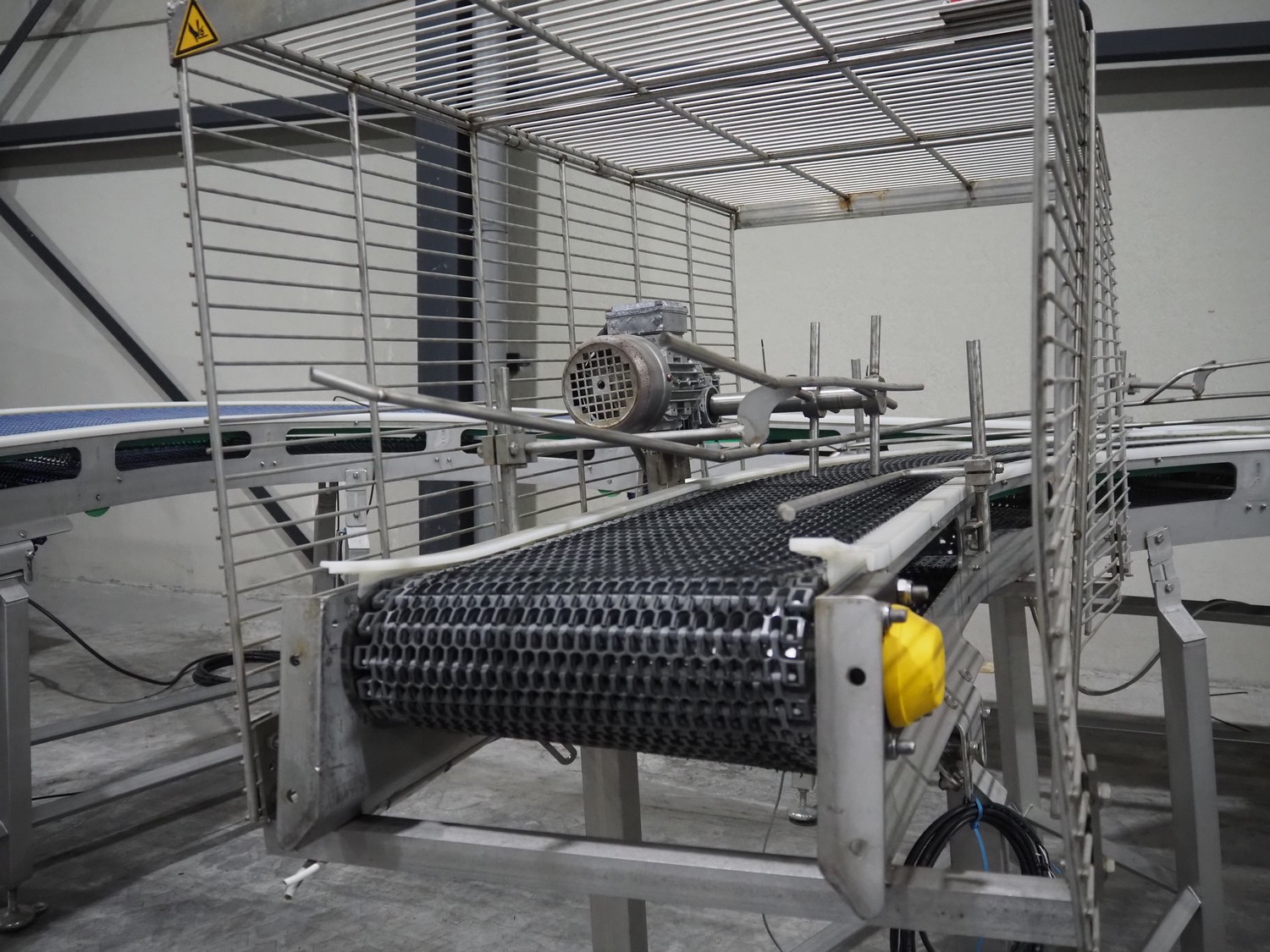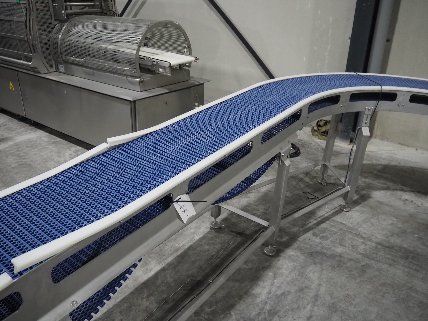 De Jager BV double 90° curve conveyor, type: 11-0608-02, year of construction: 01/2012, plastic mesh belts, belt width: 355 mm, total dimensions: 7800 mm x 4300 mm x 1400 mm.