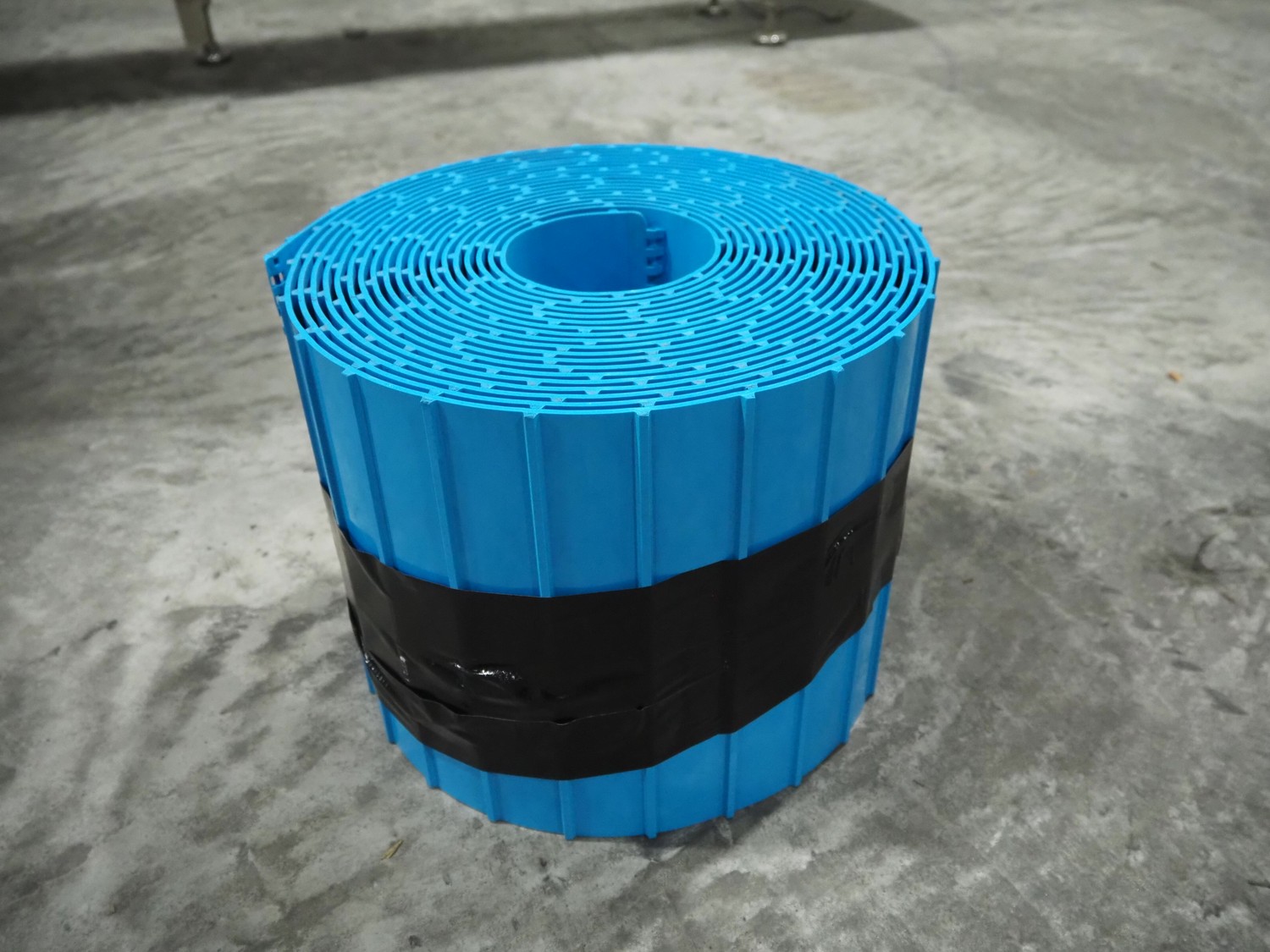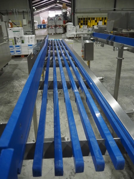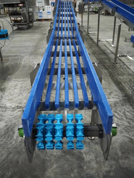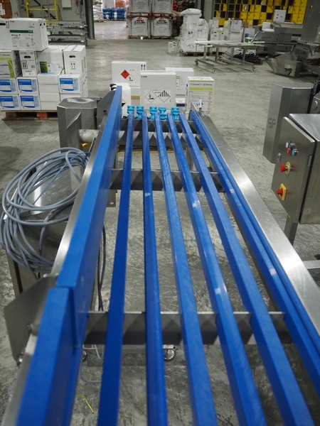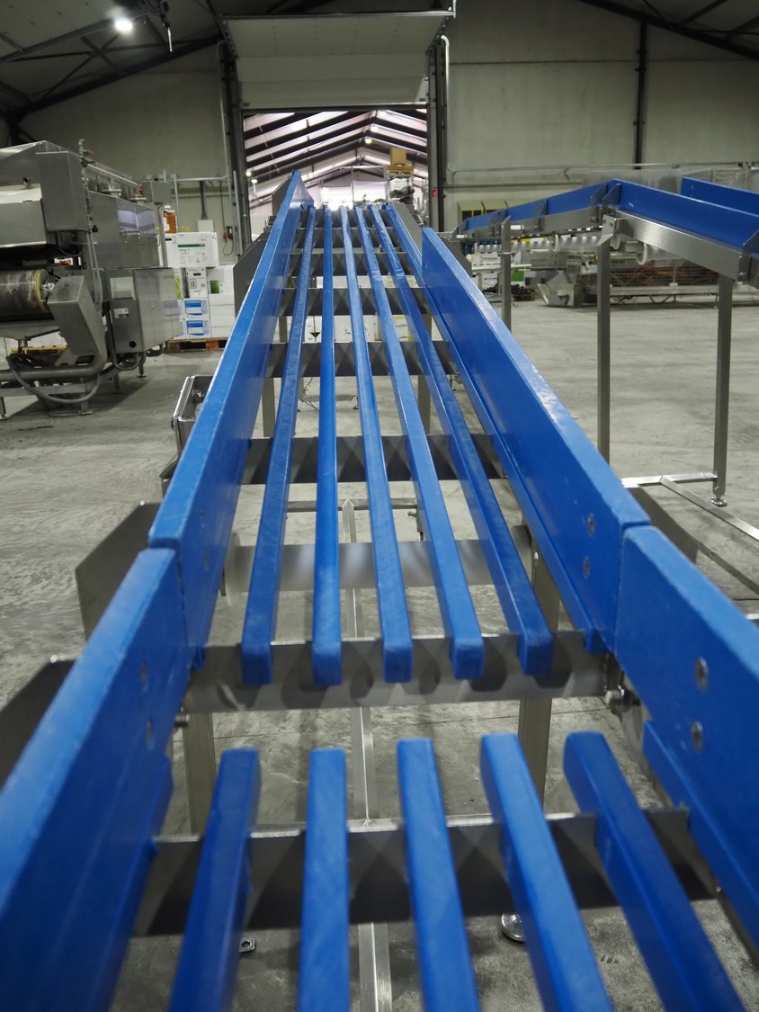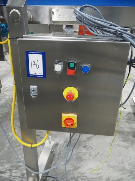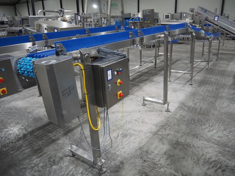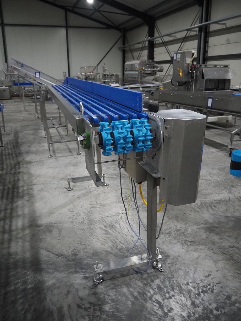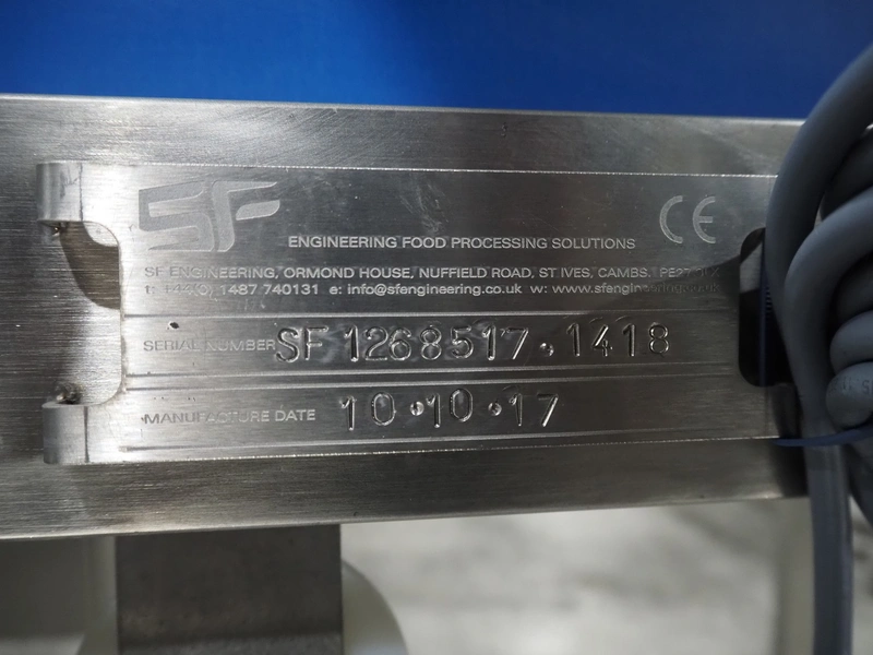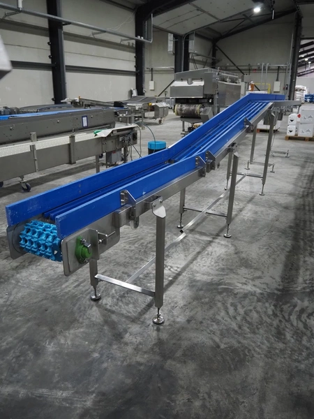 SF Engineering Food Processing Solutions elevating belt, serial number: SF 1268517.1418, year of construction: 10.10.17, s/s frame, belt width: 300 mm, elevating height: 1270 mm, total dimensions: 7530 mm x 650 mm x 1320 mm. Including plastic belt, belt width: 300 mm.