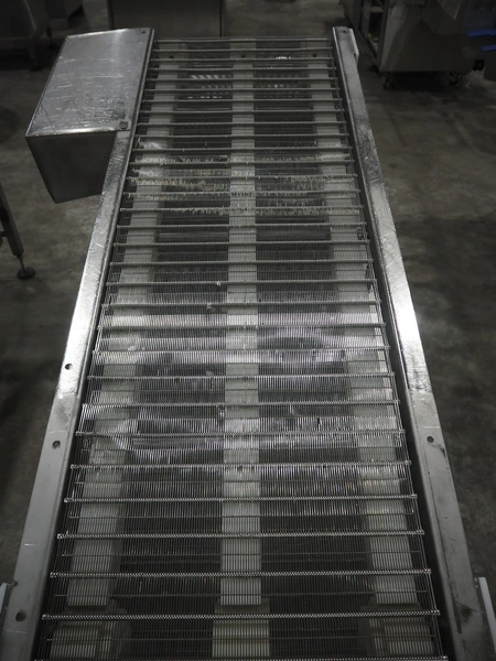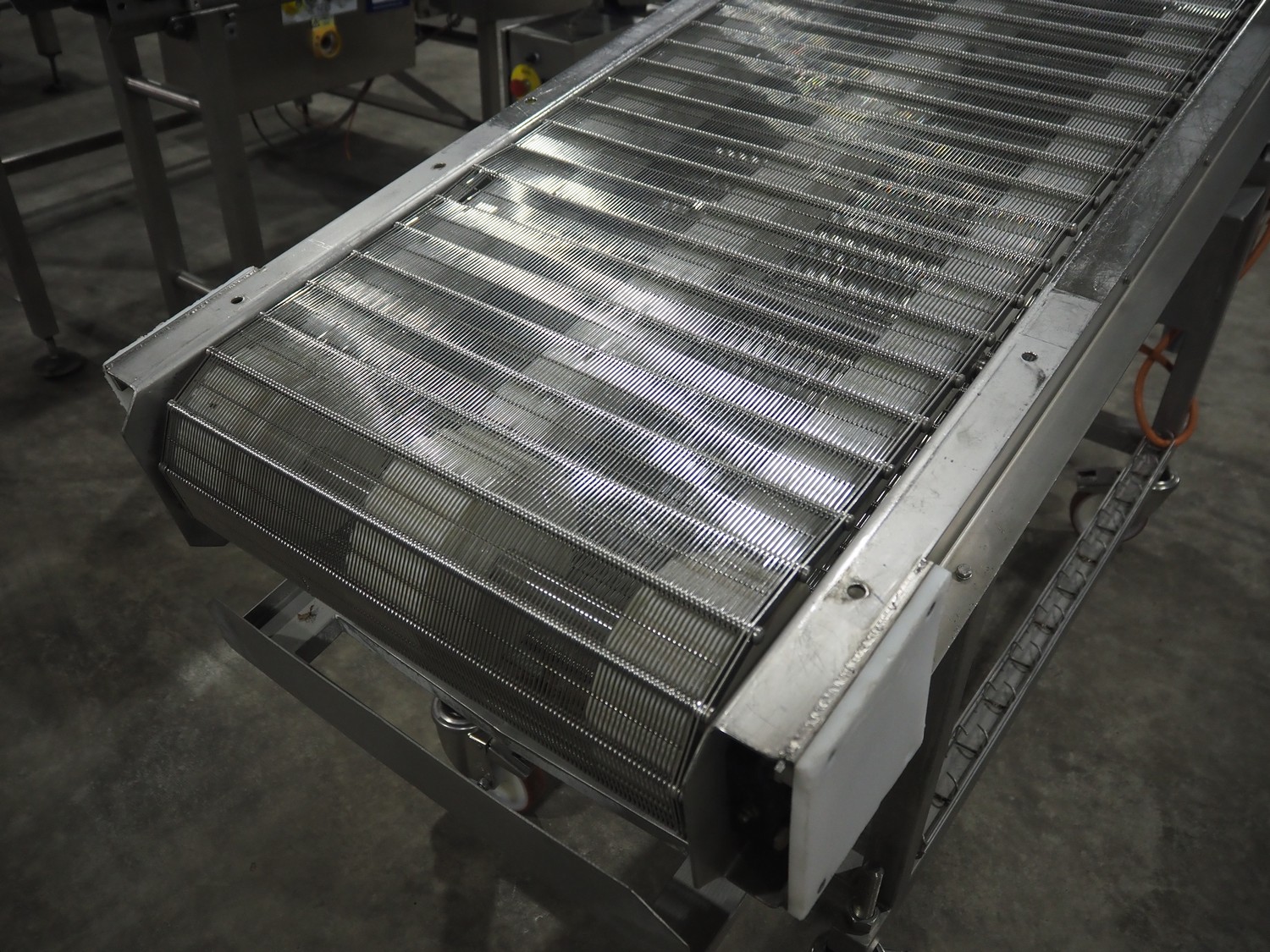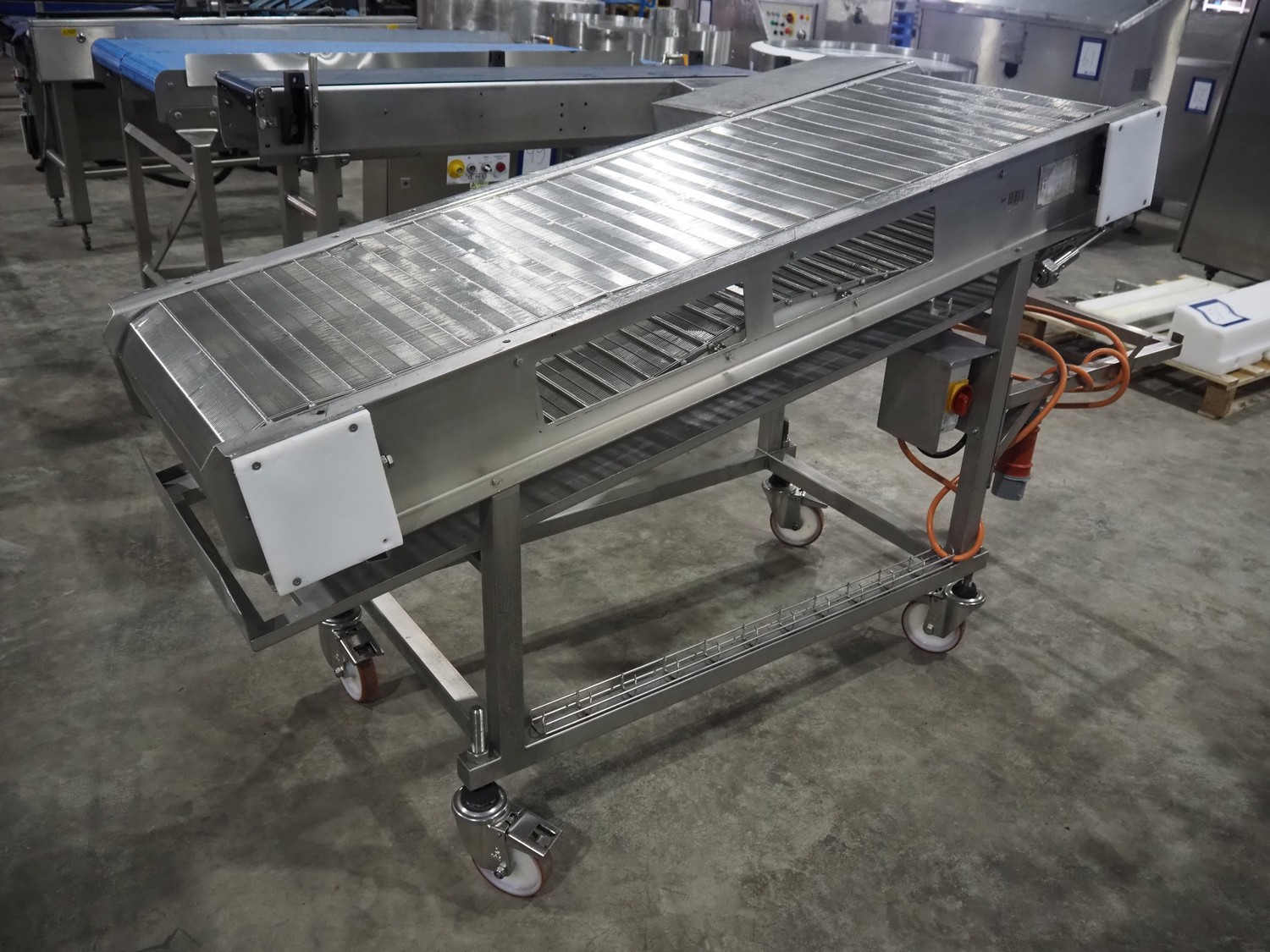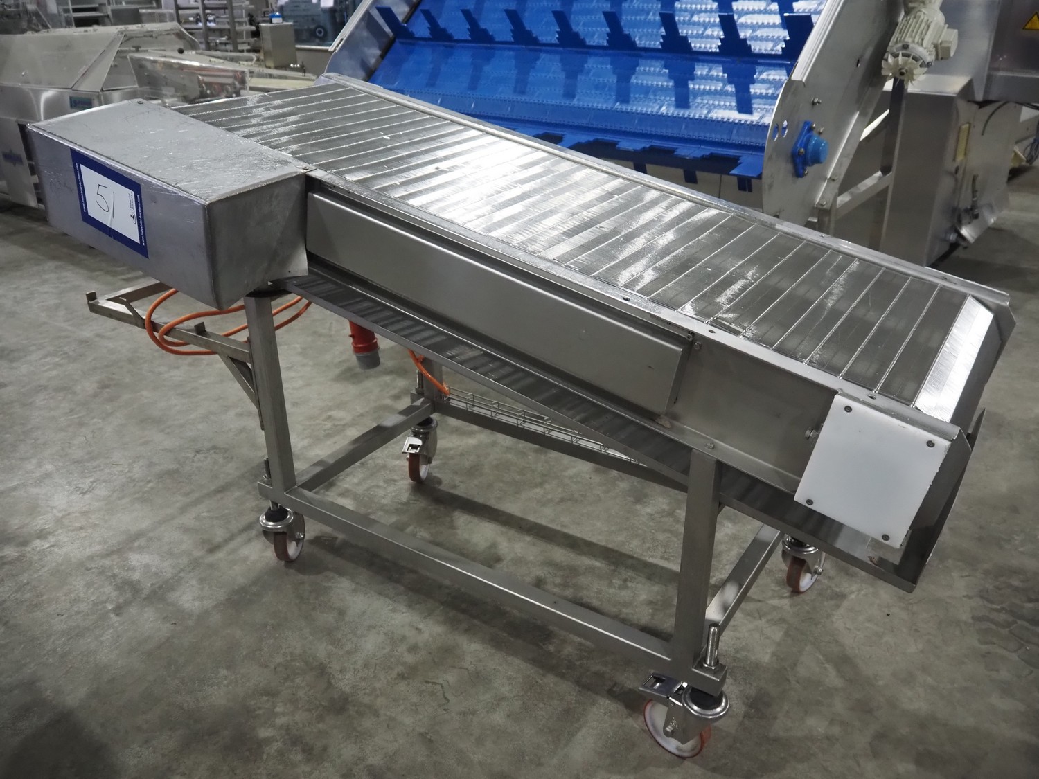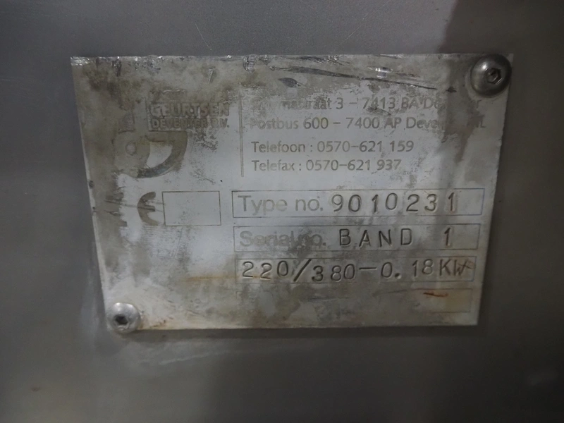 Machinefabriek Geurtsen Deventer B.V. mobile elevating belt, type: 9010231, serial number: BAND 1, 220/380 V, 0.18 kW, s/s mesh belt, belt width: 490 mm, elevating height: 1150 mm, total dimensions: 2000 mm x 840 mm x 1150 mm.