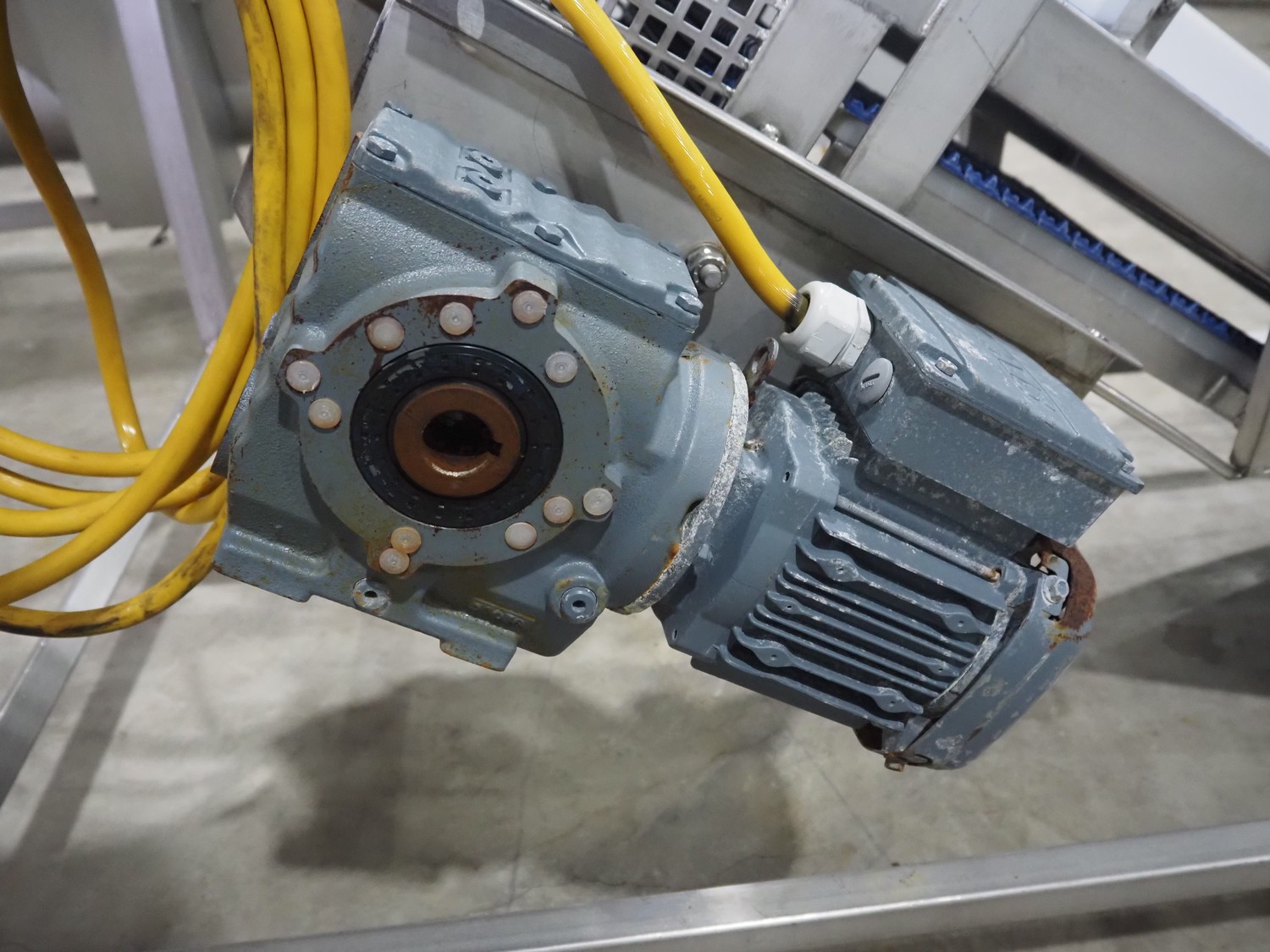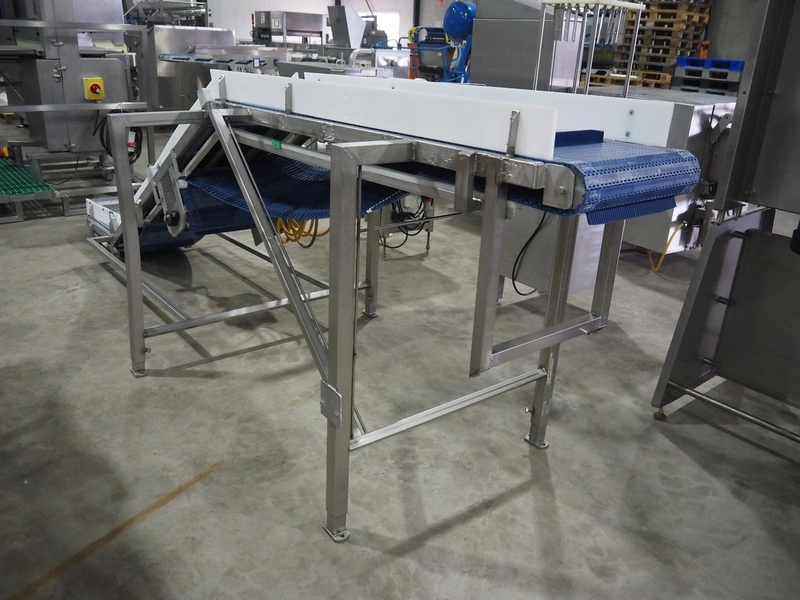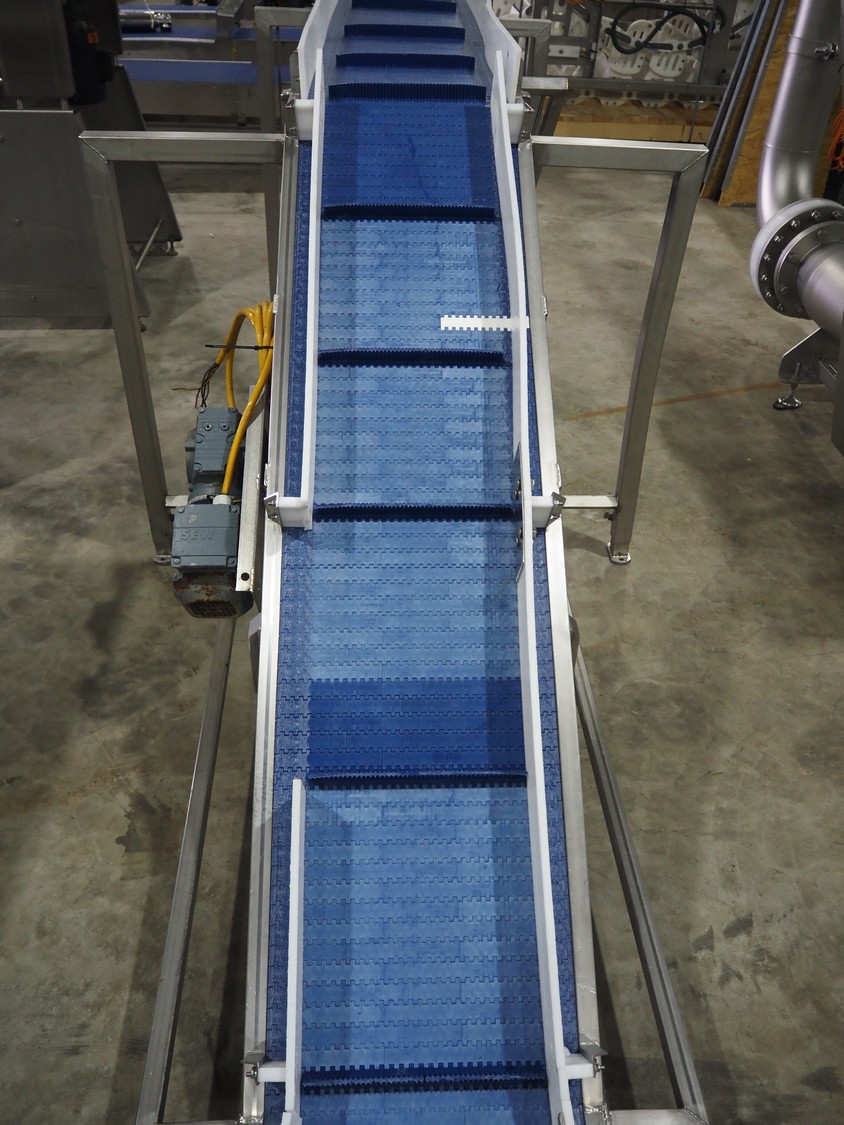 Elevating belt, s/s frame, plastic mesh belt, belt width: 405, working width: 325 mm, divider height: 25 mm, distance between dividers: 295 mm, elevating height: 1060 mm, total dimensions: 3750 mm x 1200 mm x 1190 mm.