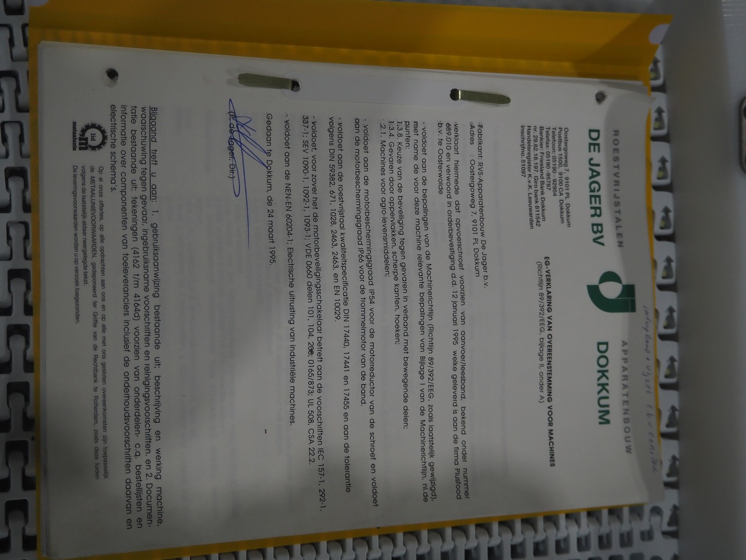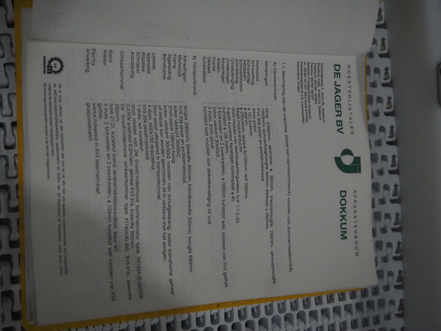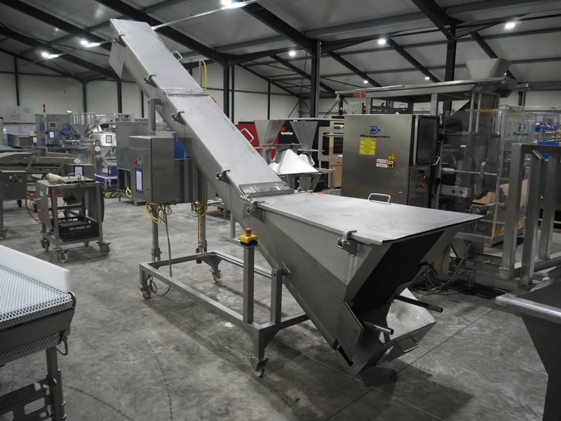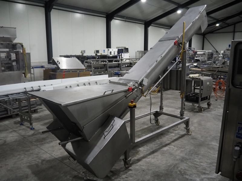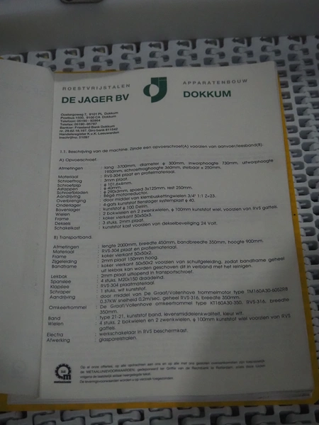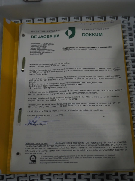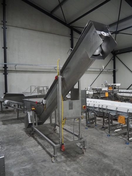 Roestvrijstalen-Apparatenbouw De Jager BV mobile elevating screw, number: 689.010, year of construction: March 1995, s/s screw, diameter screw: 250 mm, tier: 140 mm, elevating height: 2100 mm, total dimensions: 3800 mm x 1100 mm x 2600 mm.