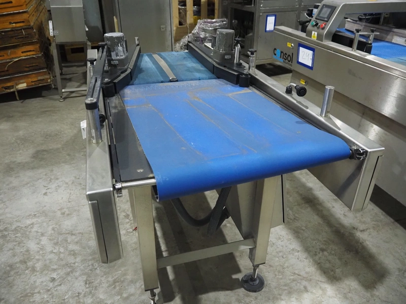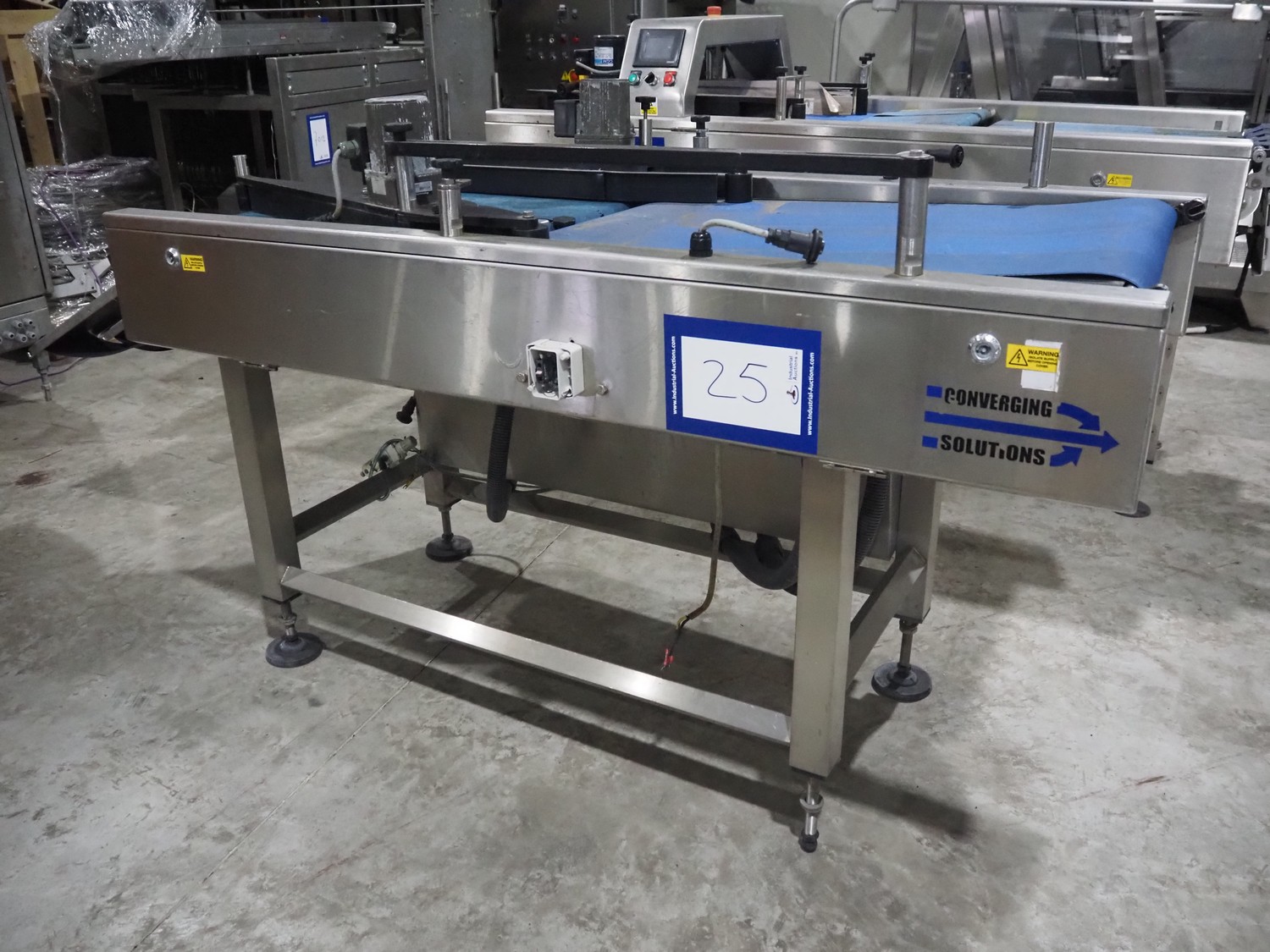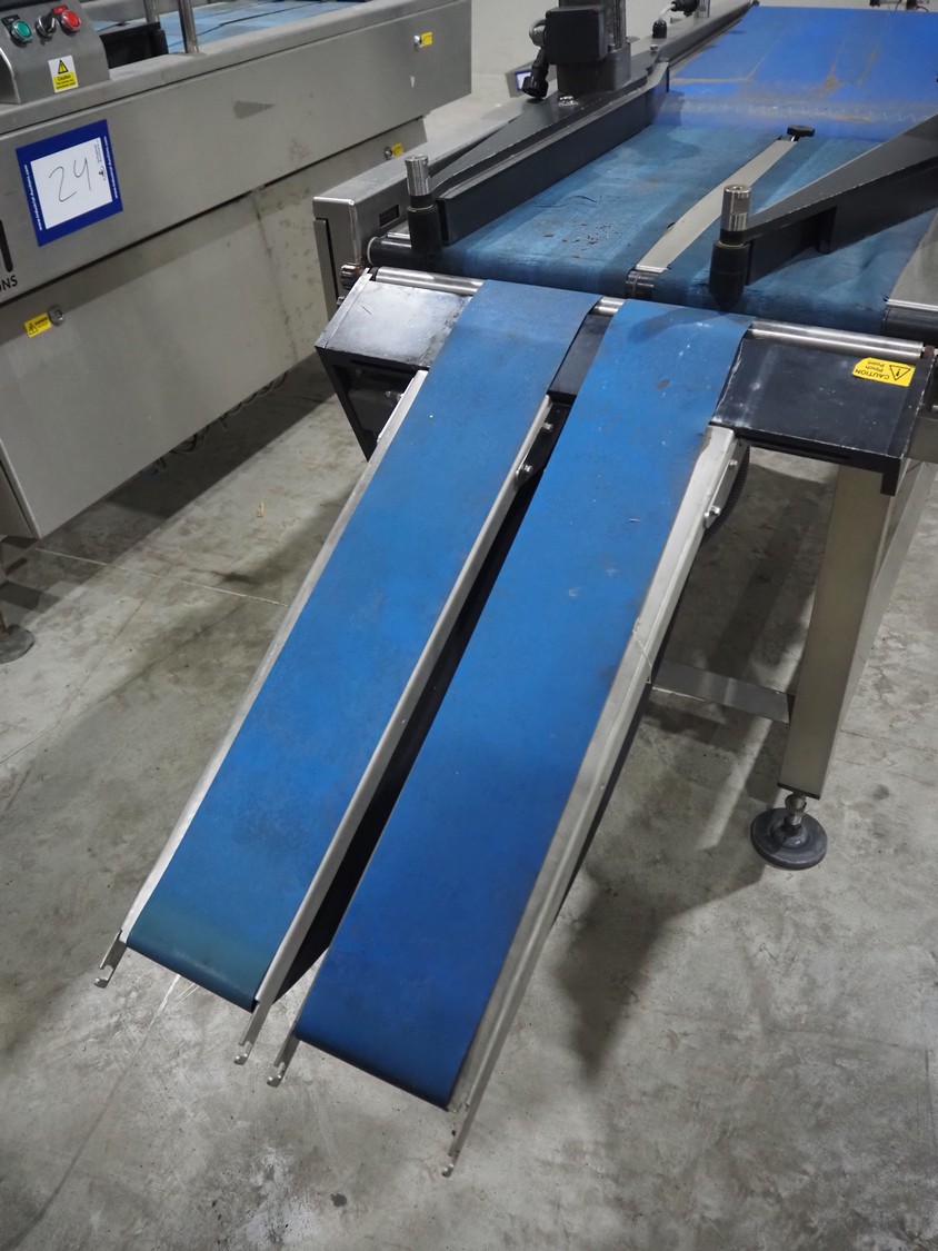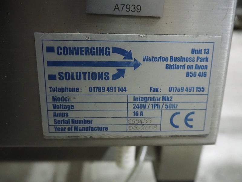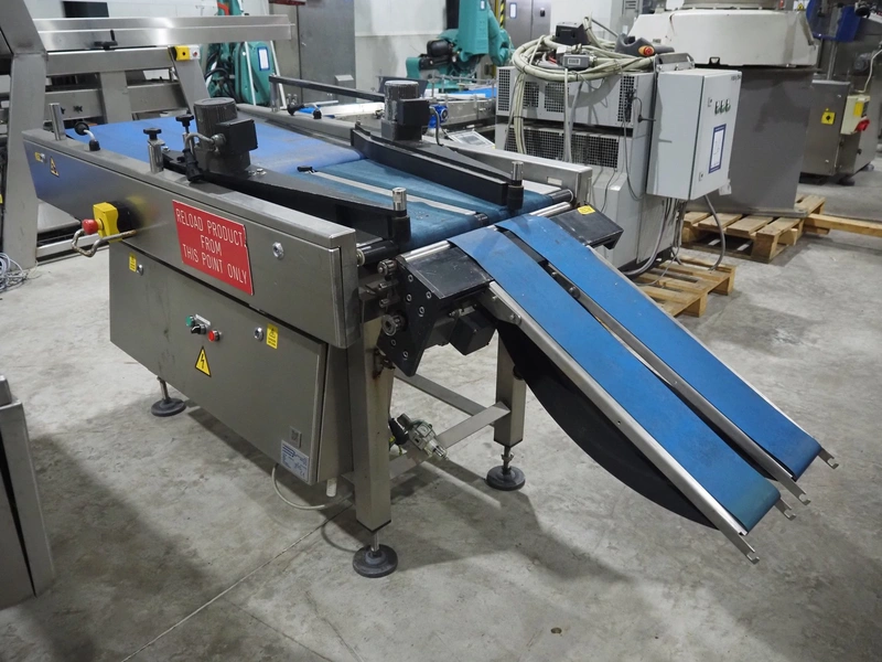 Converging Solutions converging lane dividing belt, model: Integrator Mk2, serial number: CS5455, year of construction: 08/2008, plastic belts, belt width: (2x) 225 mm, (1x) 625 mm, total dimensions: 1580 mm x 820 mm x 1120 mm.