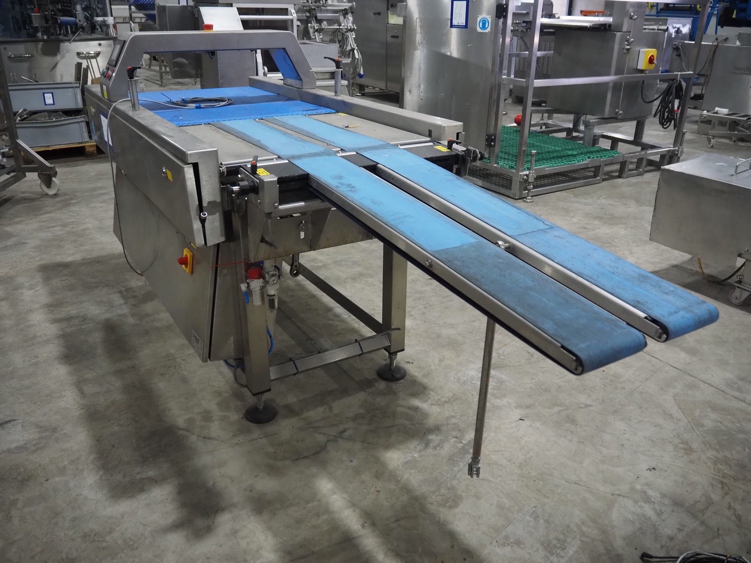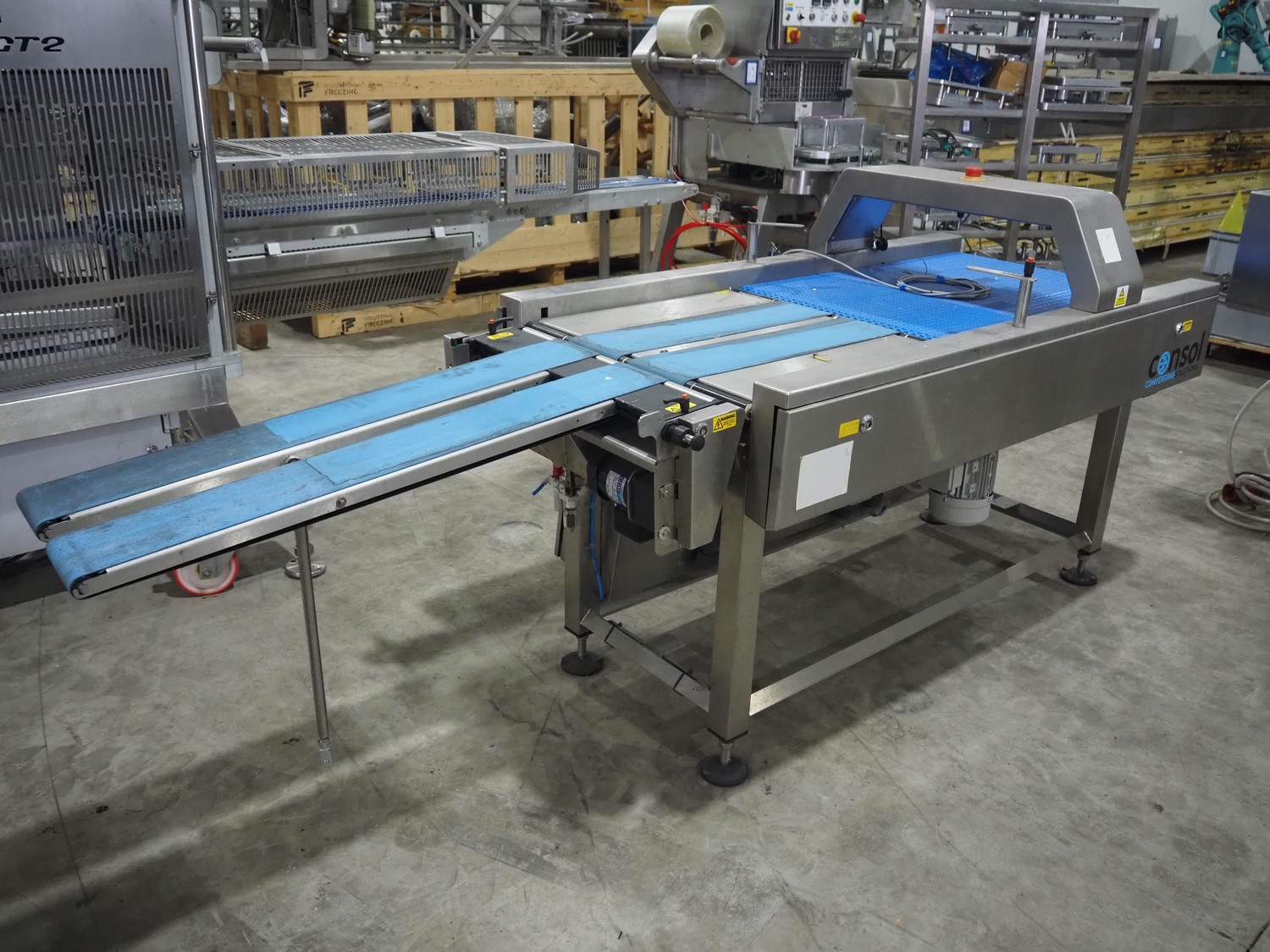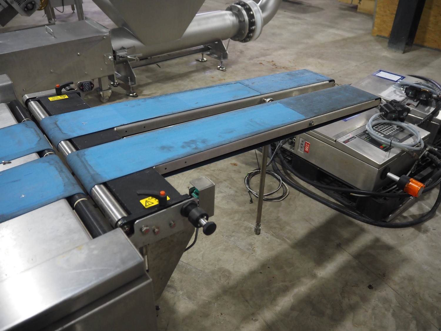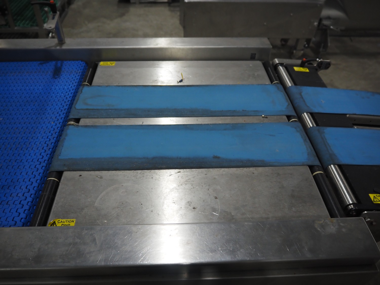Consol Converging Solutions lane dividing belt, model: INT3, serial number: CS 6696, year of construction: 2019, 230 V, 16 A, plastic belts, belt width: (1x) 680 mm, (2x) 135 mm, total dimensions: 2650 mm x 860 mm x 1150 mm.