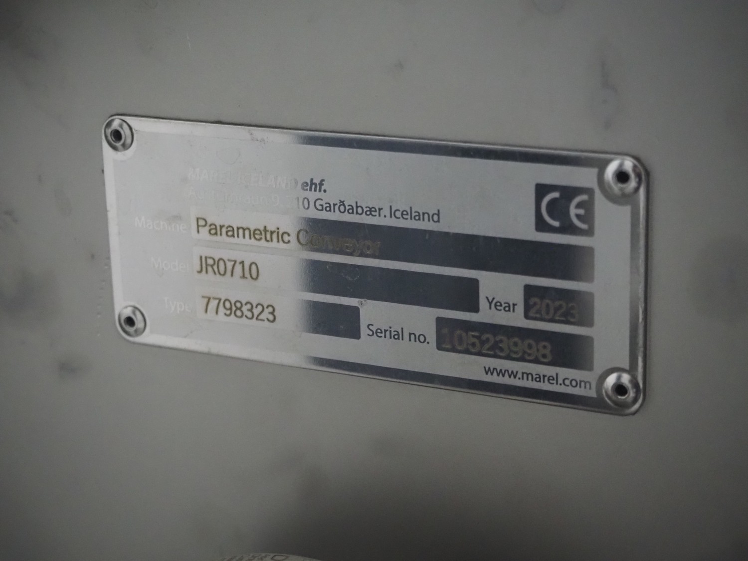Marel transport belt, model: JR0710, type: 7798323, serial number: 10523998, year of construction: 2023, plastic belt, belt width: 405 mm, total dimensions: 850 mm x 600 mm x 970 mm.