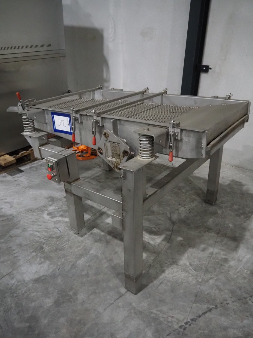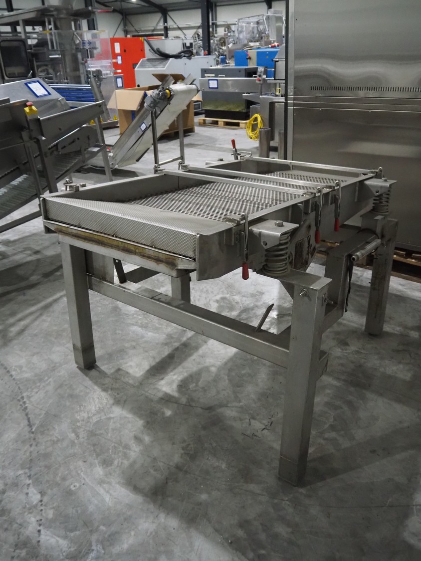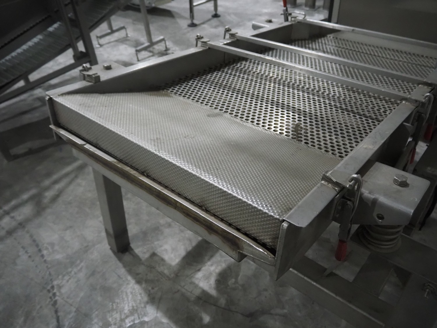 S/s vibrating gutter with sieve, gutter width: 730 mm, perforations: Ø 13 mm, total dimensions: 1850 mm x 1400 mm x 1050 mm. Without vibrating motors.