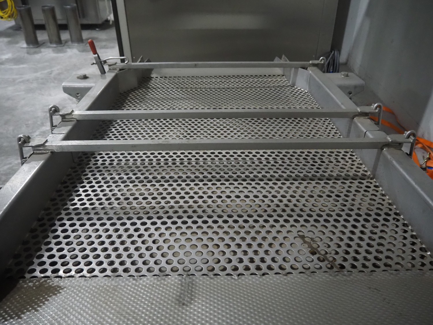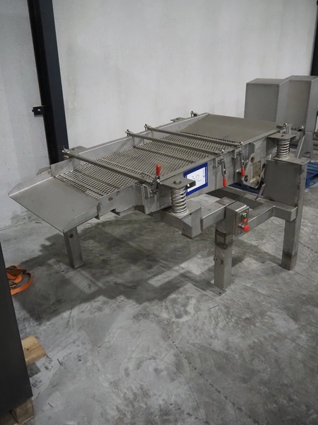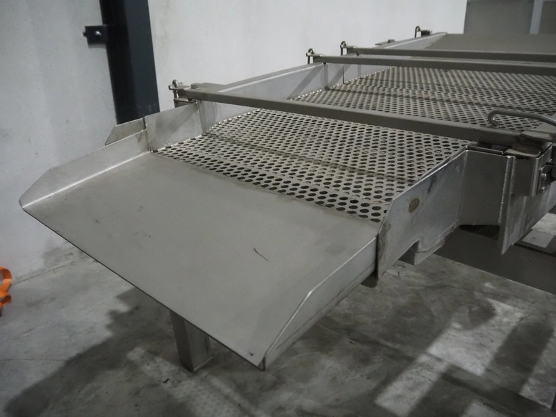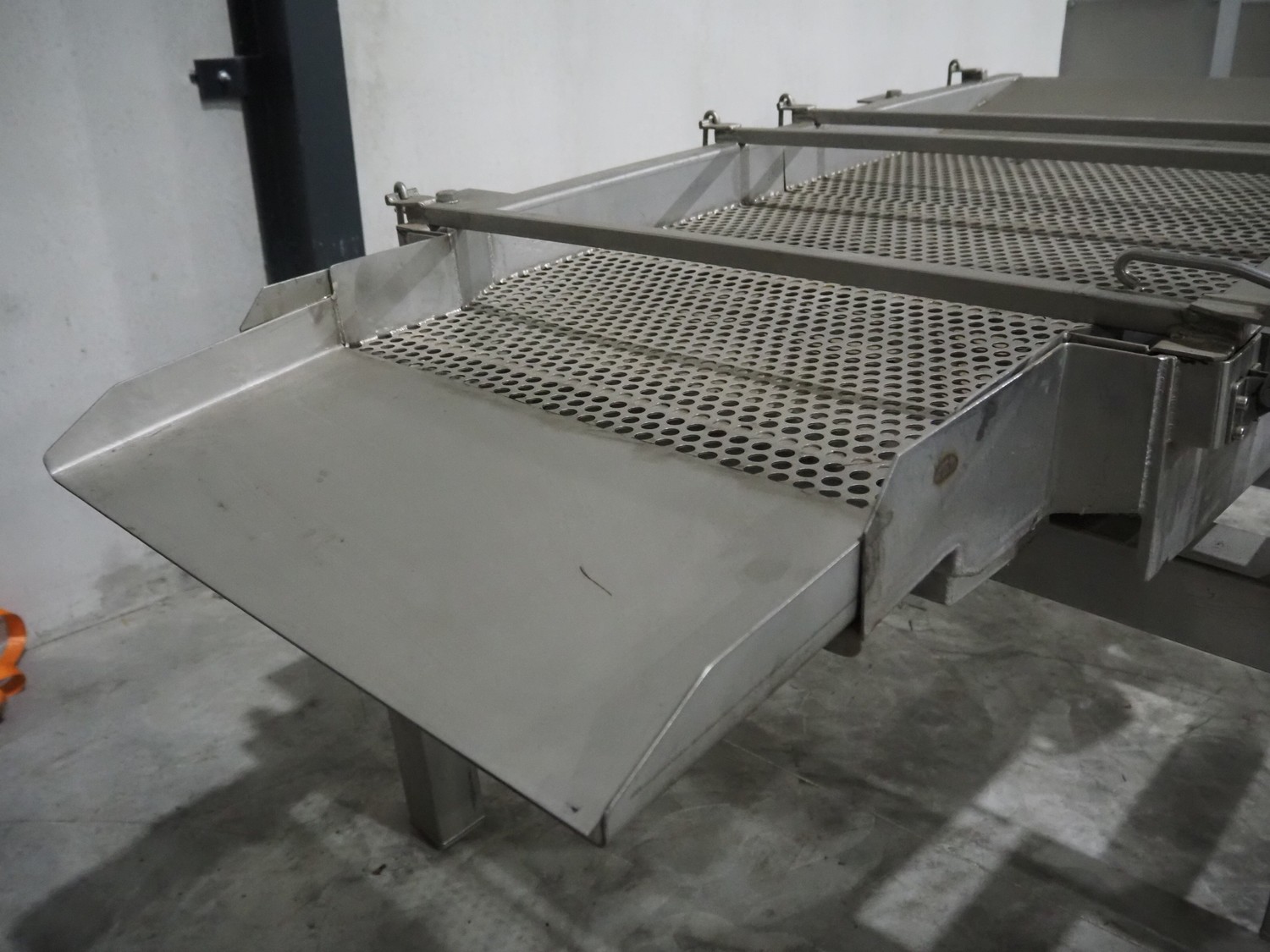 S/s vibrating gutter with sieve, gutter width: 730 mm, perforations: Ø 13 mm, total dimensions: 1850 mm x 1400 mm x 1050 mm. Without vibrating motors.