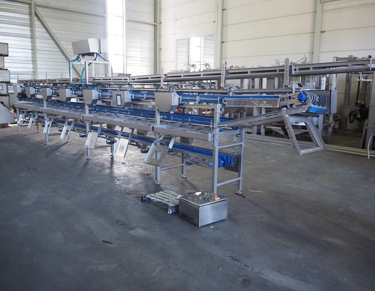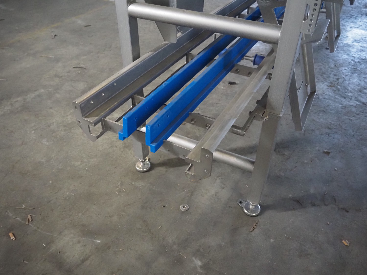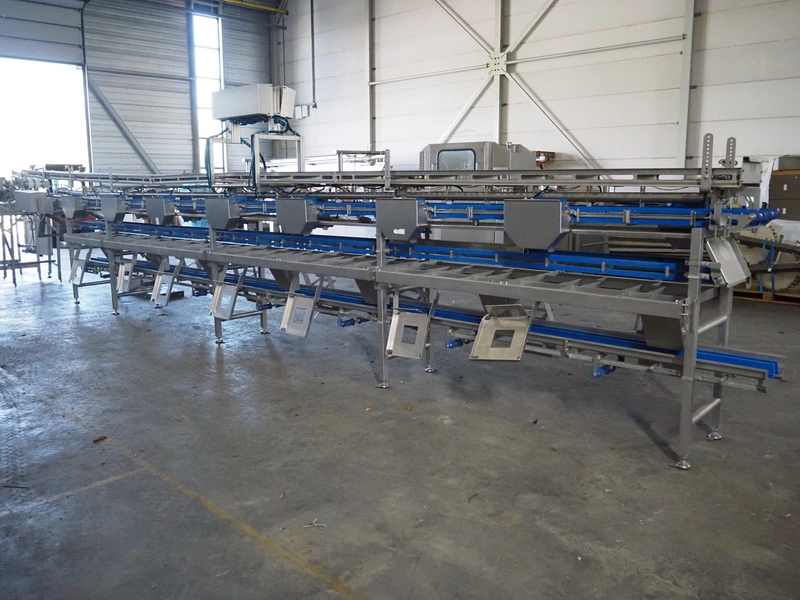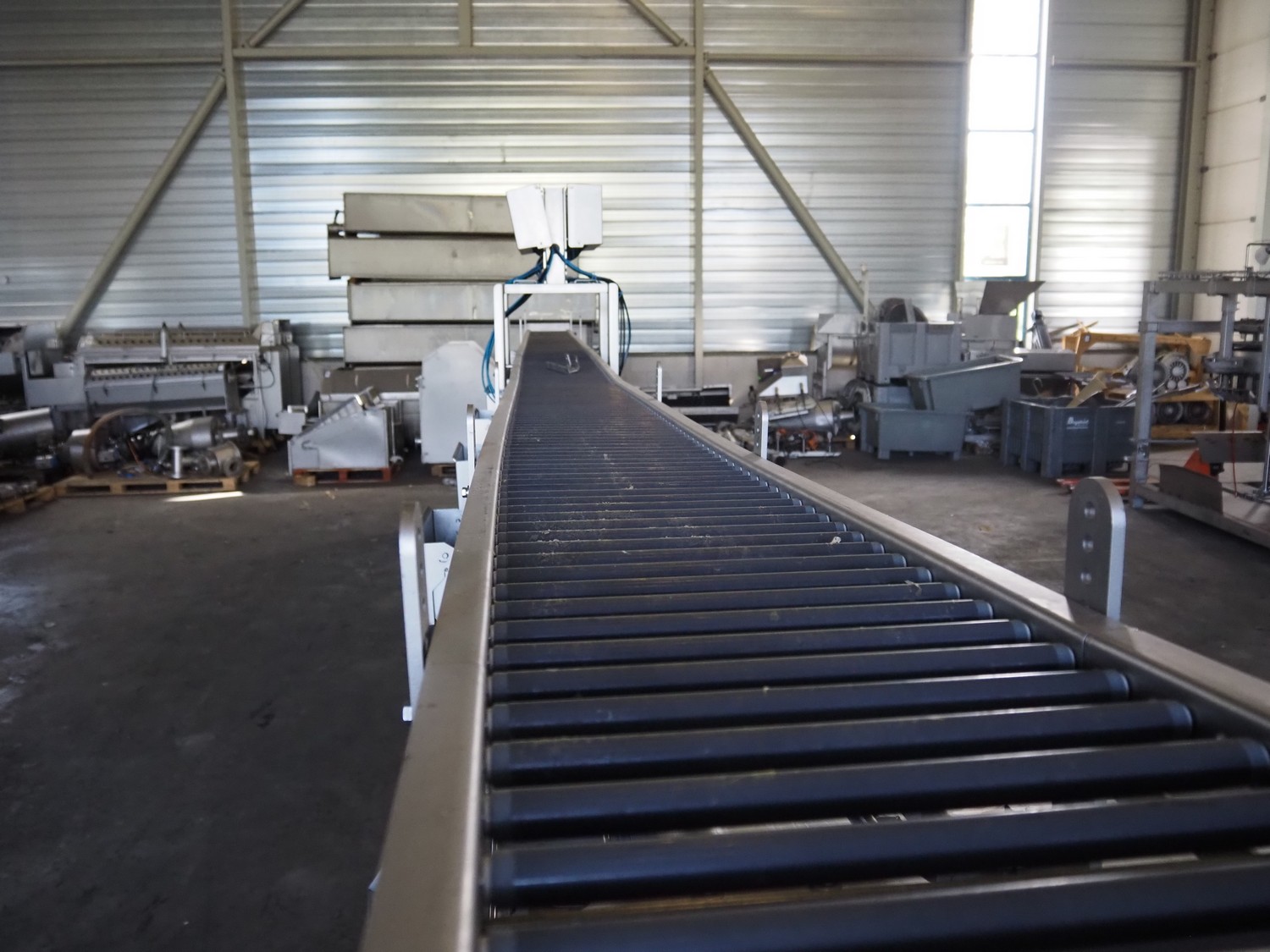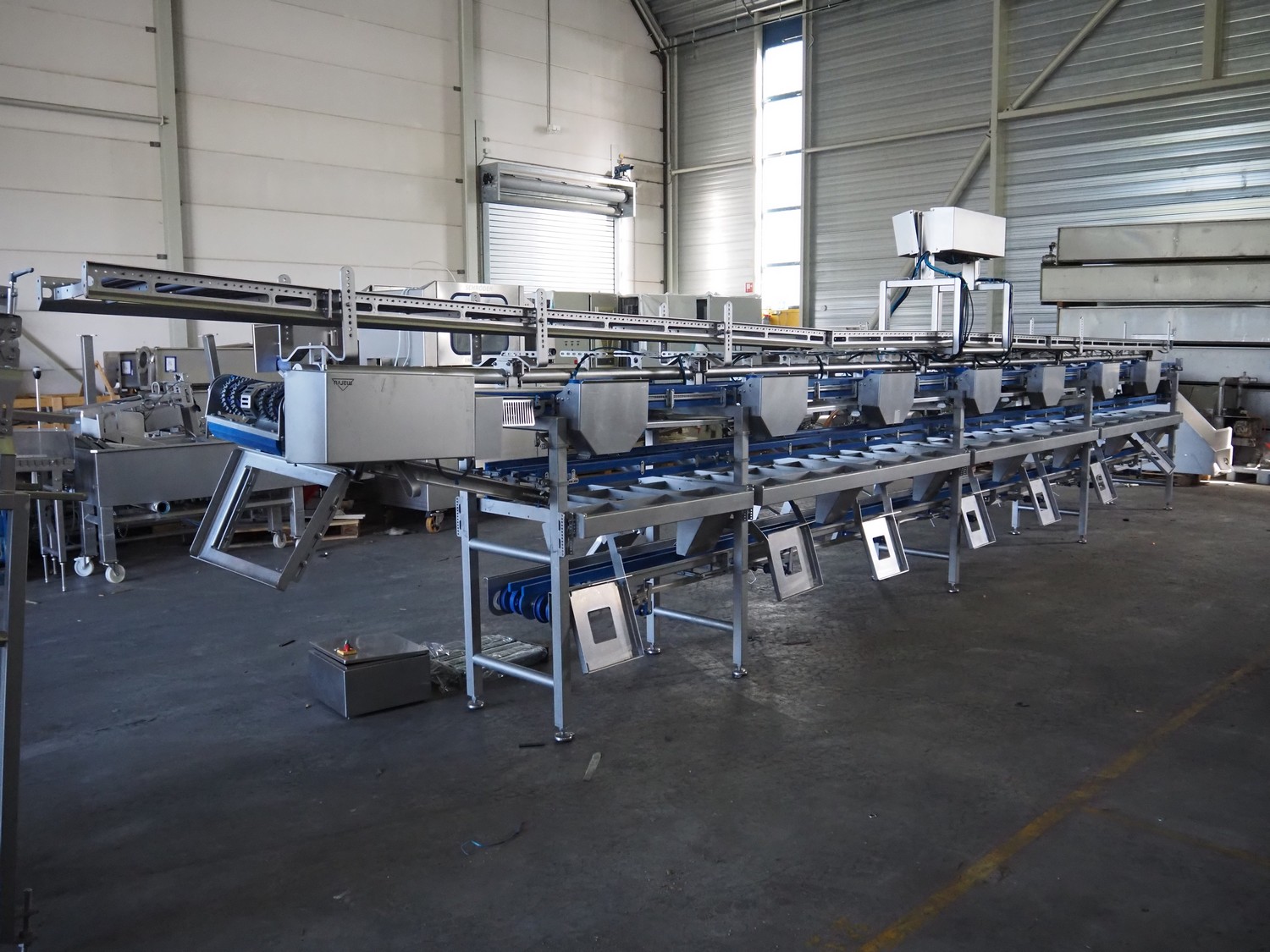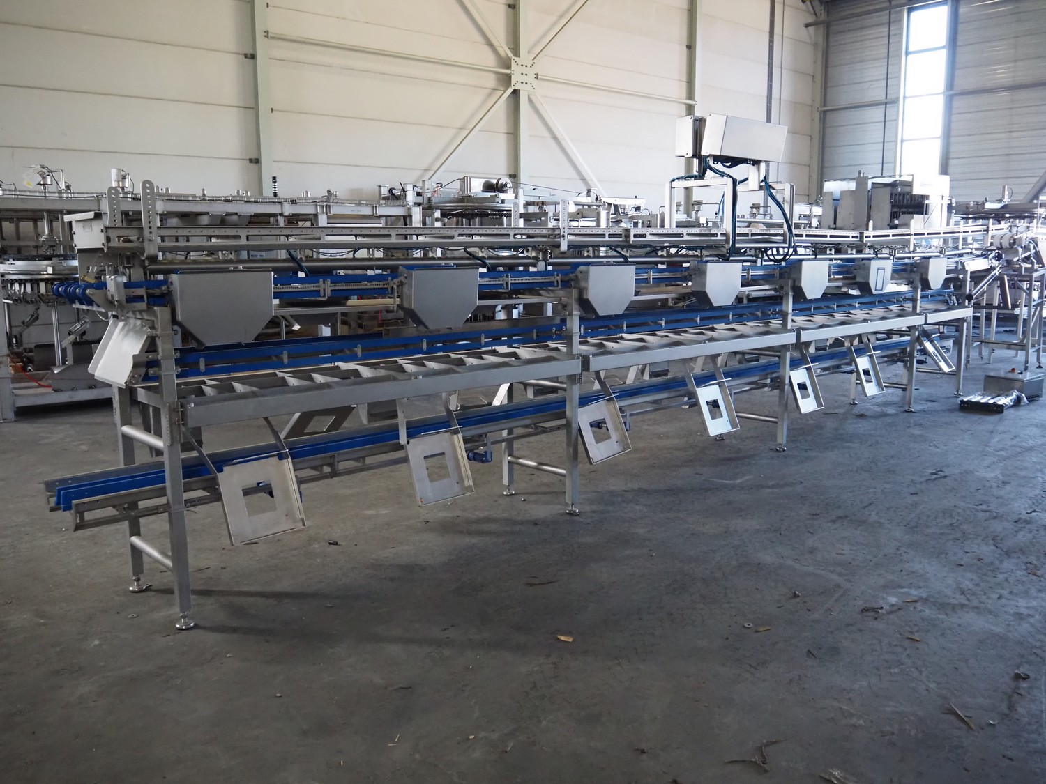 Marvu grader belt, type: 725, serial number: 001, year of construction 2016, 230-400 V, 50 Hz, weight: 850 kg, 14 outfeed stations, plastic rollers, roller width: 300 mm, total possible belt width: 375 mm, total dimensions: 10000 mm x 1100 mm x 2400 mm. Missing belt.