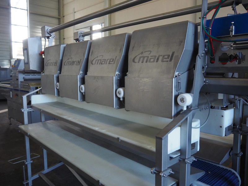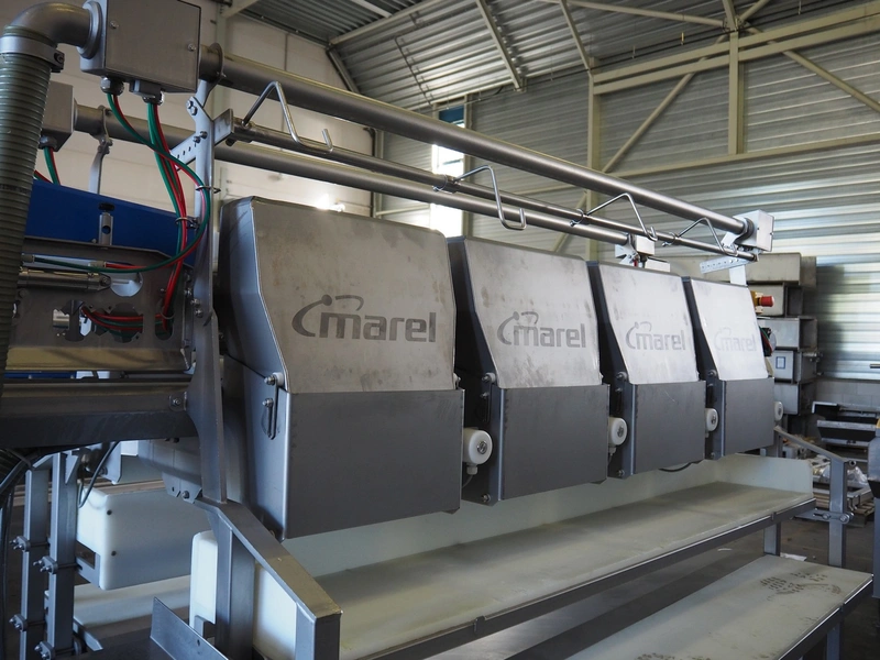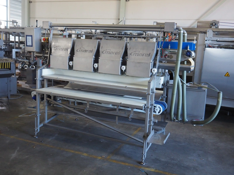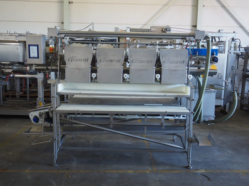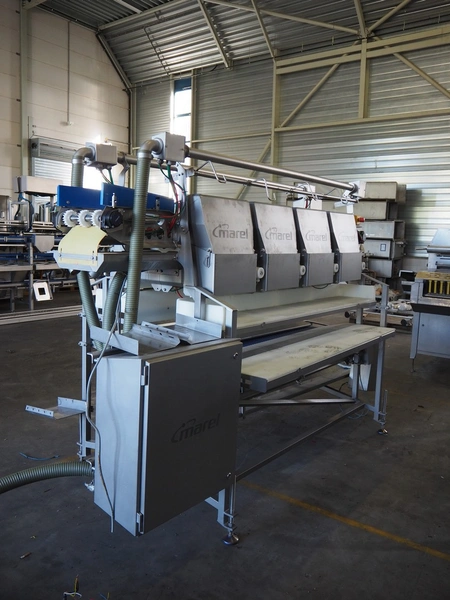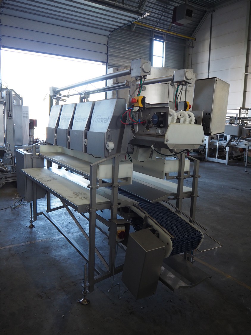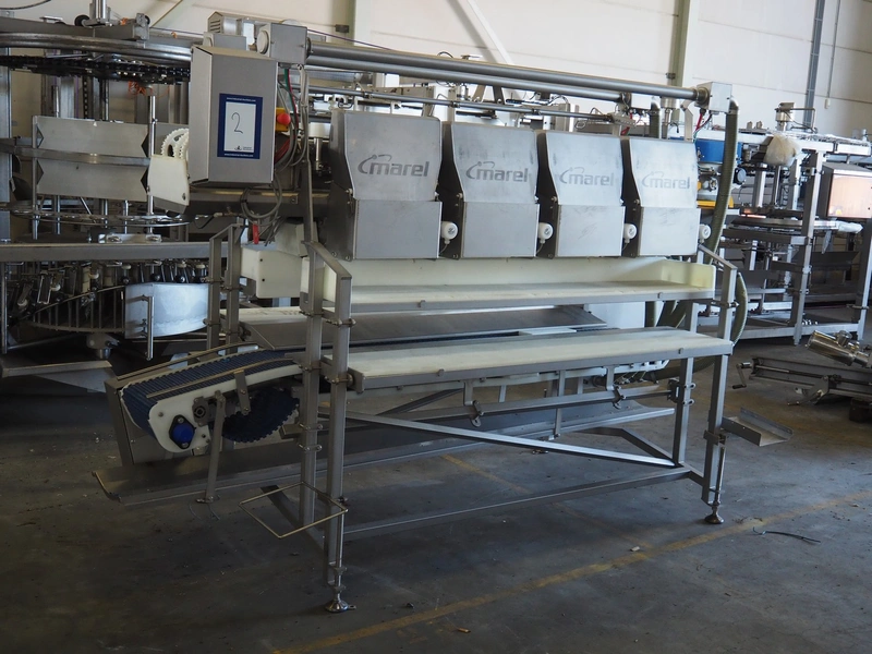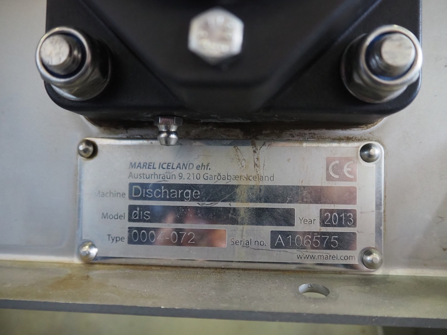 Marel Iceland ehf. Checkweigher for grader system, model: dis, type: 0004-072, serial number: A106575, year of construction: 2013, 8 stations, total possible belt width: 330 mm, plastic mesh belt, belt width: 300 mm, total dimensions: 3300 mm x 1400 mm x 1940 mm.