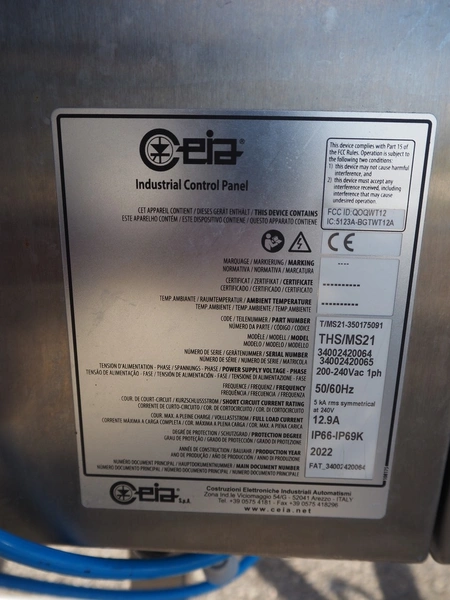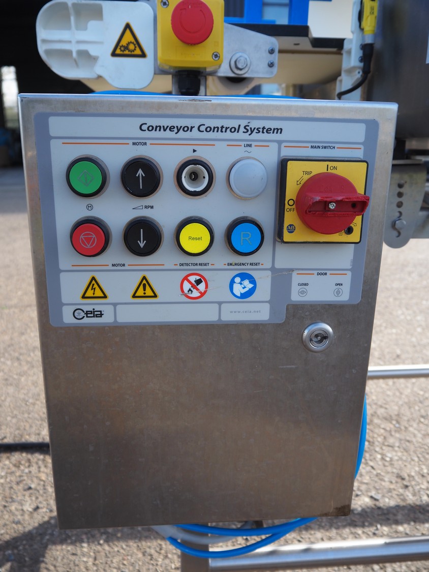 Ceia metal detector with rejector, model: THS/MS21, serial number: 34002420064/34002420065, year of construction: 2022, 200-240 Vac, 1 Ph, 50/60 Hz, 12.9 A, plastic belt, belt width: 300 mm, clearance: 350 mm x 140 mm, total dimensions: 1450 mm x 1200 mm x 1450 mm.