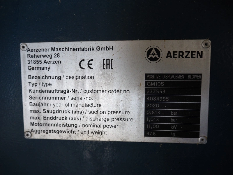 Aerzen positive displacement blower, type: GM10S, serial number: 4084995, year of construction: 2020, nominal power: 11 kW, weight: 476 kg, dimensions: 1200 mm x 940 mm x 1400 mm.