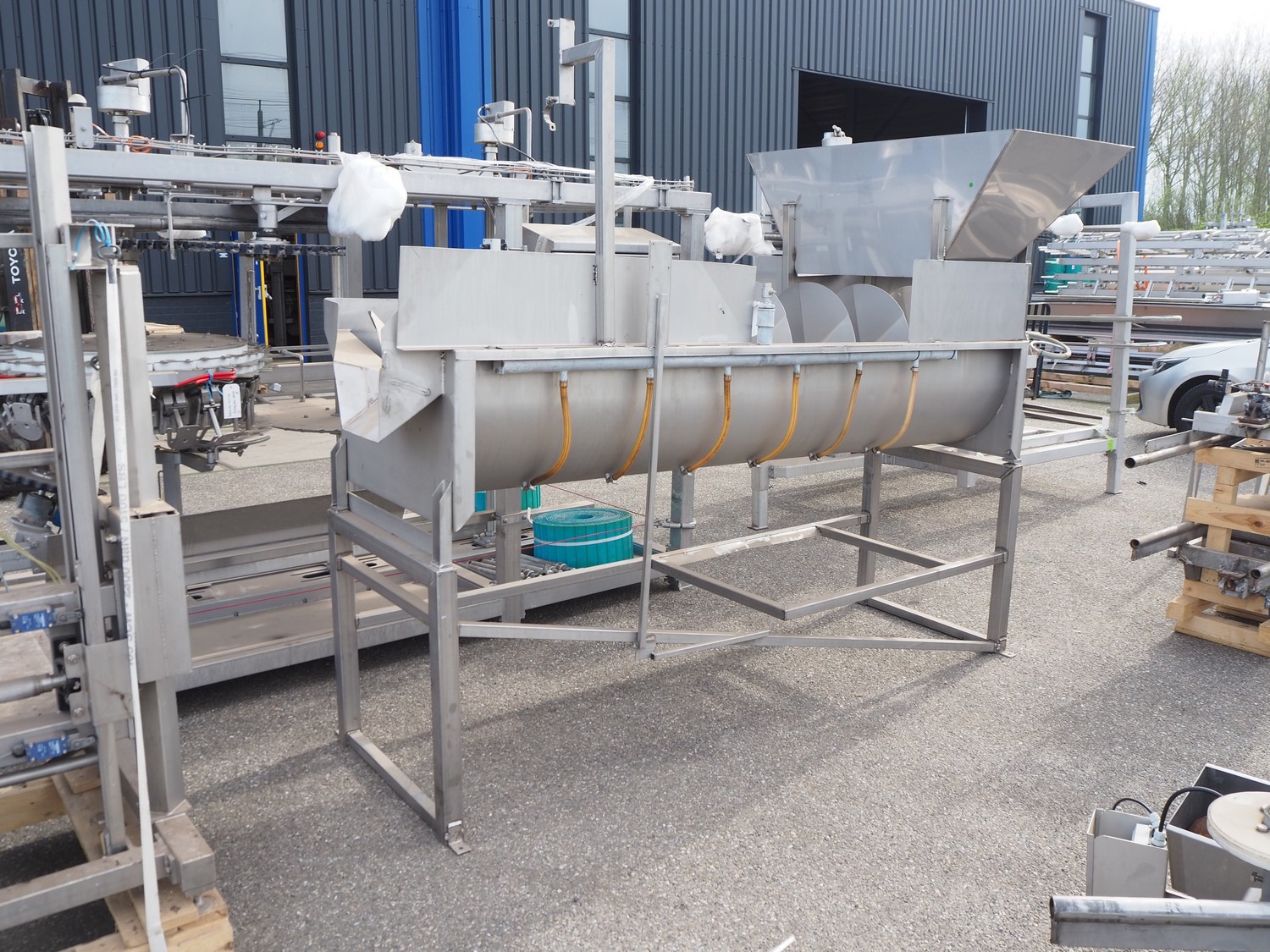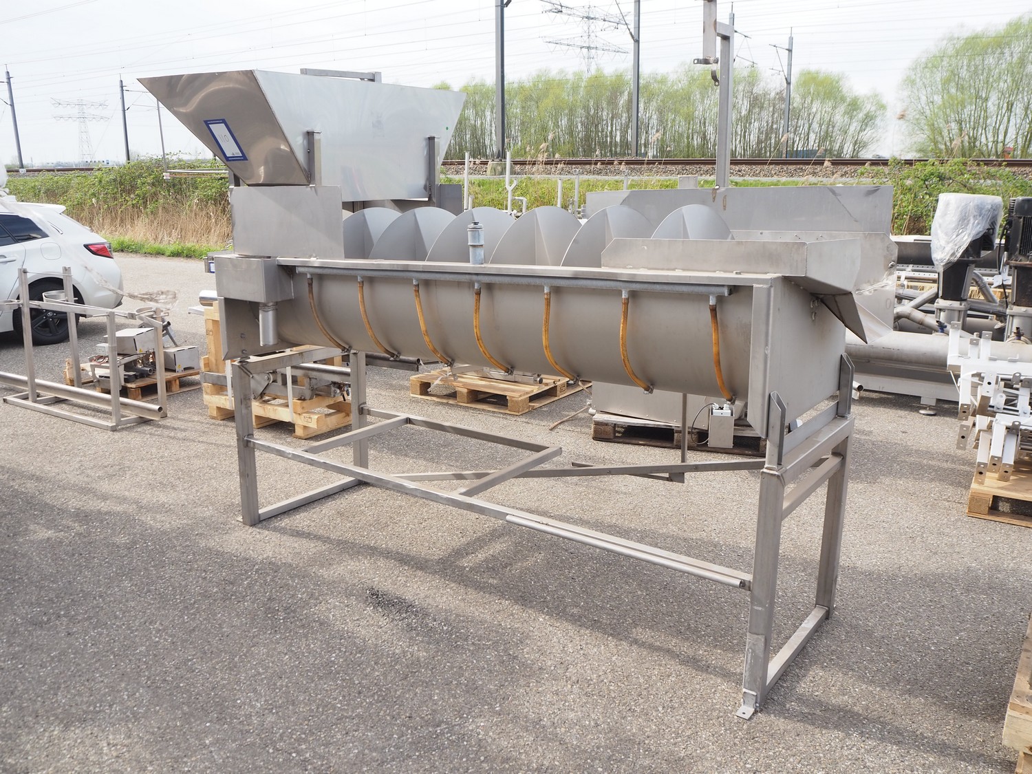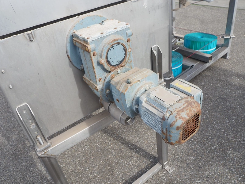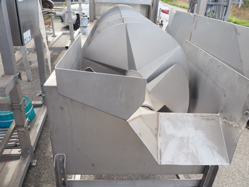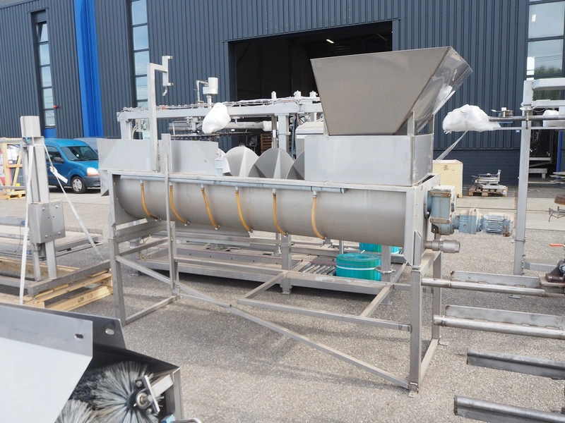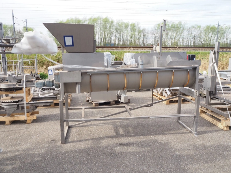 S/s scalding screw with infeed funnel, screw width: 600 mm, tier: 290 mm, total dimensions: 3200 mm x 1100 mm x 2060 mm.