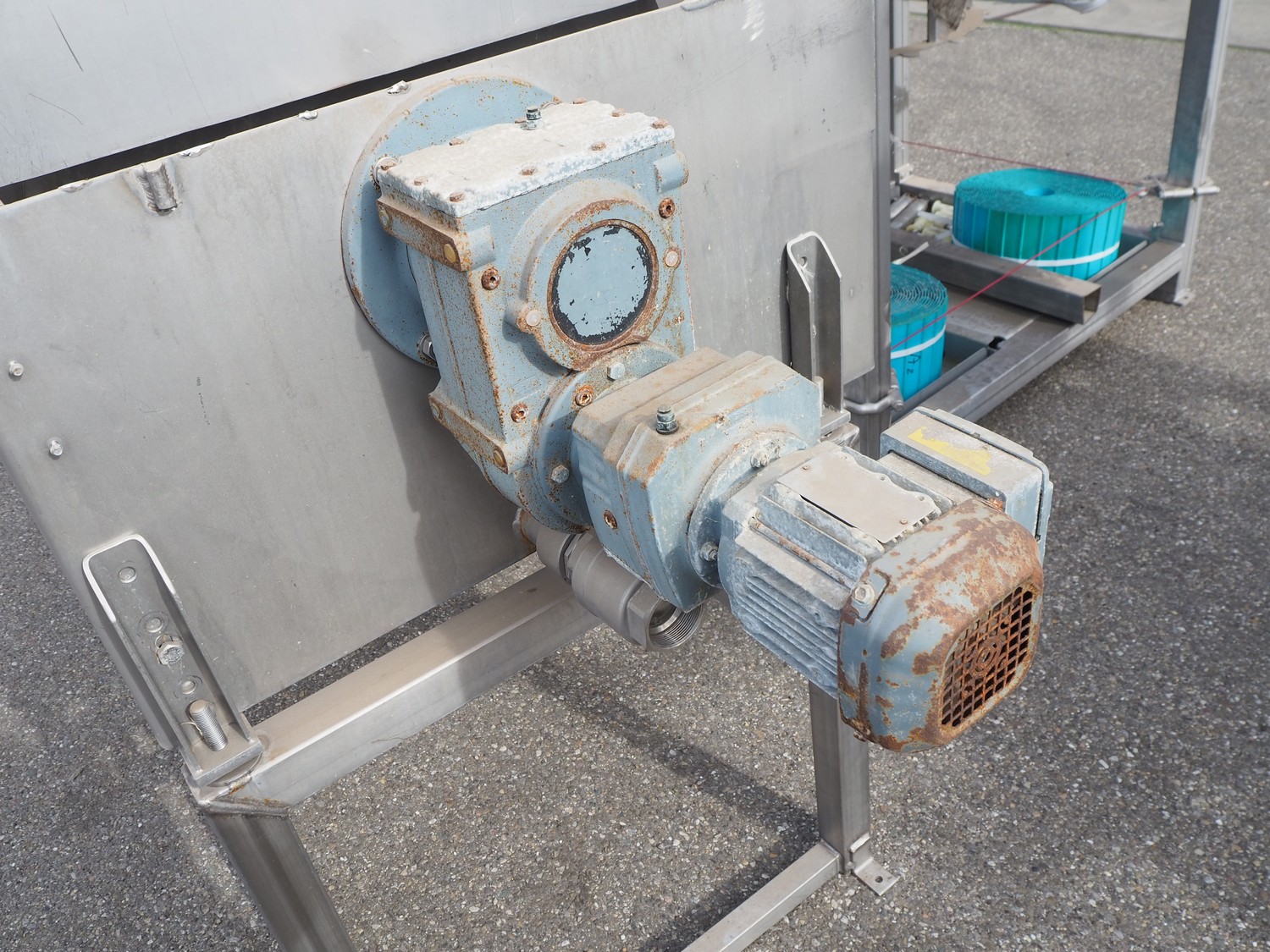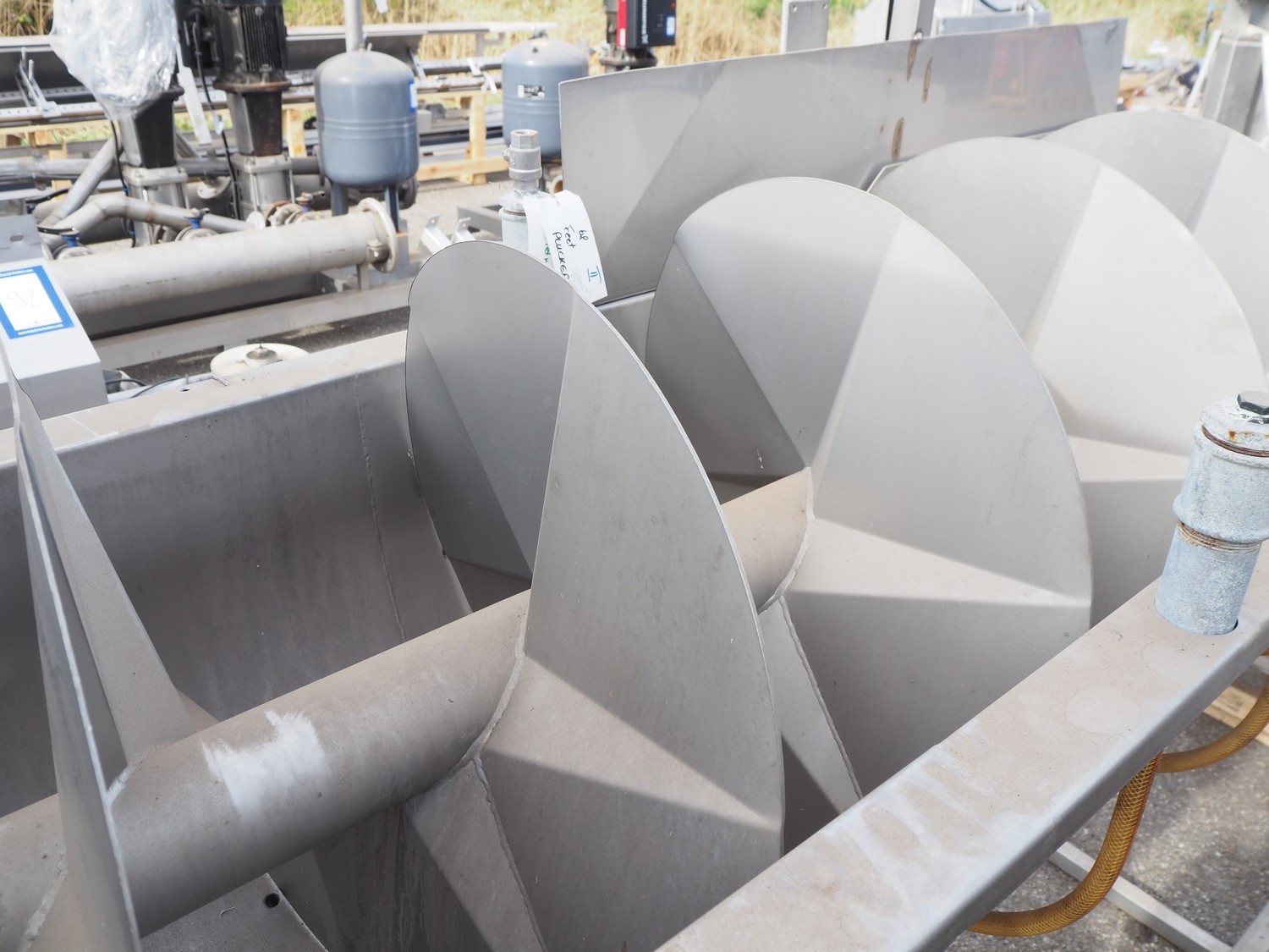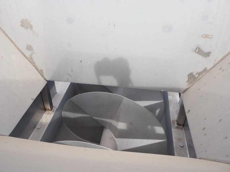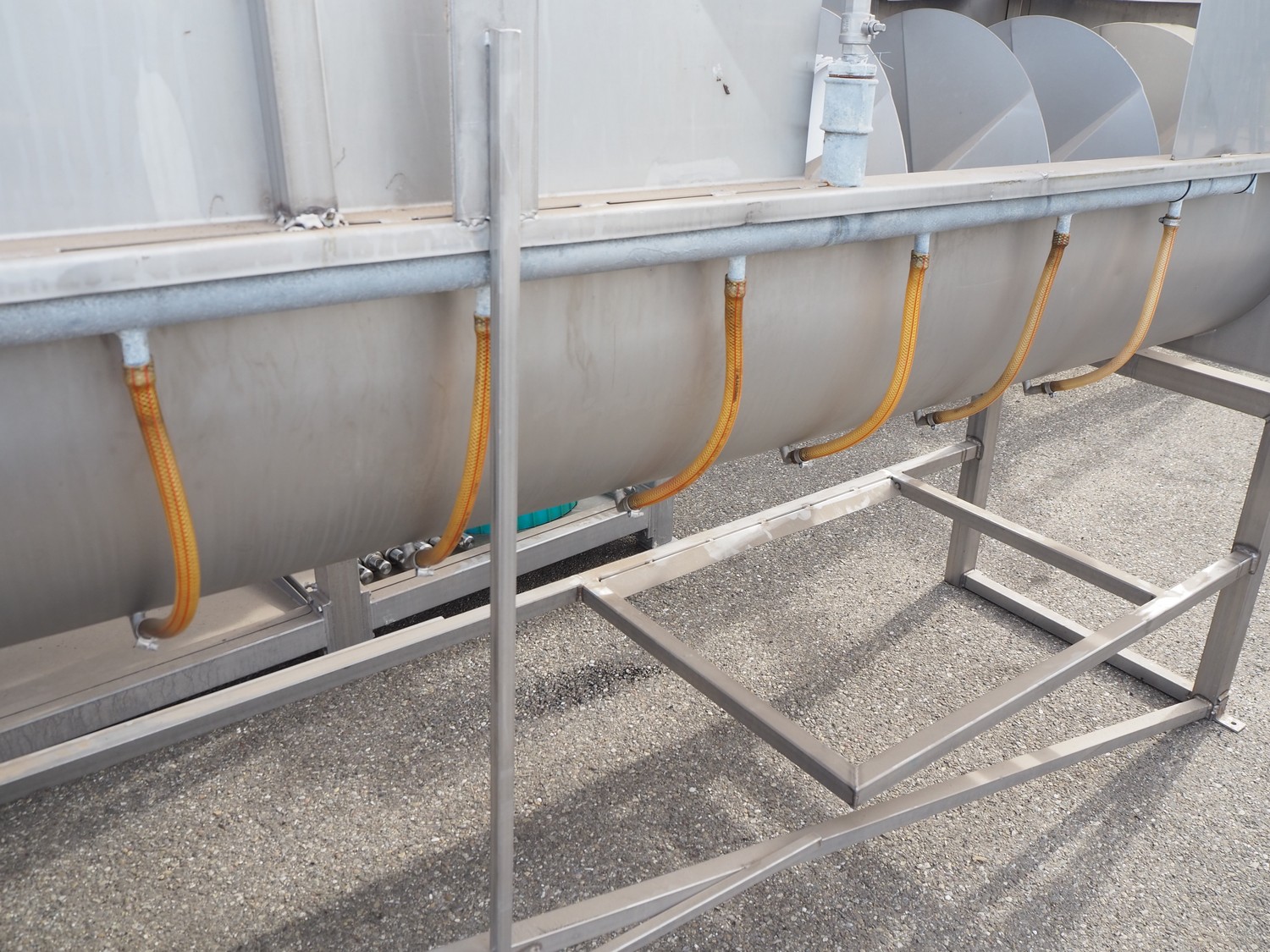 S/s scalding screw with infeed funnel, screw width: 600 mm, tier: 290 mm, total dimensions: 3200 mm x 1100 mm x 2060 mm.