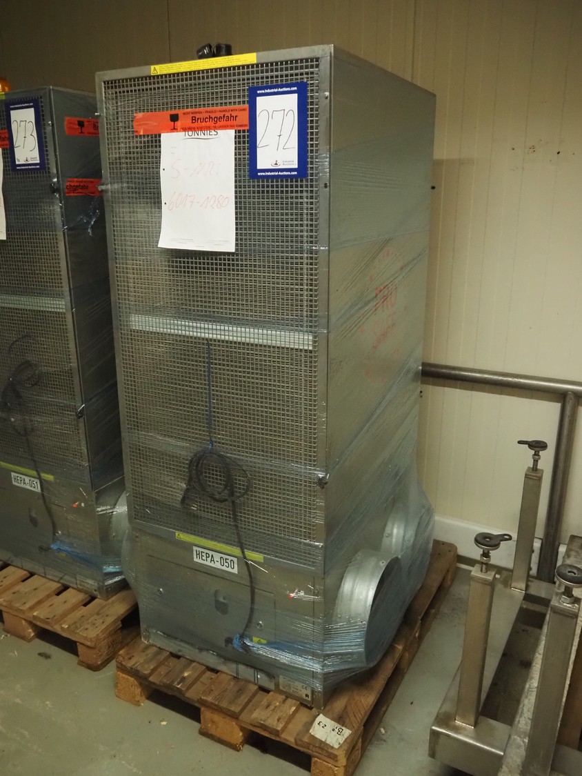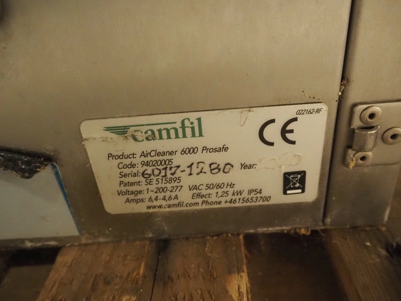 Camfil air filter, type: AirCleaner 6000 Prosafe, serial number: 6017-1280, 200-277 V, 1 Ph, 50/60 Hz, 6.4-4.6 A, 1.25 kW, dimensions: 880 mm x 830 mm x 1700 mm. Never used.
