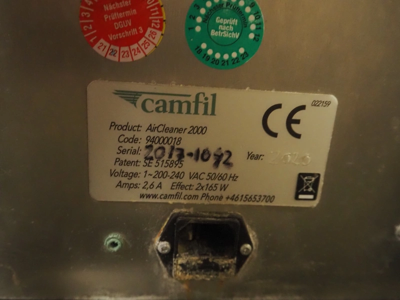 Camfil air filter, type: AirCleaner 2000, serial number: 2017-1092, 200-240 V, 1 Ph, 50/60 Hz, 2.6 A, 710 mm x 260 mm x 830 mm. Never used.