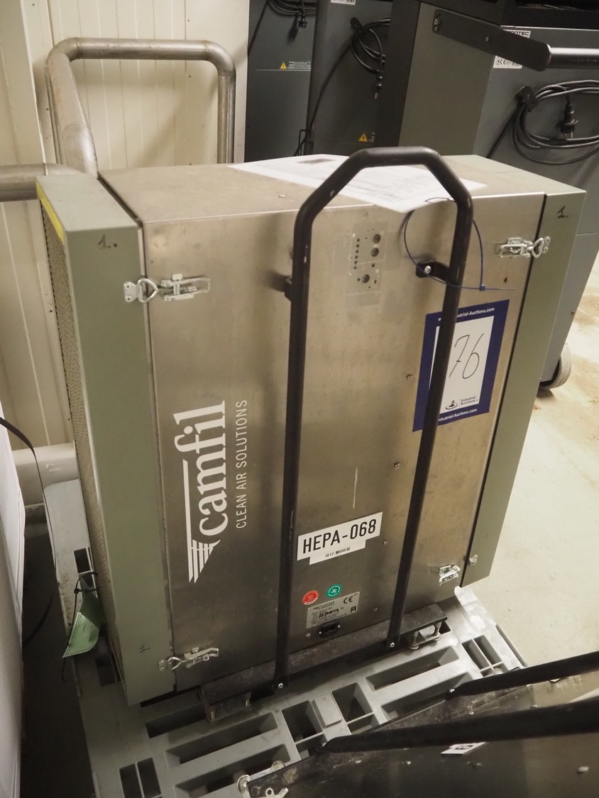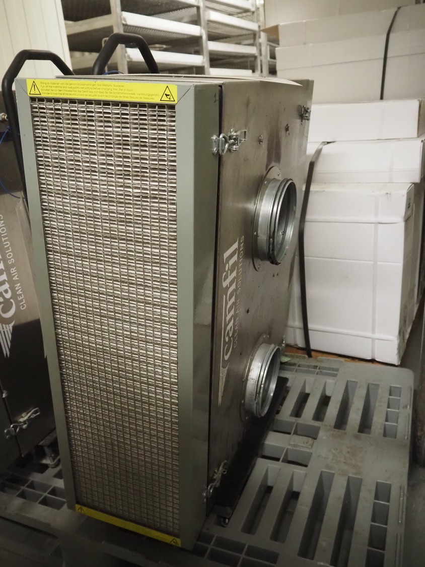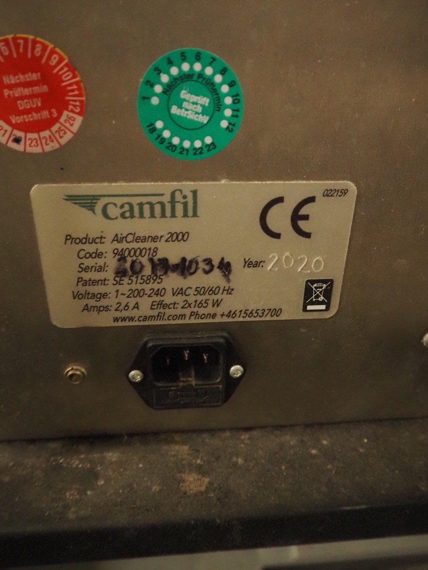 Camfil air filter, type: AirCleaner 2000, serial number: 2017-103, year of construction: 2020, 200-240 V, 1 Ph, 50/60 Hz, 2.6 A, 710 mm x 260 mm x 830 mm. Never used.