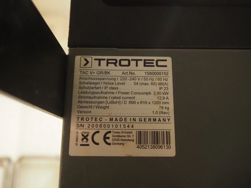 Trotec mobile air filter, type: TAC V+ GR/BK, 220-240 V, 50/60 Hz, 12.9 A, 2.95 kW, dimensions: 690 mm x 610 mm x 1300 mm. Never used.