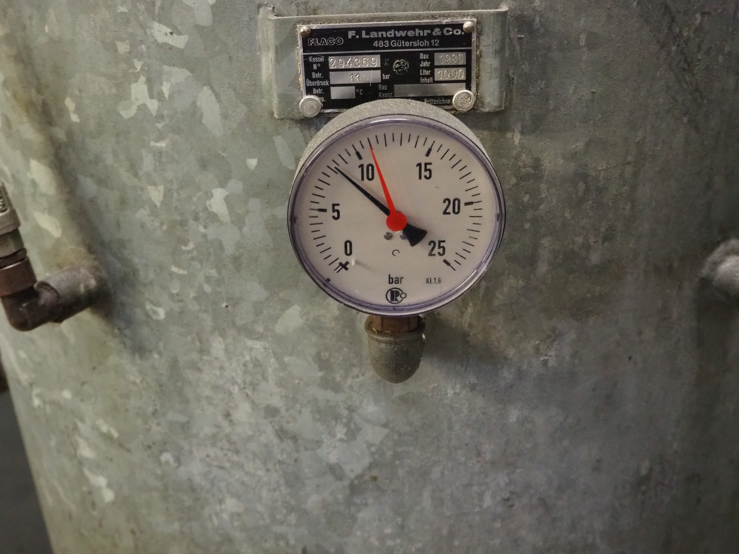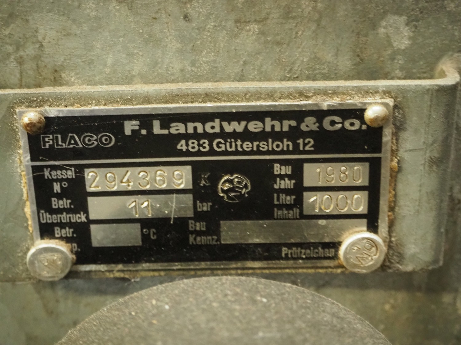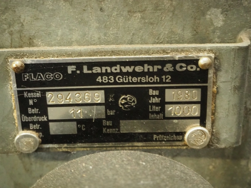 Flaco steel pressure vessel, number: 294369, year of construction: 1980, volume: 1000 liter, dimensions: Ø 800 mm x 2250 mm.