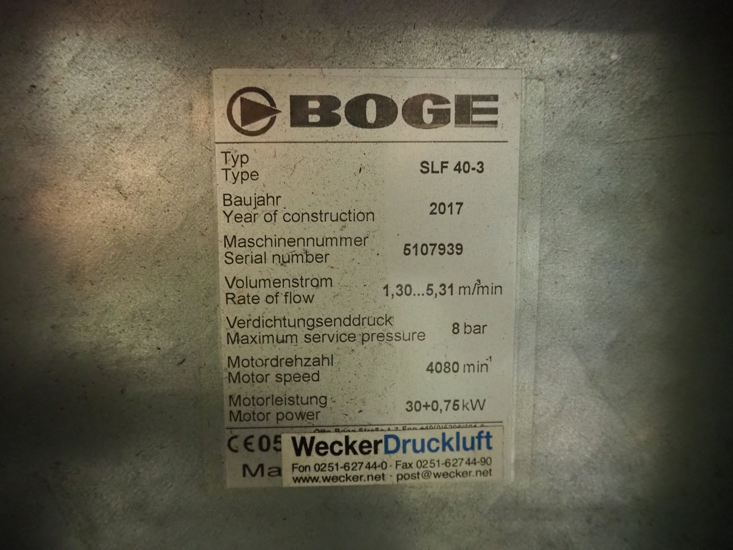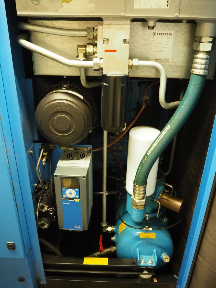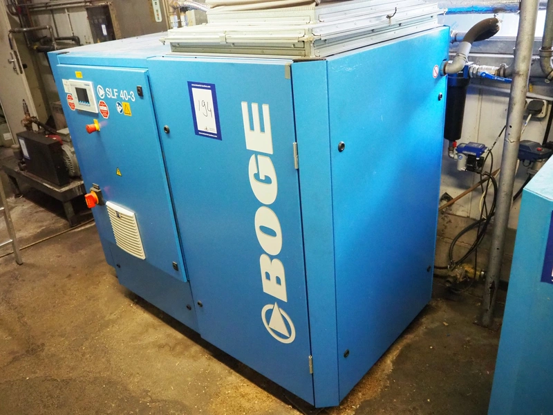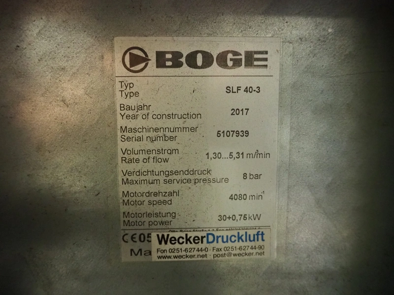 Boge screw compressor, type: SLF 40-3, serial number: 5107939, year of construction: 2017, 30+0.75 kW, motor speed: 4080 RPM, 8 bar, dimensions: 1850 mm x 1000 mm x 1450 mm.