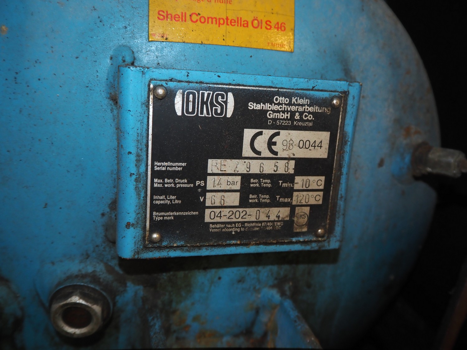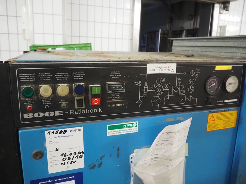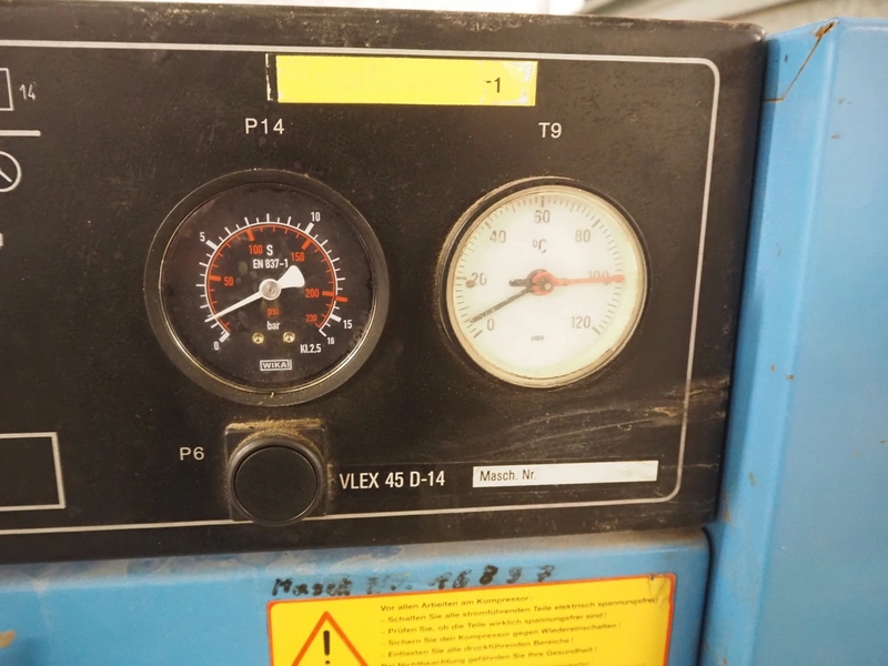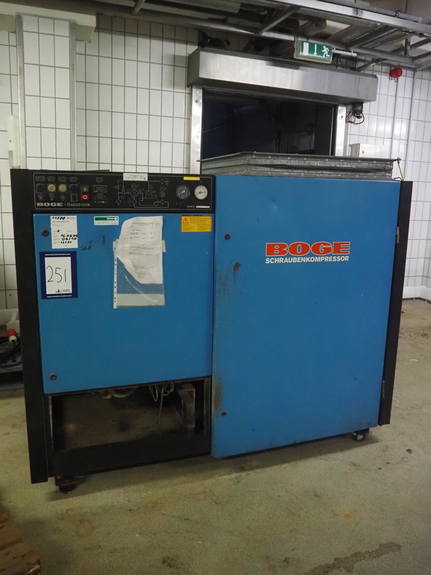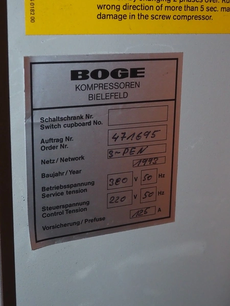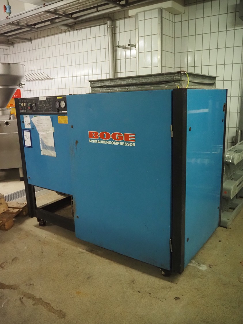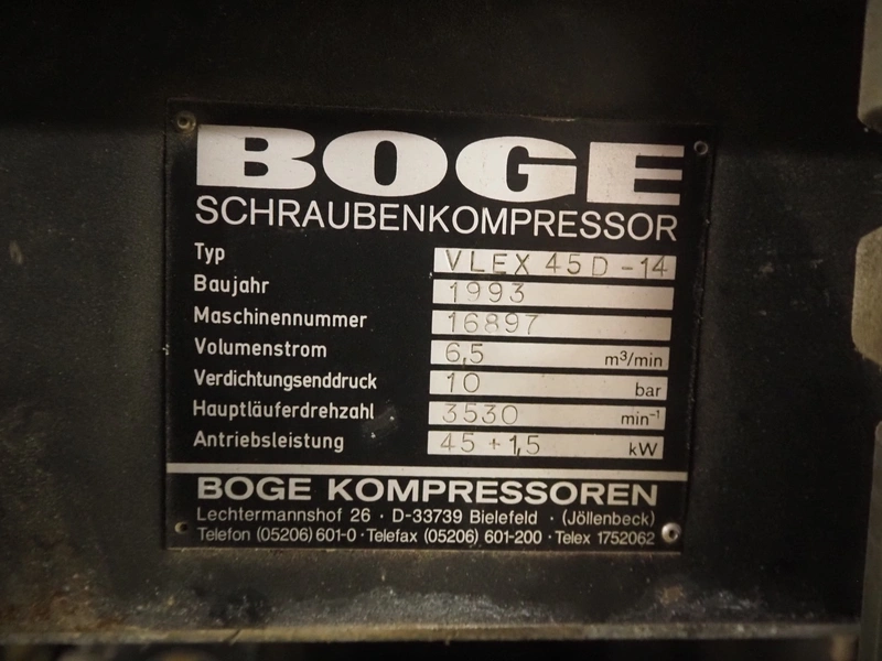 Boge screw compressor, type: VLEX 45D-14, machine number: 16897, year of construction: 1993, 380/220 V, 3 Ph, 50 Hz, 125 A, capacity: 6.5 m³ per hour, dimensions: 1900 mm x 1000 mm x 1430 mm.
