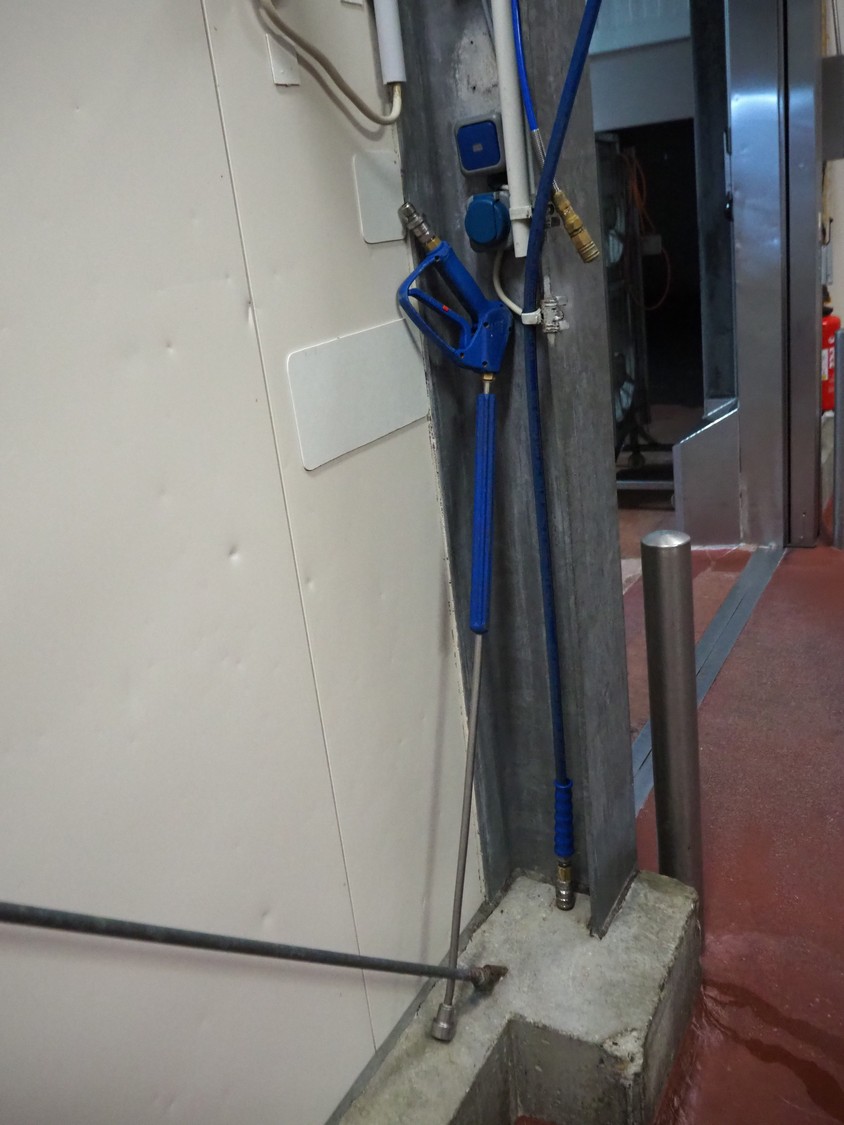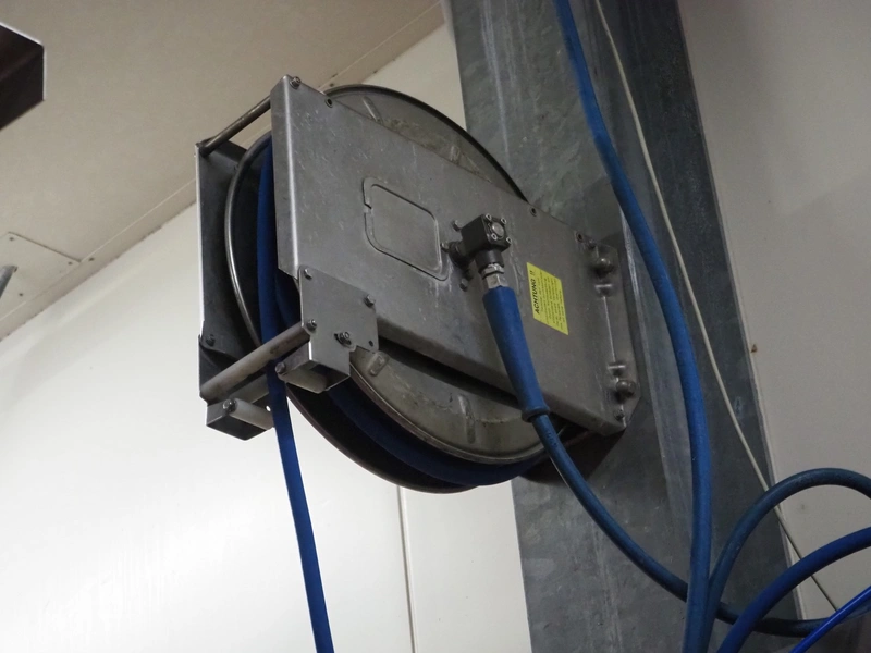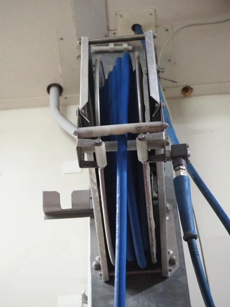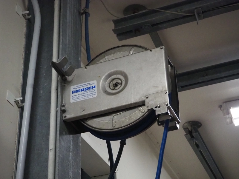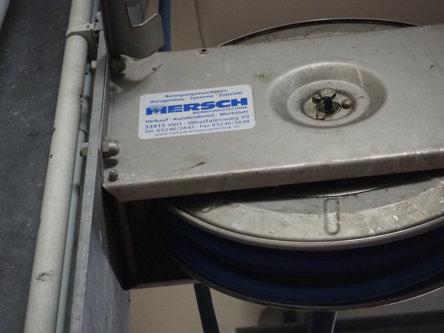 Theodor Henrichs GmbH hose reel with hose and pistol, dimensions: 460 mm x 250 mm x 400 mm.