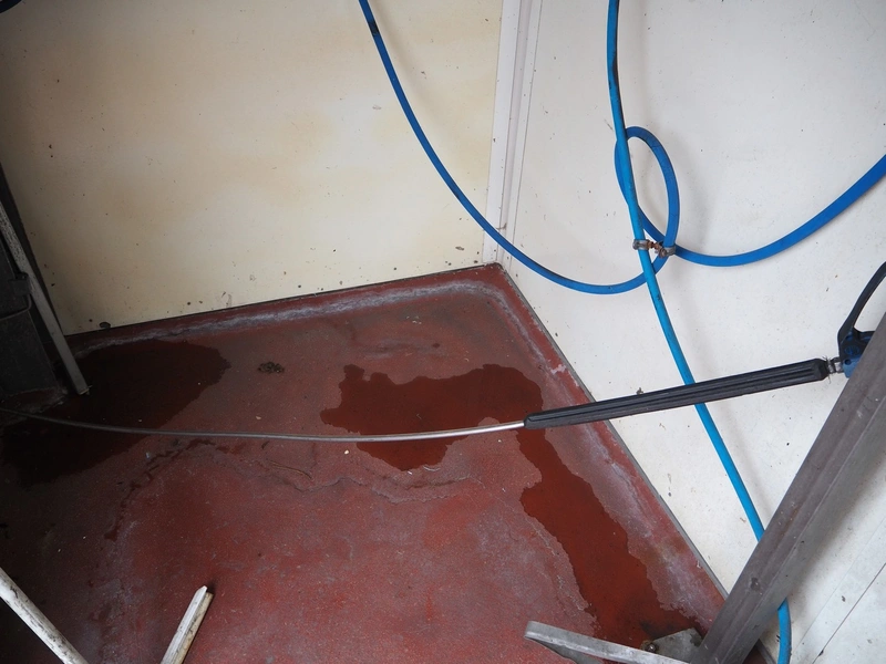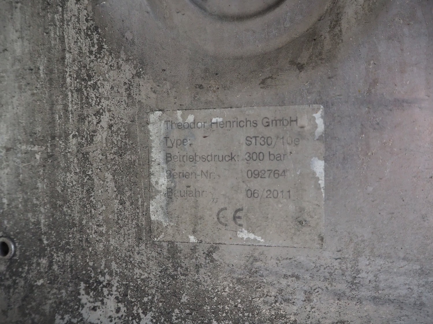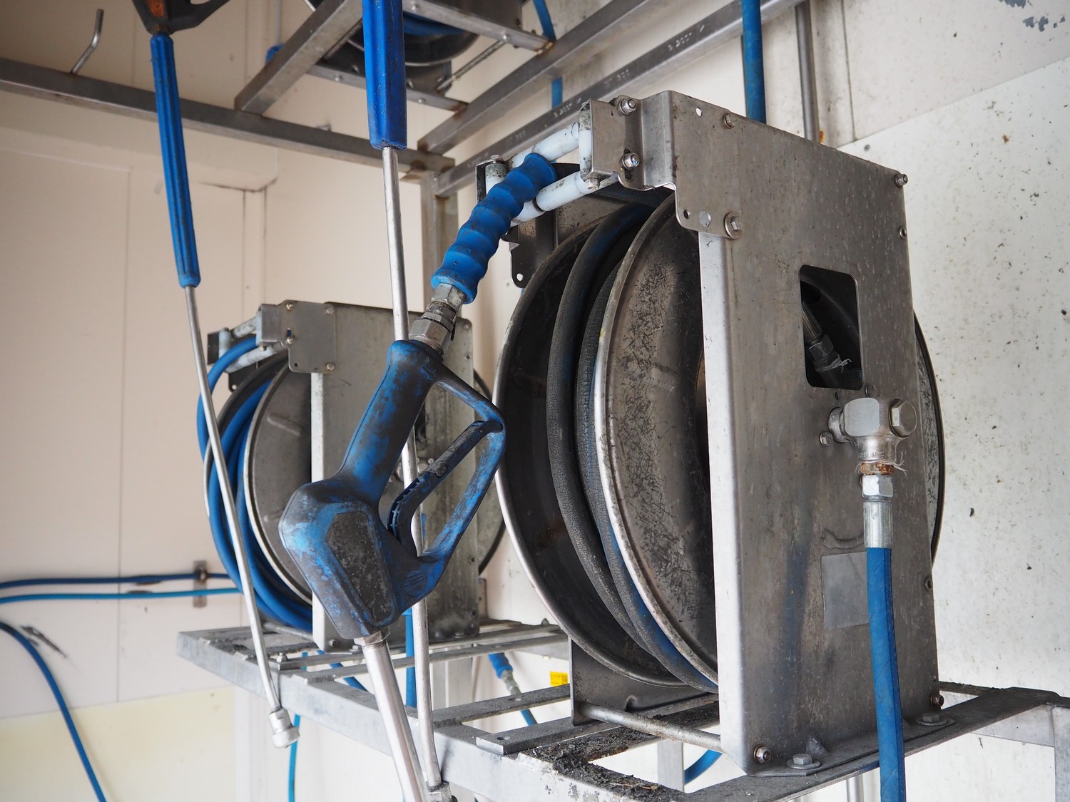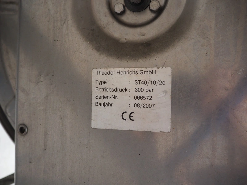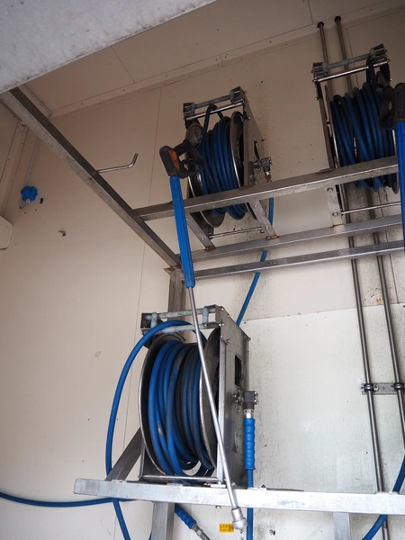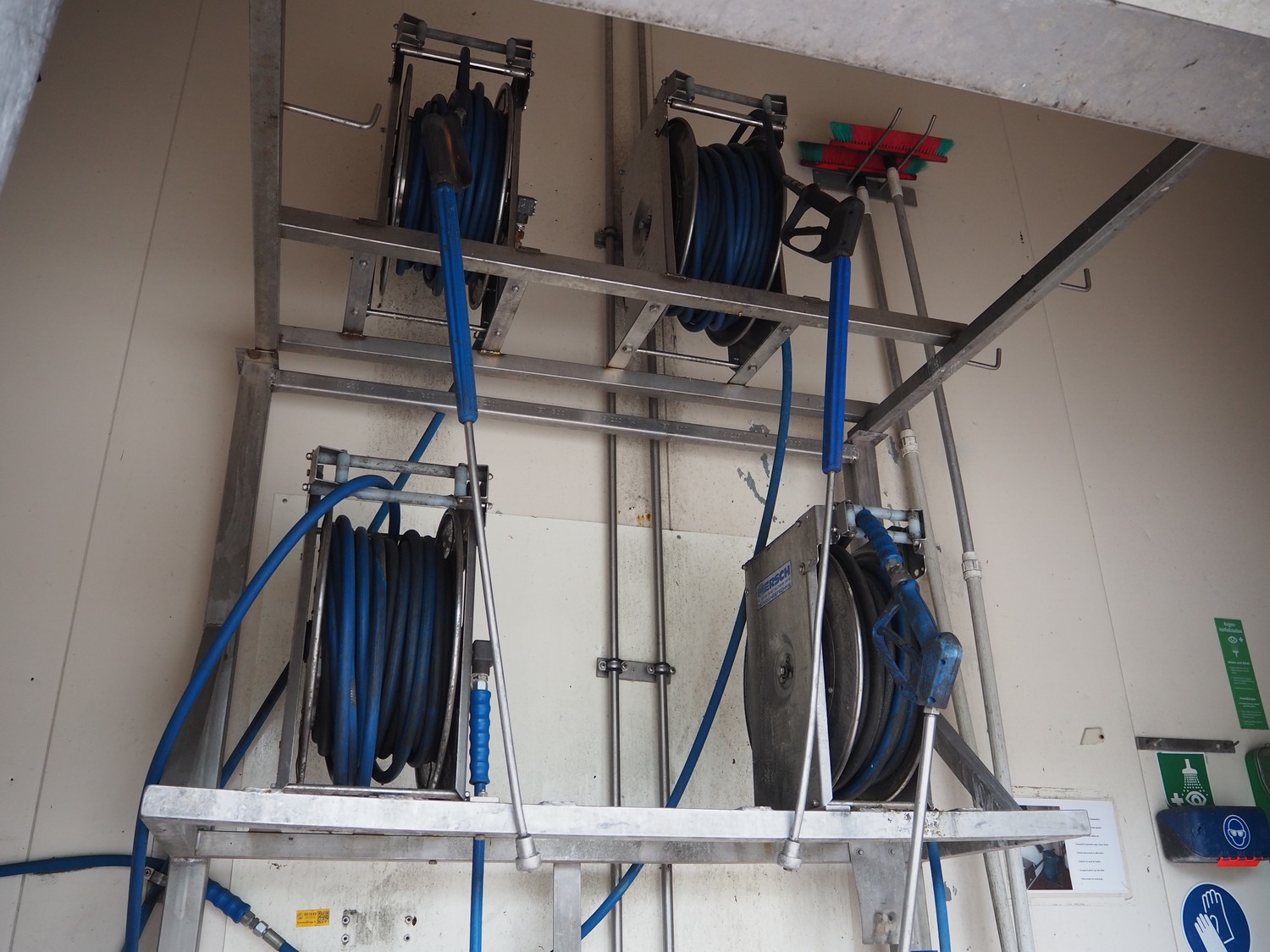 S/s frame with 4 Theodor Henrichs GmbH hose reels with hose and pistol, type: ST40/10/2e / ST30/10e, total dimensions: 1400 mm x 550 mm x 2900 mm.
