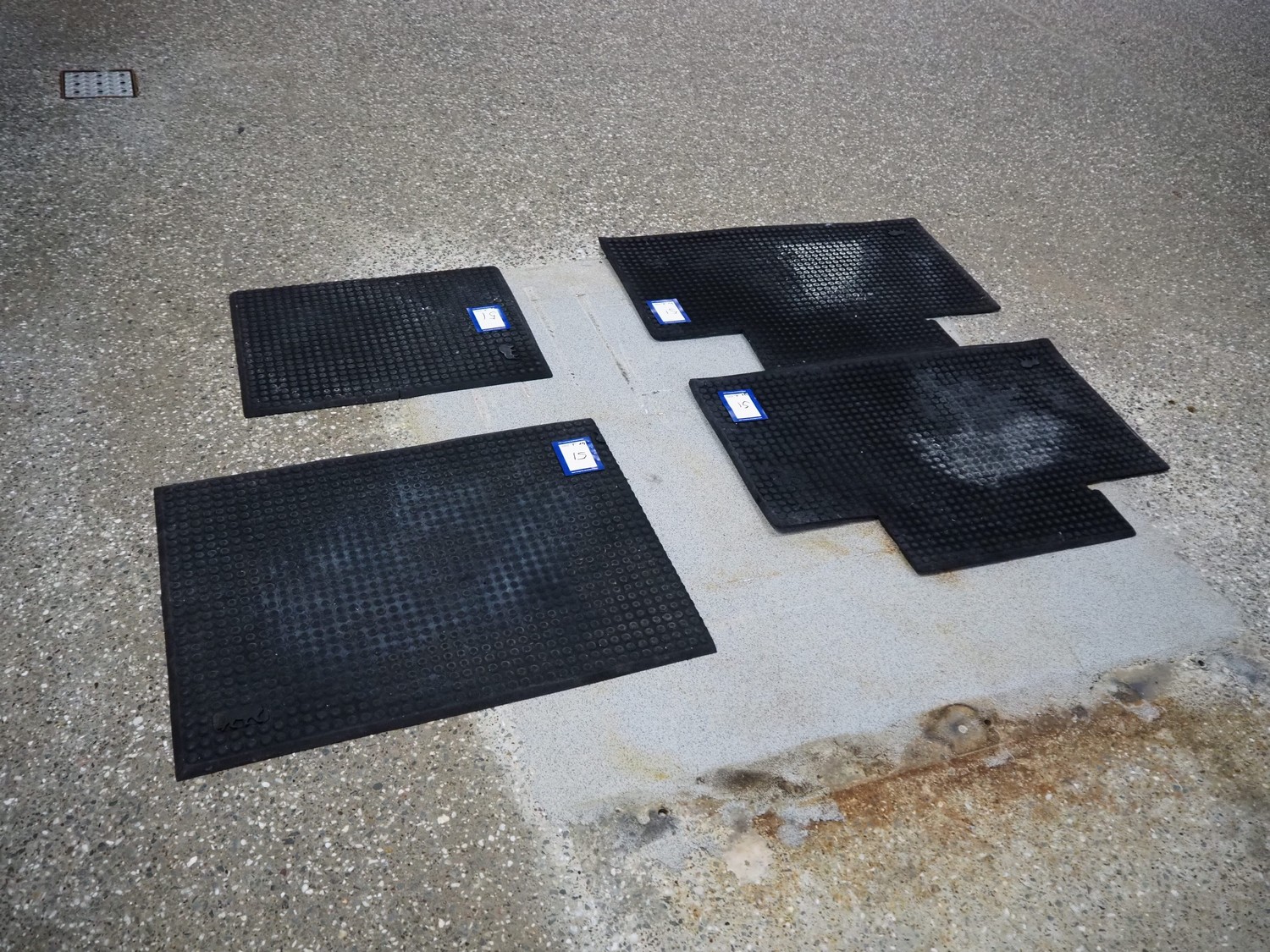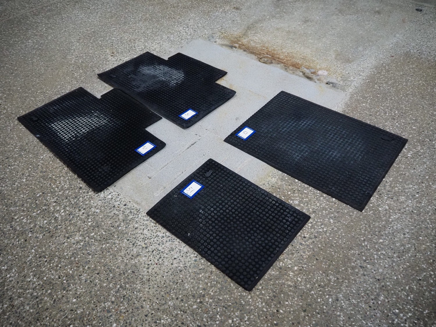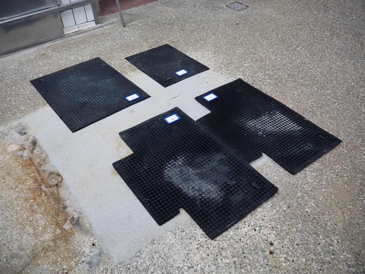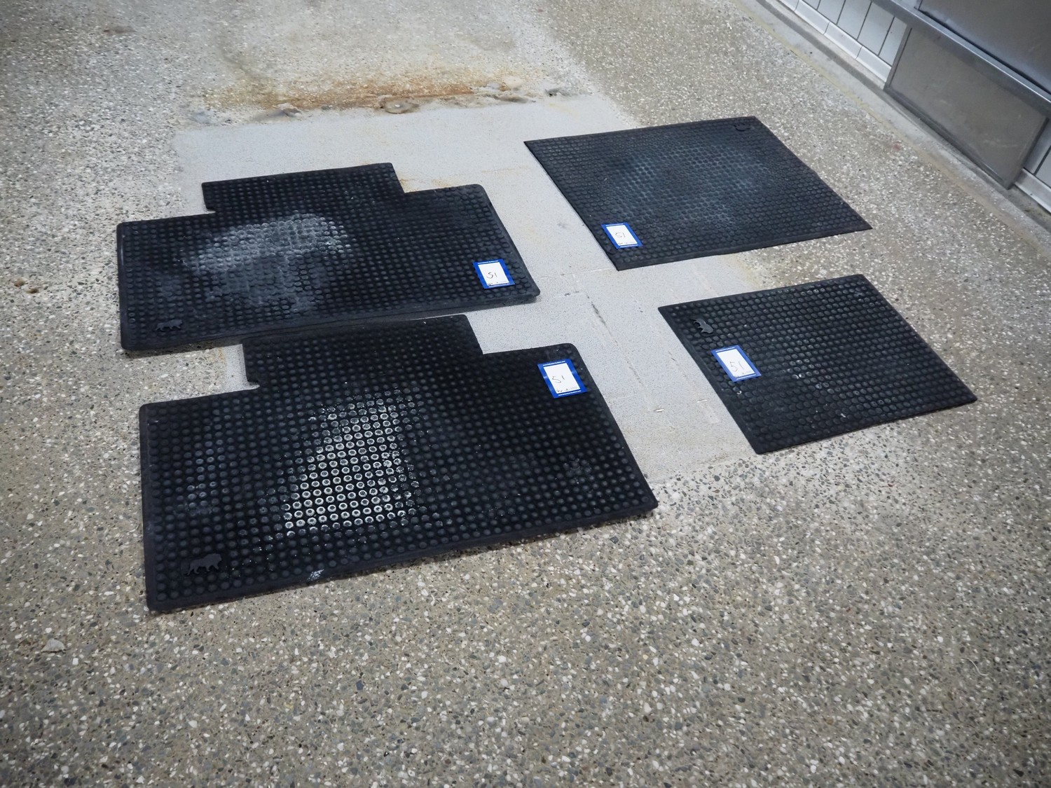 4 rubber floors mats, dimensions: (3x) 900 mm x 600 mm, (1x) 600 mm x 440 mm.