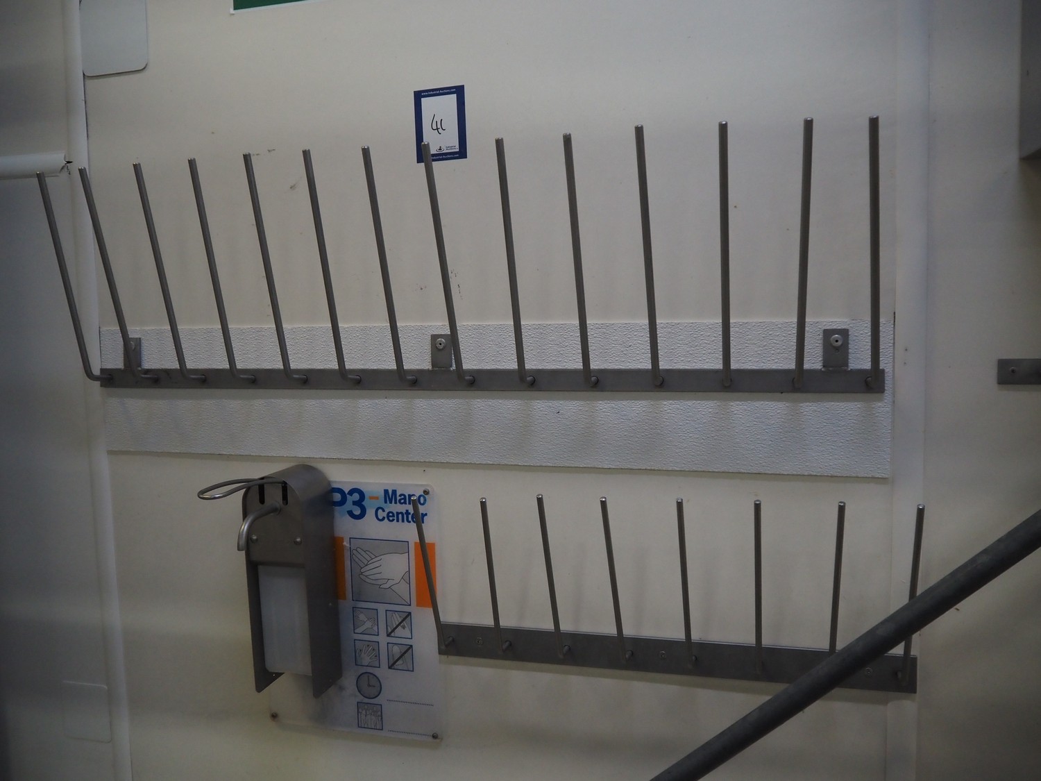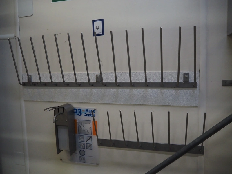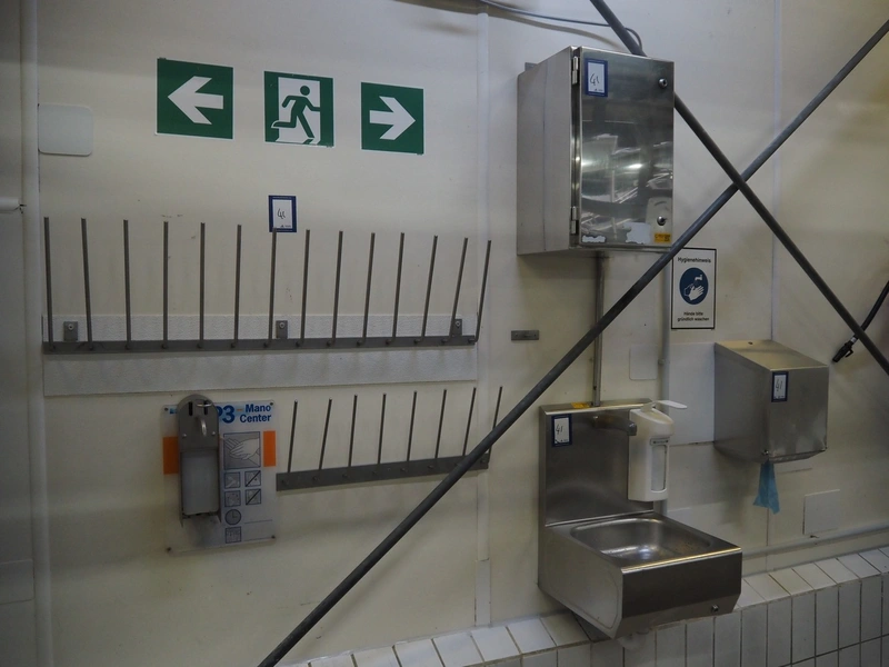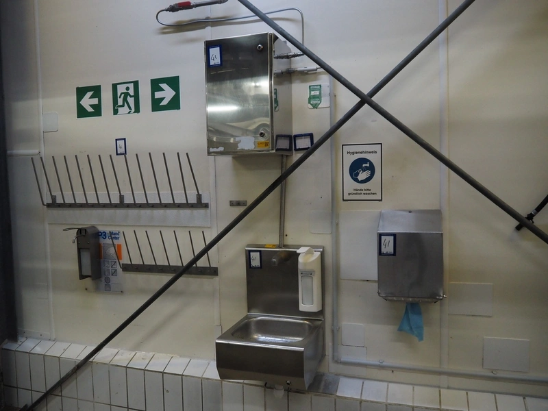 Hygiene equipment consisting of: s/s sink, dimensions: 430 mm x 430 mm x 600 mm, paper dispenser, dimensions: 300 mm x 250 mm x 400 mm, s/s cabinet with boiler, dimensions: 340 mm x 340 mm x 560 mm, 2 s/s pegs, length: 1050 mm and 600 mm.