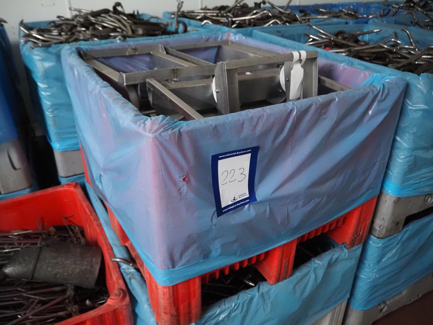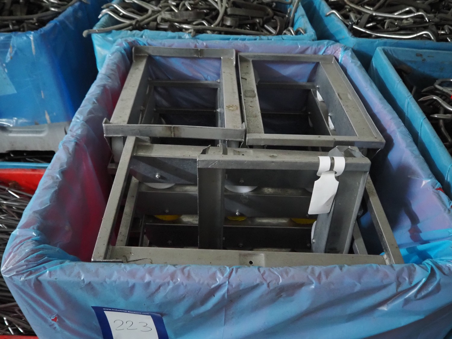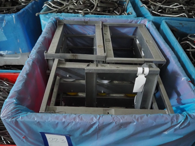 Plastic pallet box with approximately 20 s/s rollies, dimensions each rollie: 620 mm x 410 mm x 200 mm, total dimensions: 1200 mm x 1000 mm x 700 mm.