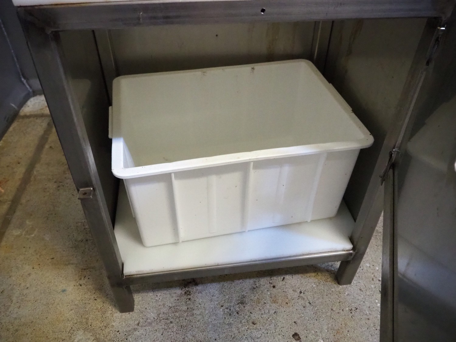 S/s cabinet with plastic top, dimensions: 530 mm x 420 mm x 640 mm.