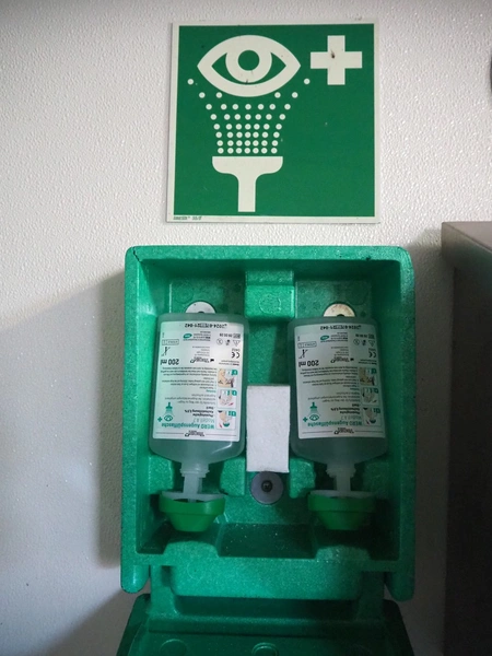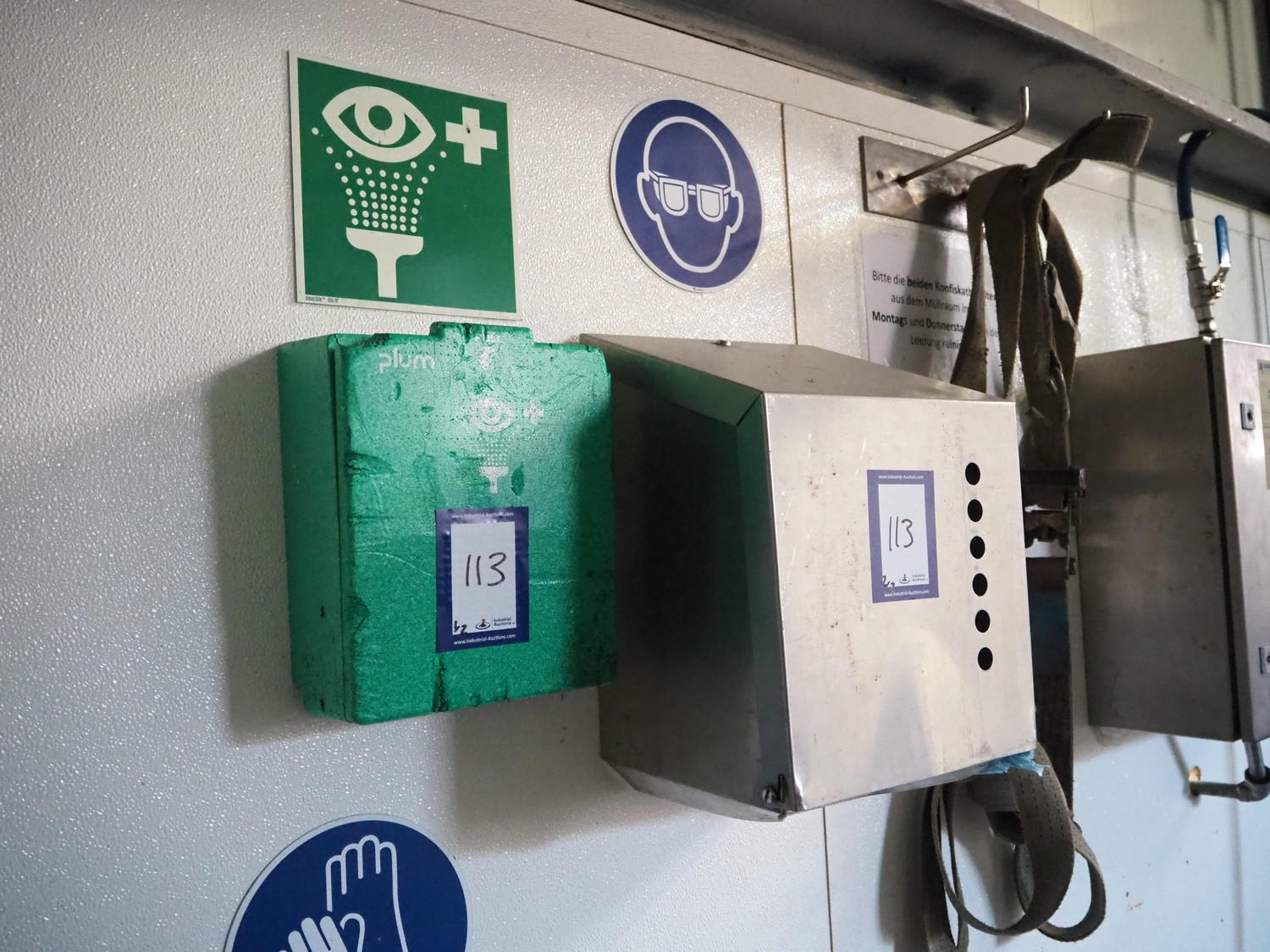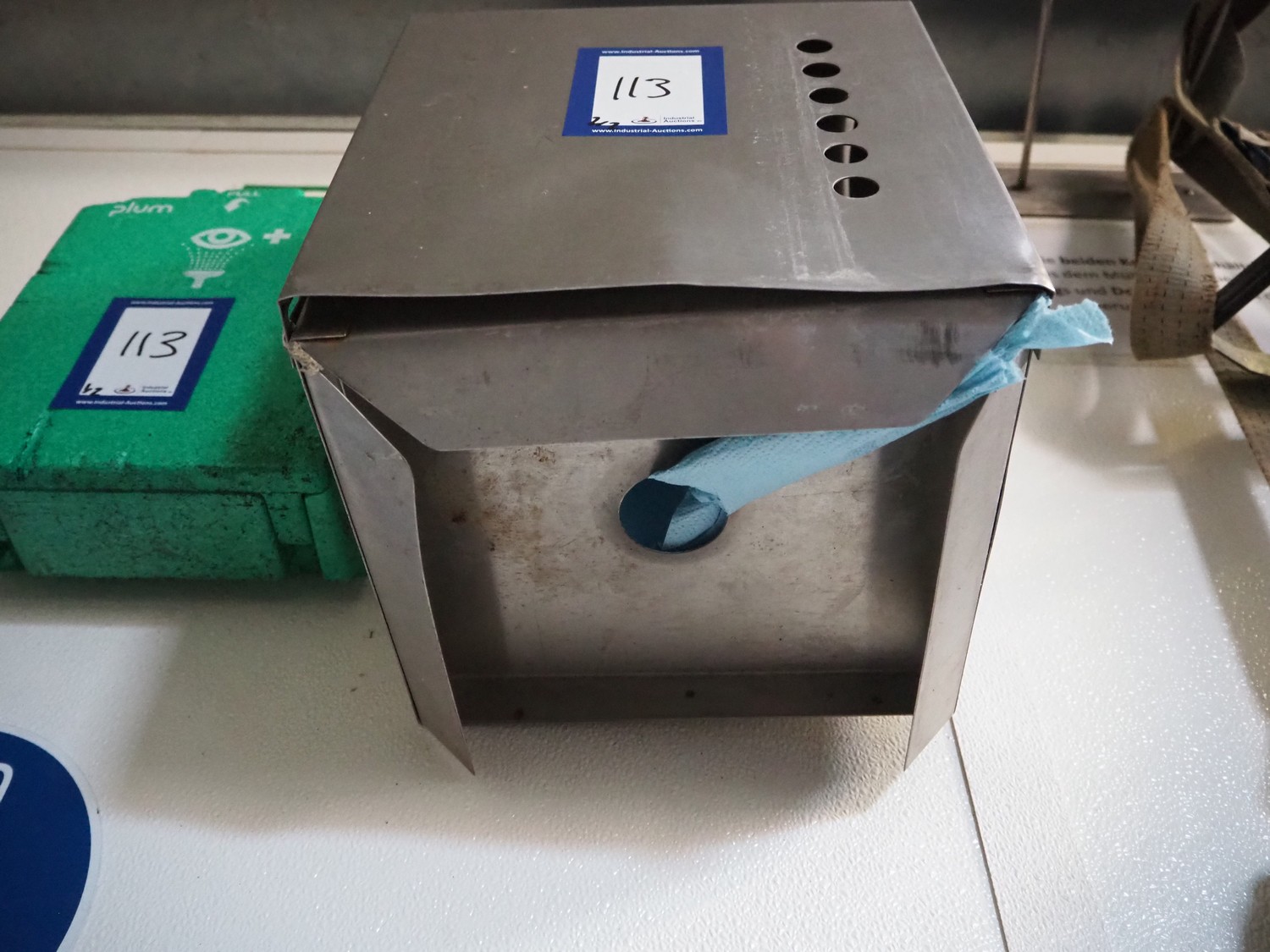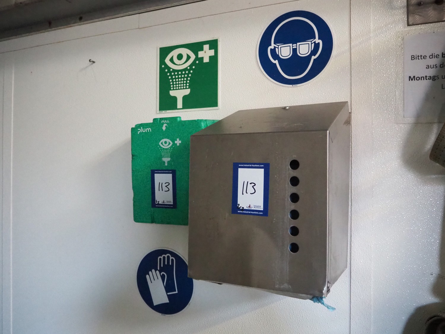 Plum eye shower, dimensions: 230 mm x 100 mm x 300 mm, with s/s paper dispenser, dimensions: 300 mm x 260 mm x 400 mm.