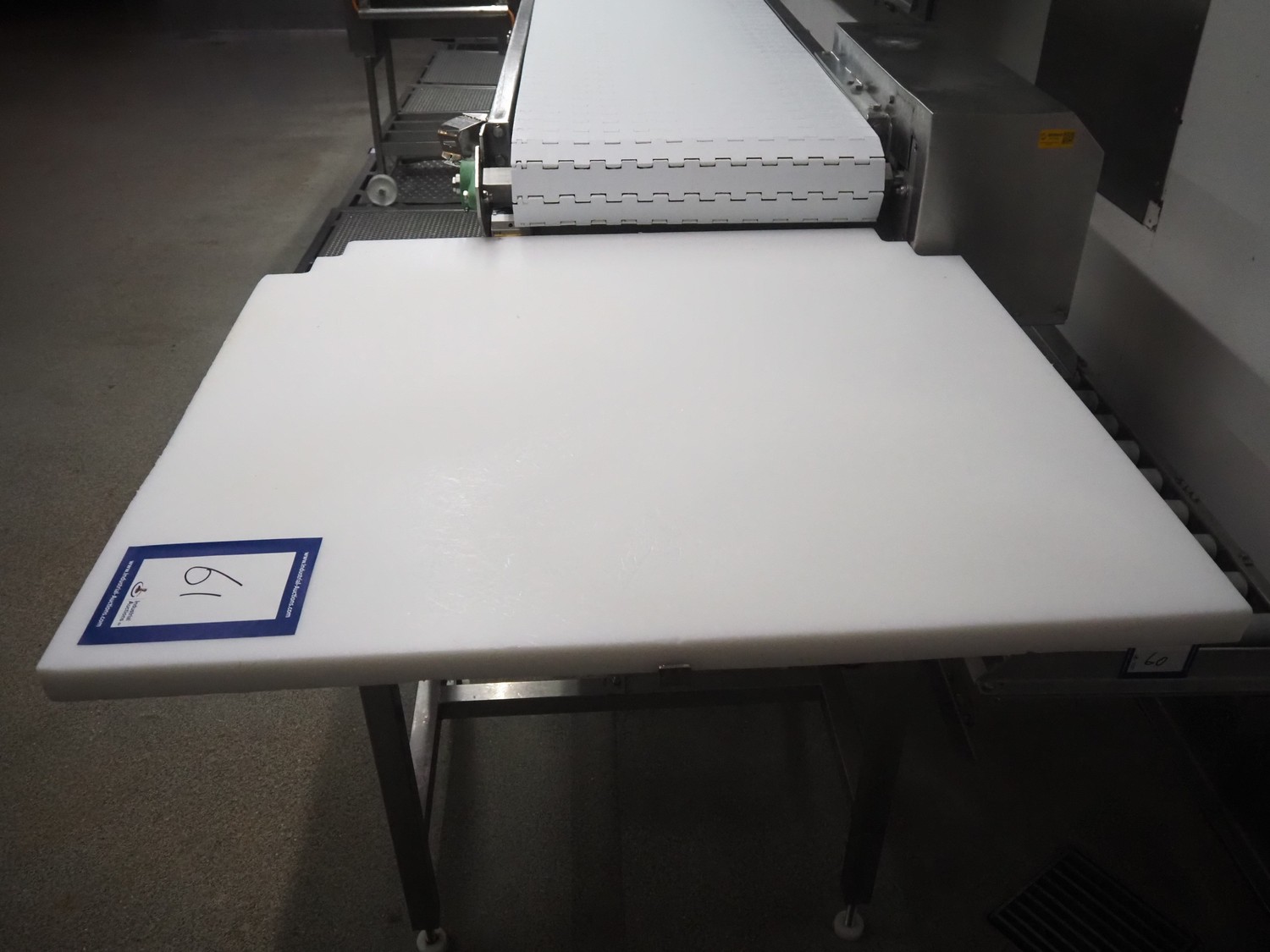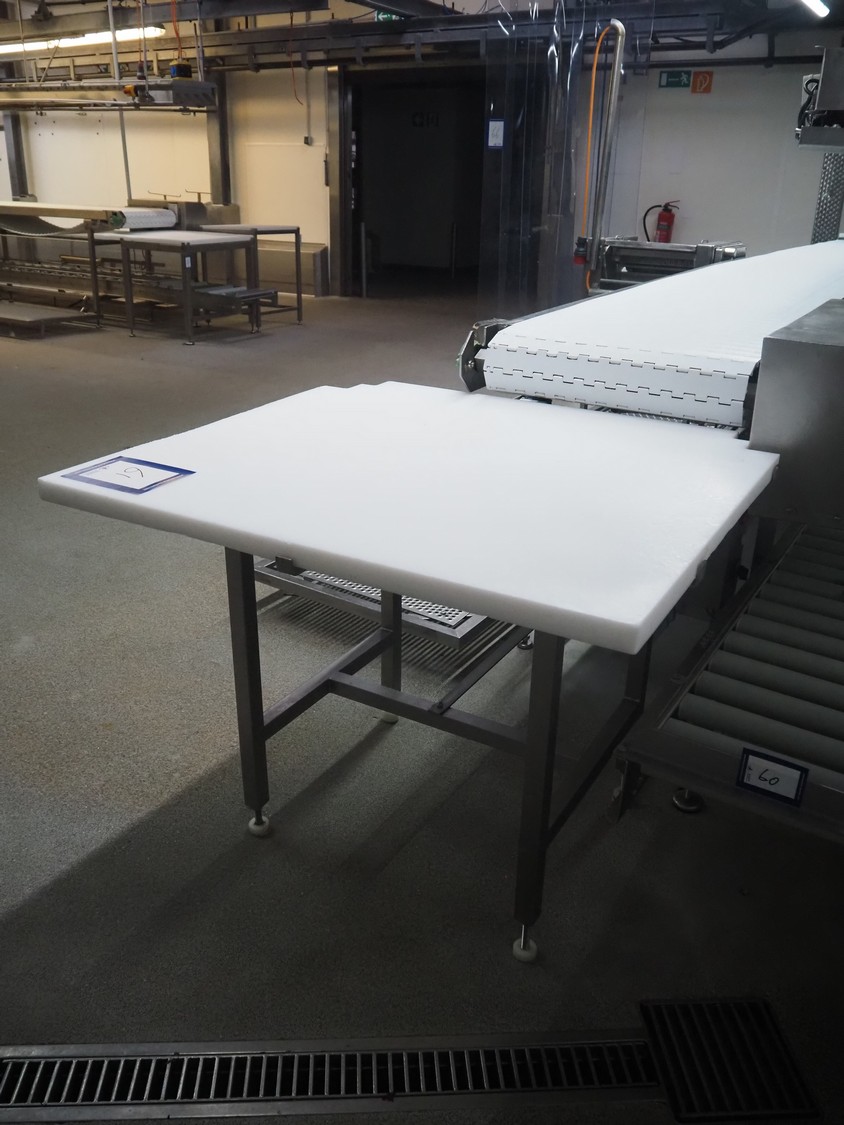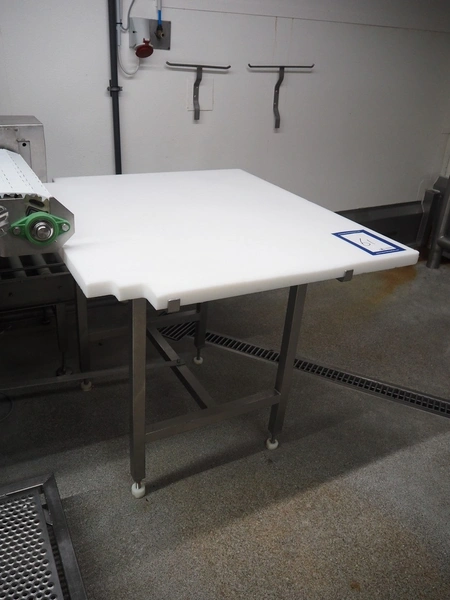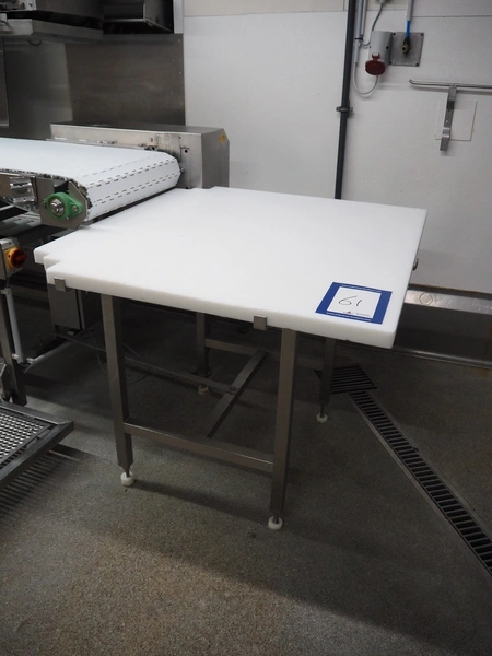 S/s table with plastic top, dimensions: 1100 mm x 1000 mm x 900 mm.