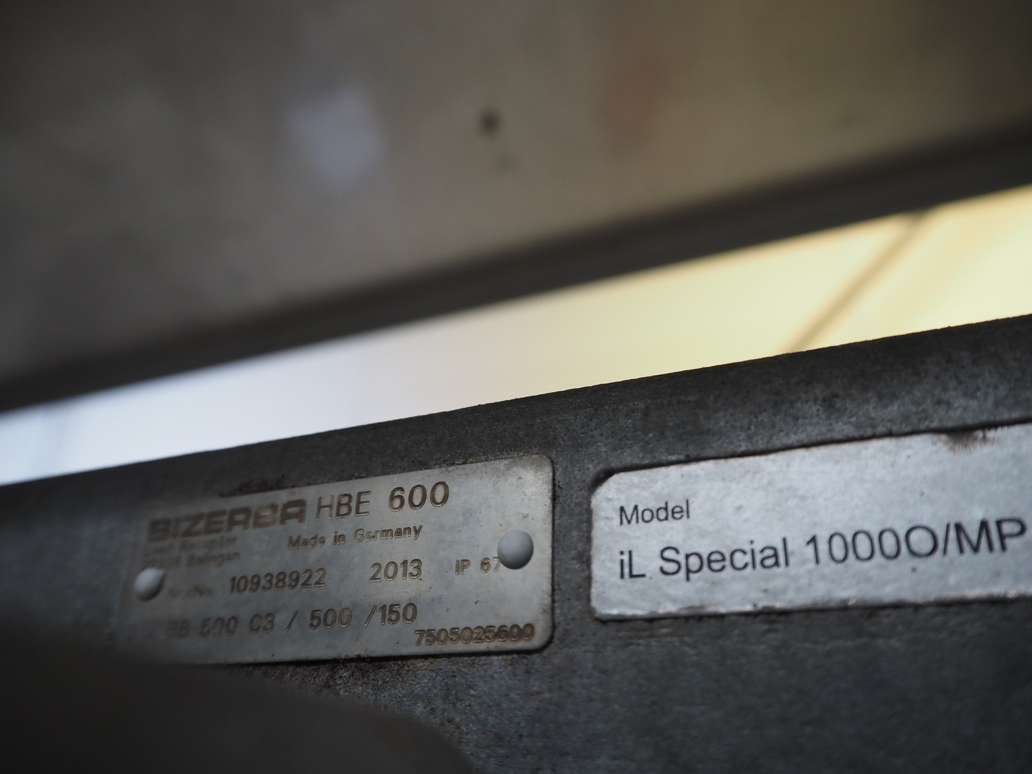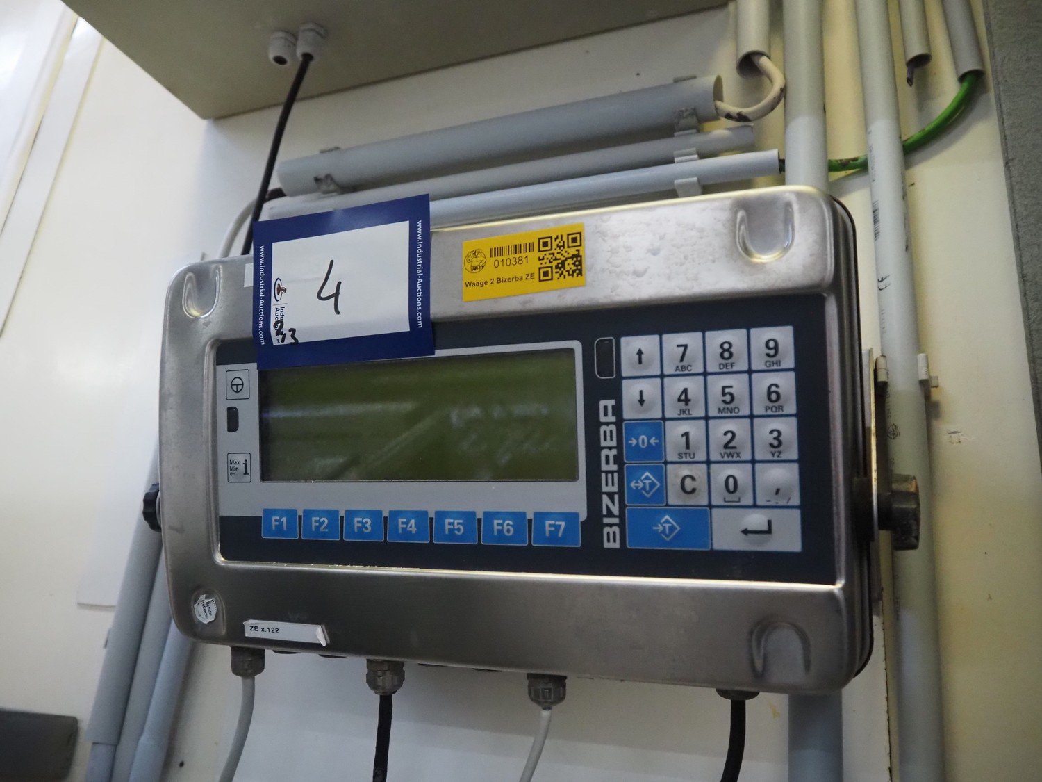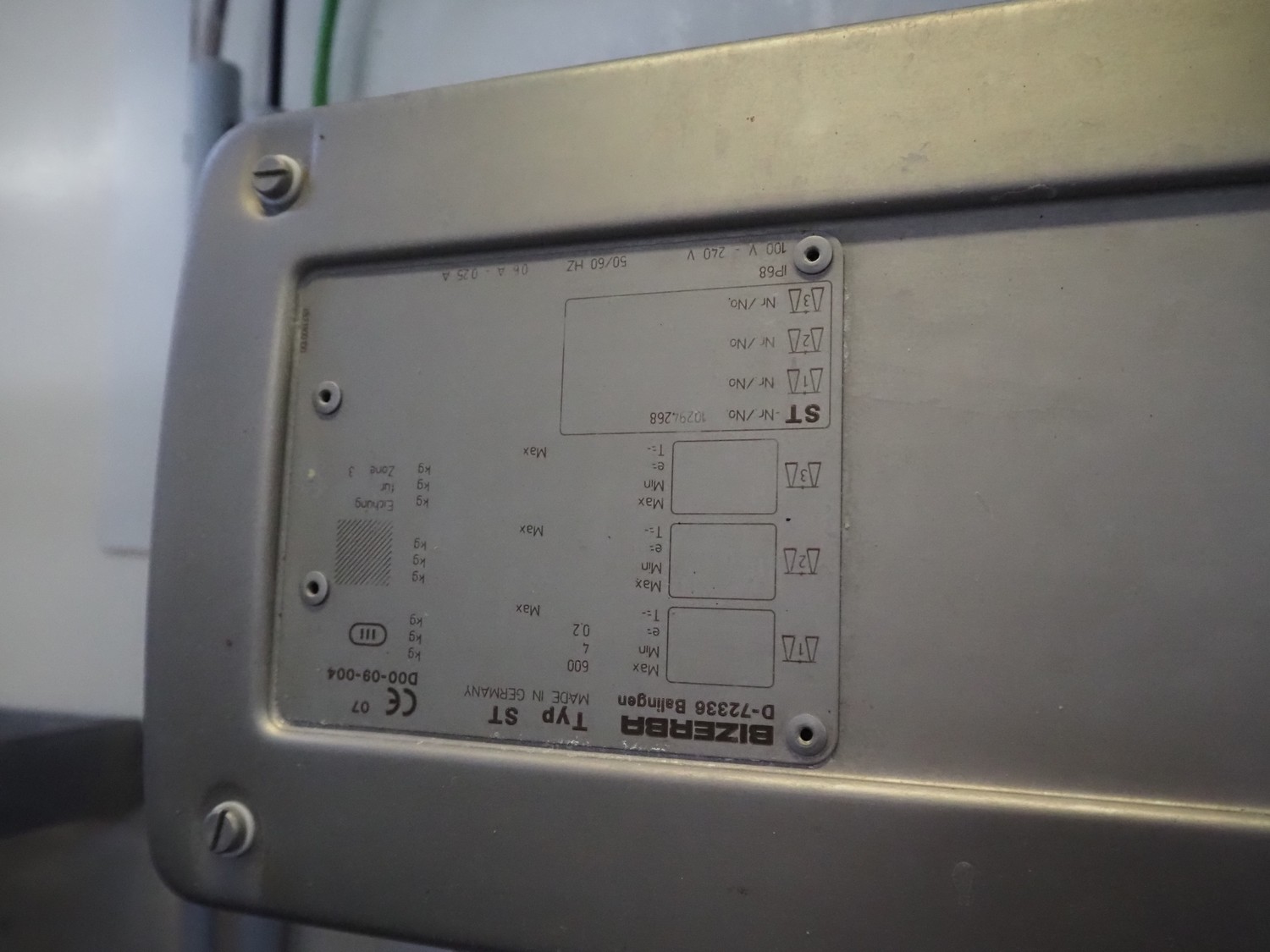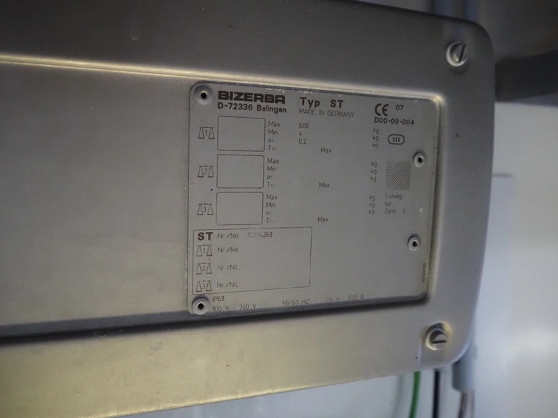 Bizerba tube rail weighing scale with indicator, type: HBE 600, number: 10938922, year of construction: 2013, 100-240 V, 50/60 Hz, 0.6-0.25 A, maximum weight: 600 kg, minimum weight: 4 kg, e= 0.2 kg, dimensions: 1000 mm x 250 mm x 140 mm.