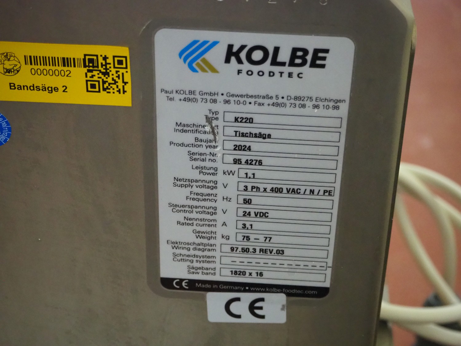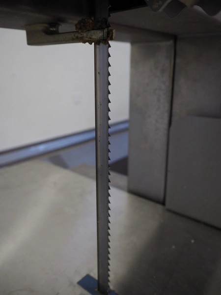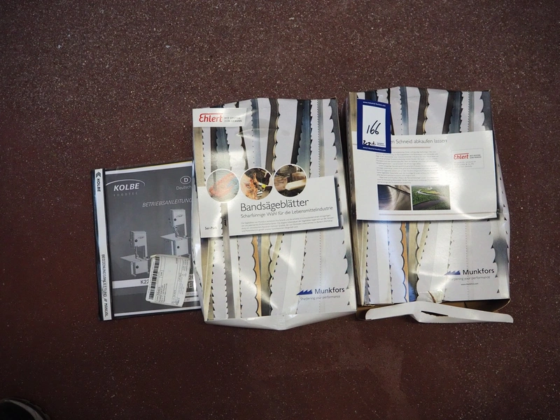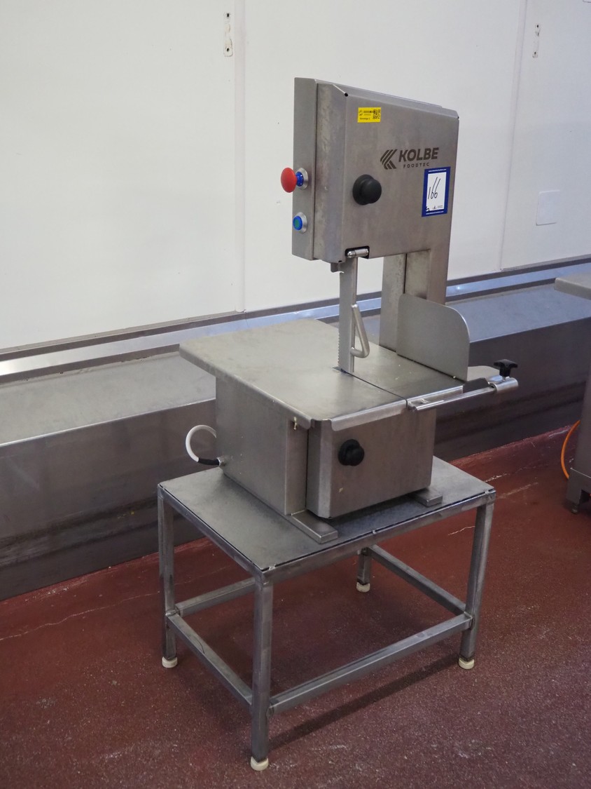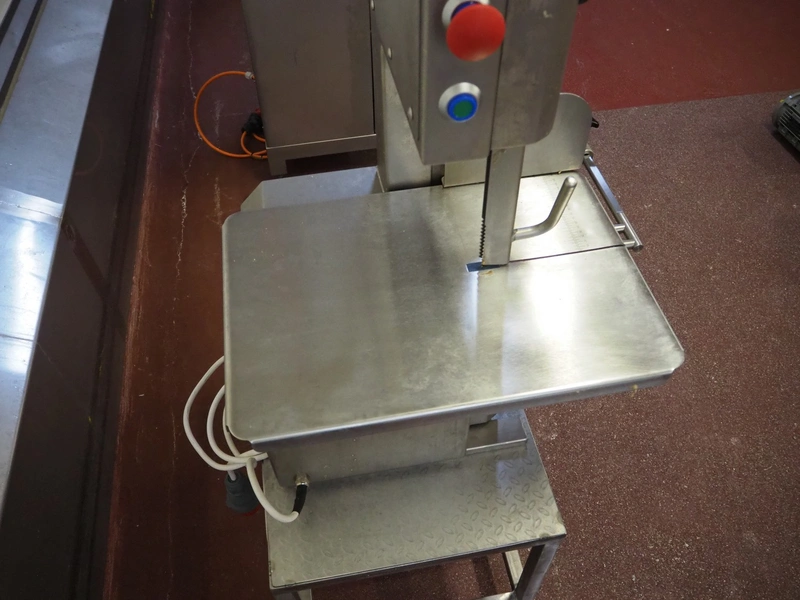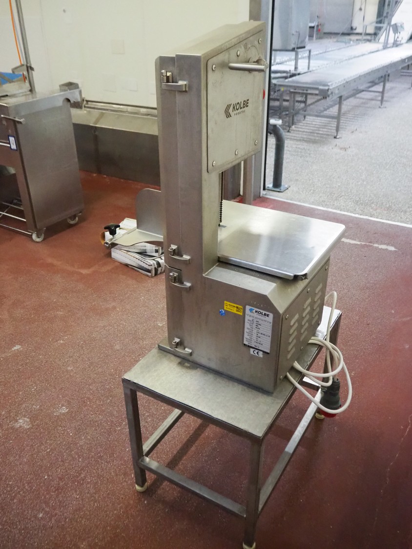 Kolbe bandsaw on s/s table, type: K220, serial number: 95 4276, year of construction: 2024, 400 V, 3 Ph, 50 Hz, 3.1 A, 1.1 kW, dimensions: 700 mm x 470 mm x 1500 mm. Including extra saw blades.
